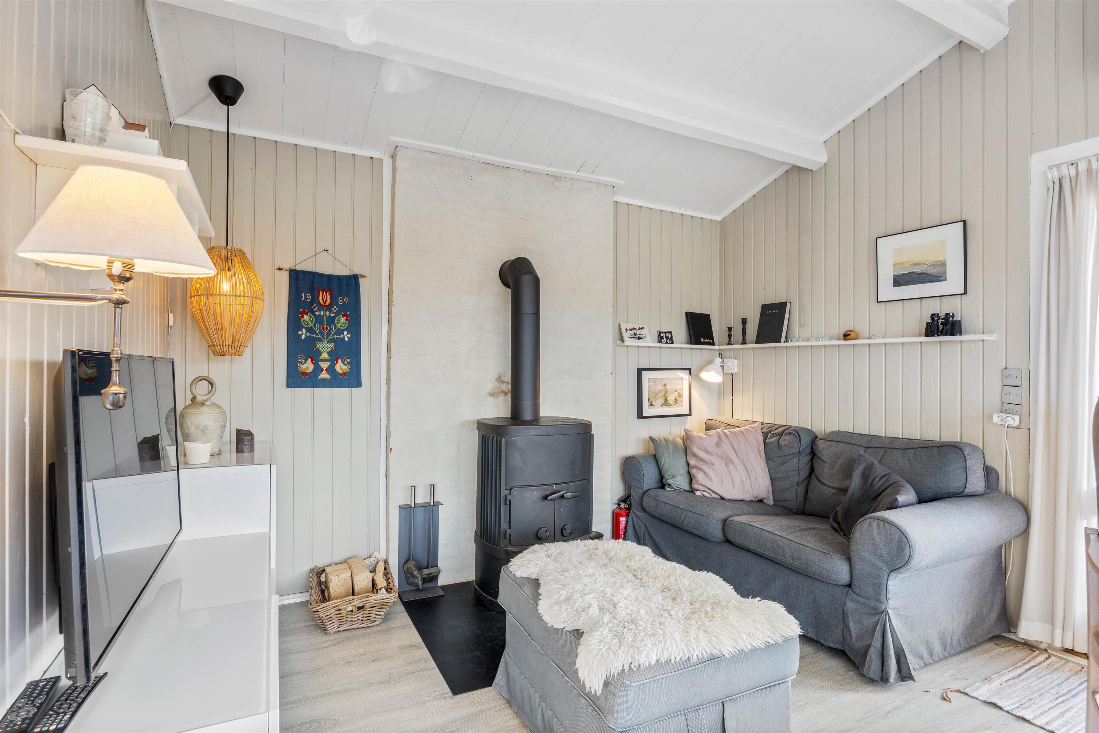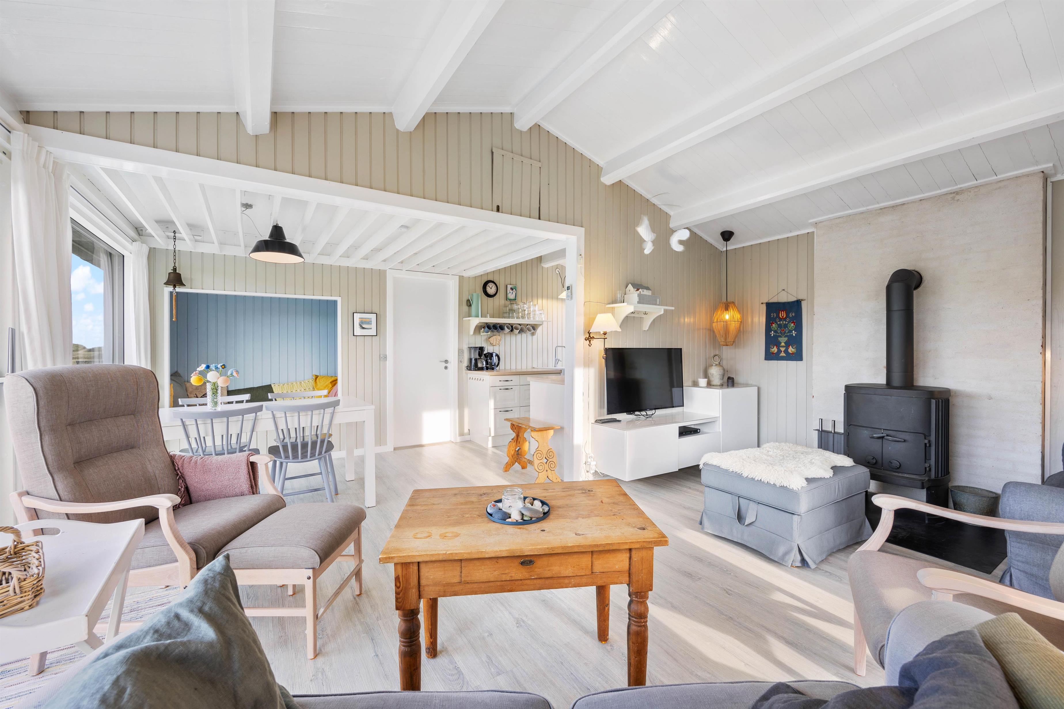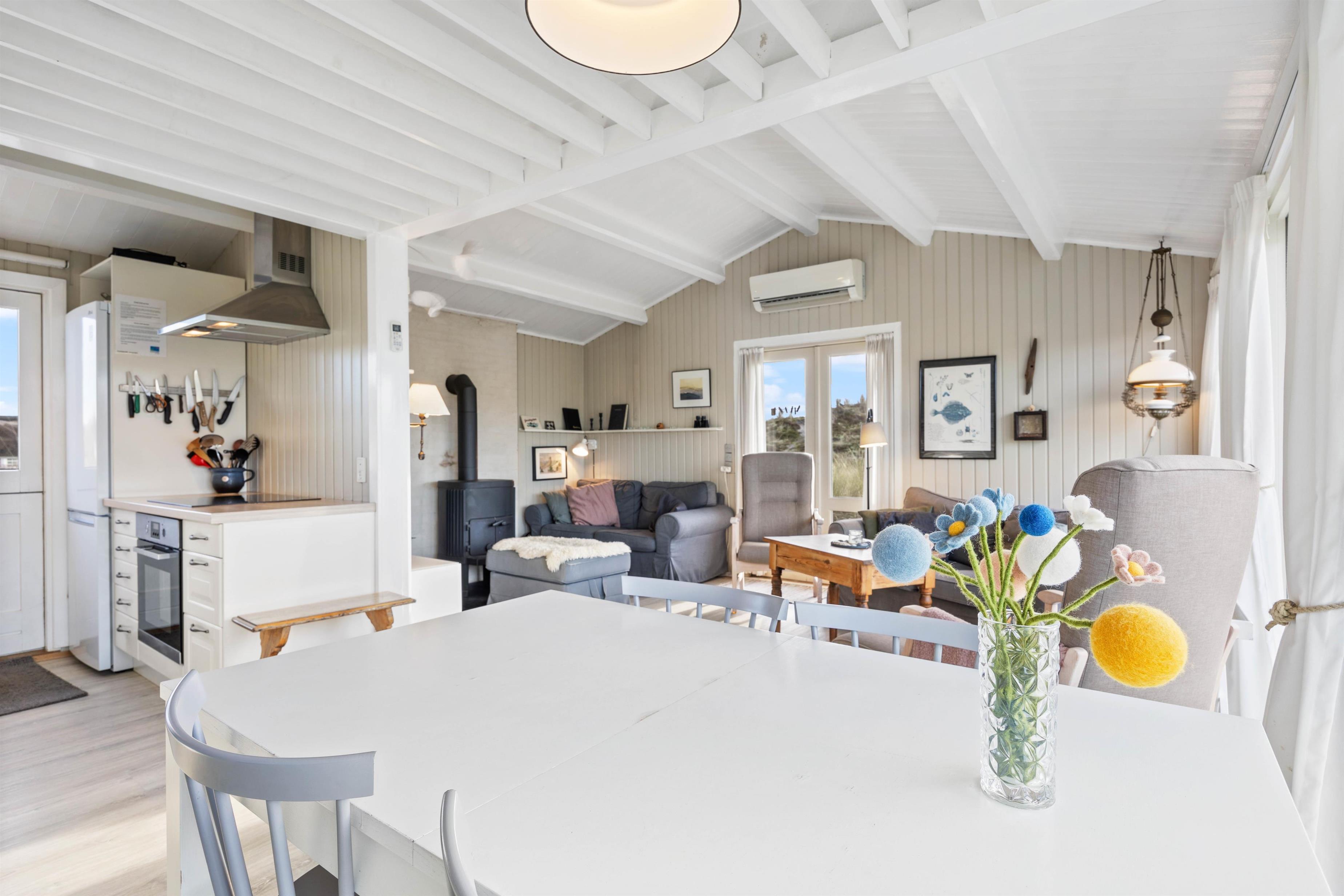 De fritlagte bjælker i alrummet giver karakter og en fornemmelse af rummelighed til indretningen. Det forstærkes yderligere af de lyse vægge, gulve og møbler, der skaber en let og luftig atmosfære og skaber desuden en følelse af varme og nærvær. I sommerhuset er der både brændeovn og varmepumpe, så I kan holde en behagelig temperatur.