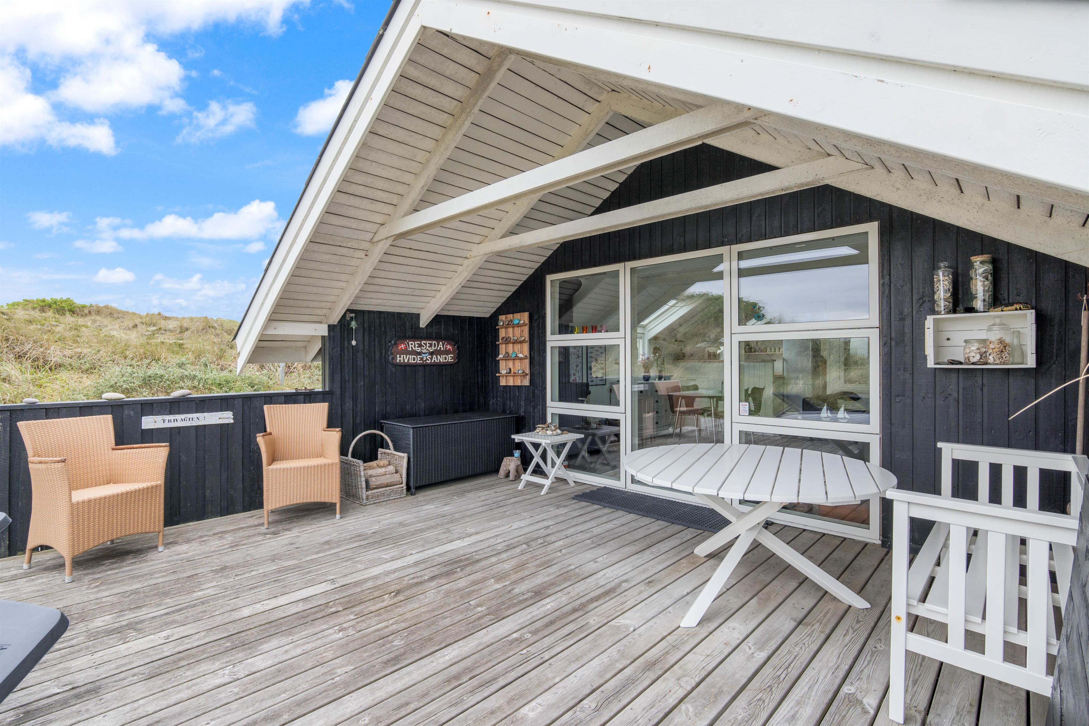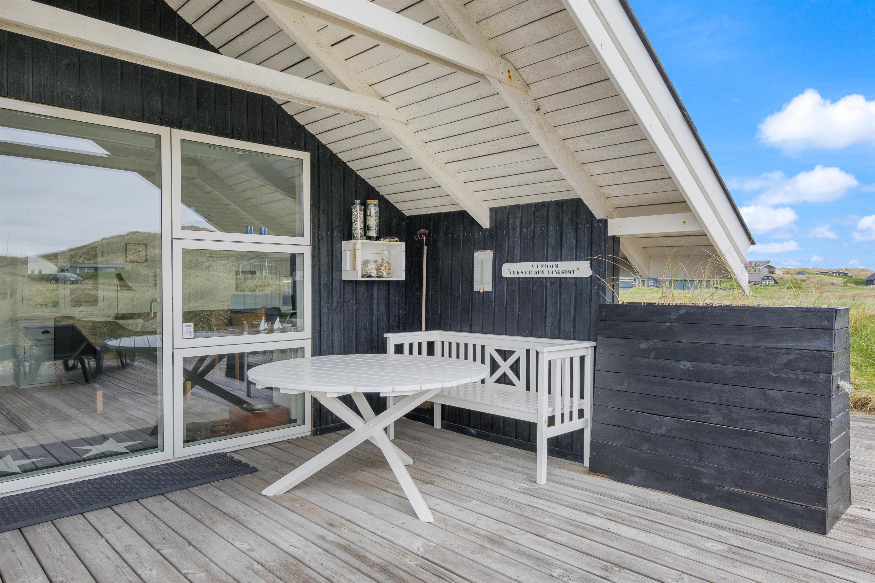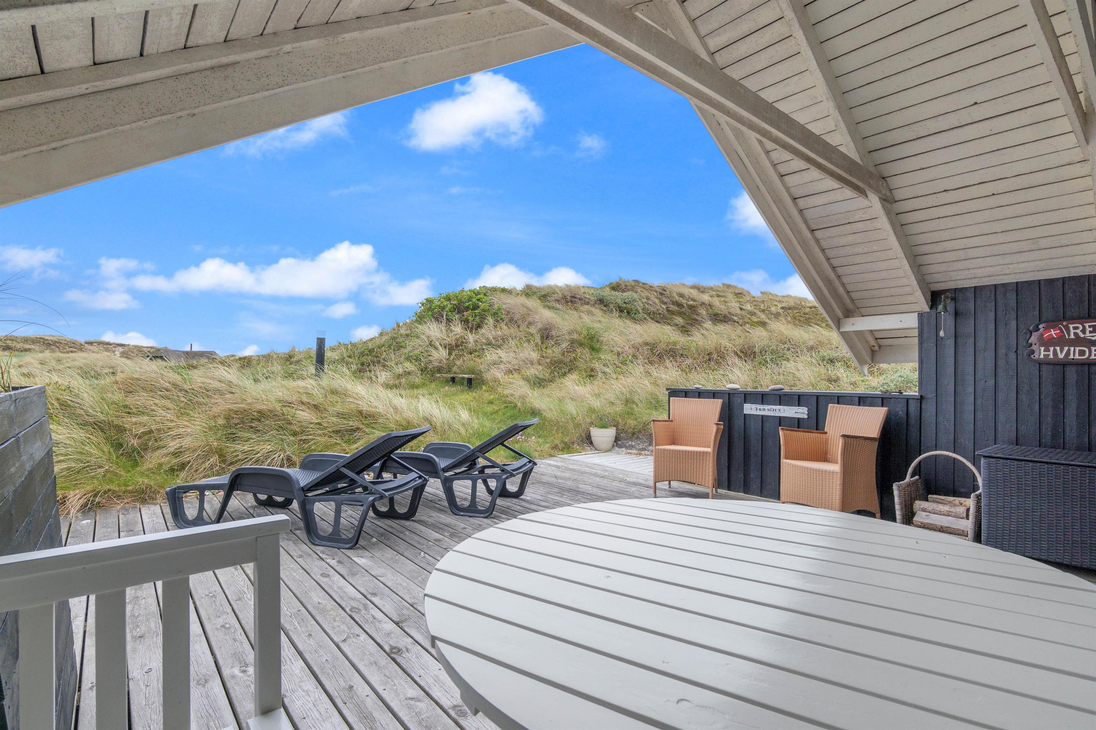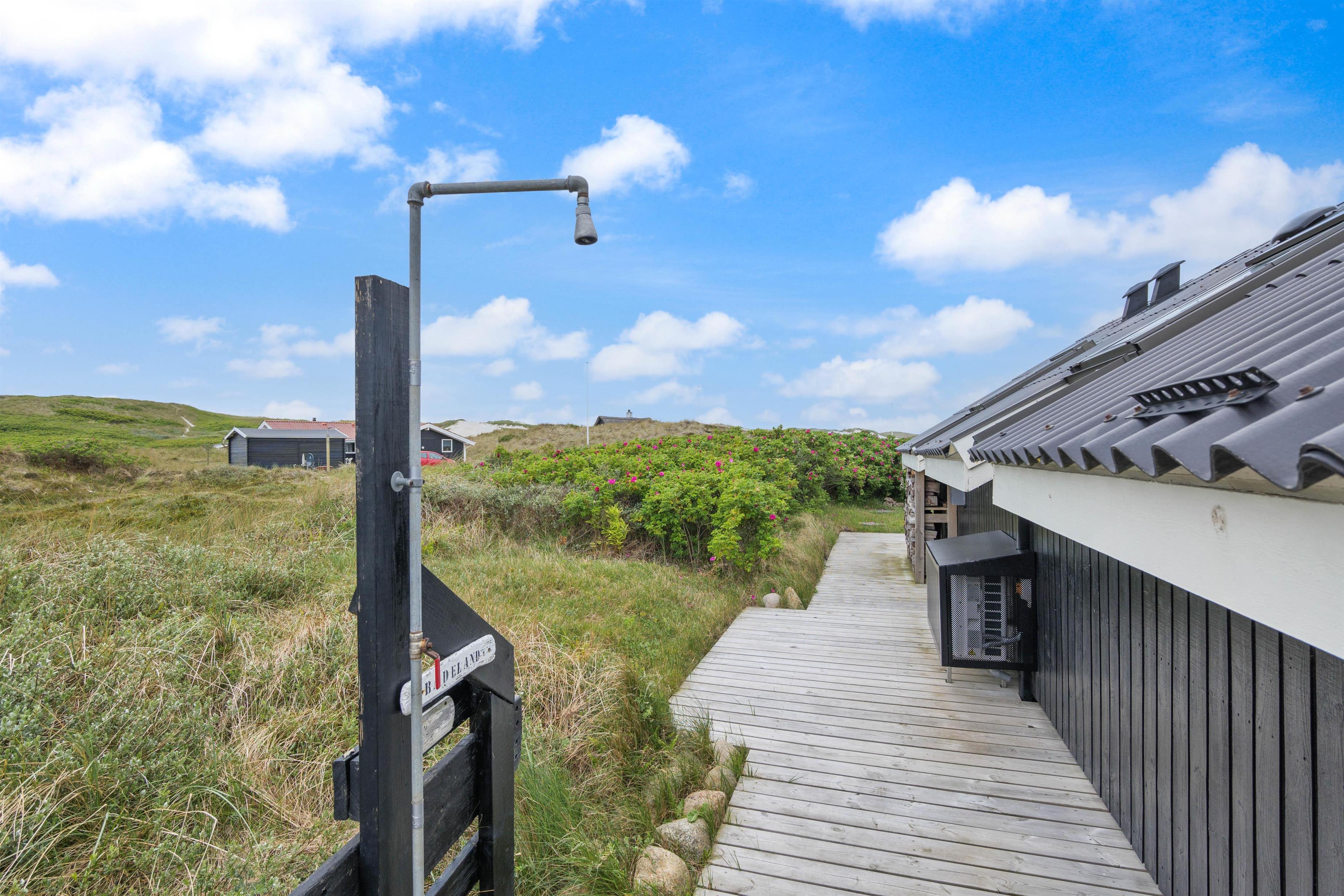 På den rummelige, afskærmede og delvist overdækkede terrasse kan du indtage nogle af måltiderne, slappe af med solbadning eller grille aftensmaden. På naturgrunden finder du en udendørs bruser og et redskabsrum. Udebruseren kan benyttes fra april til november. I en afstand af kun 550 meter ligger Vesterhavet og den dejlige sandstrand, som altså kun er en frisk gåtur fra feriehuset.