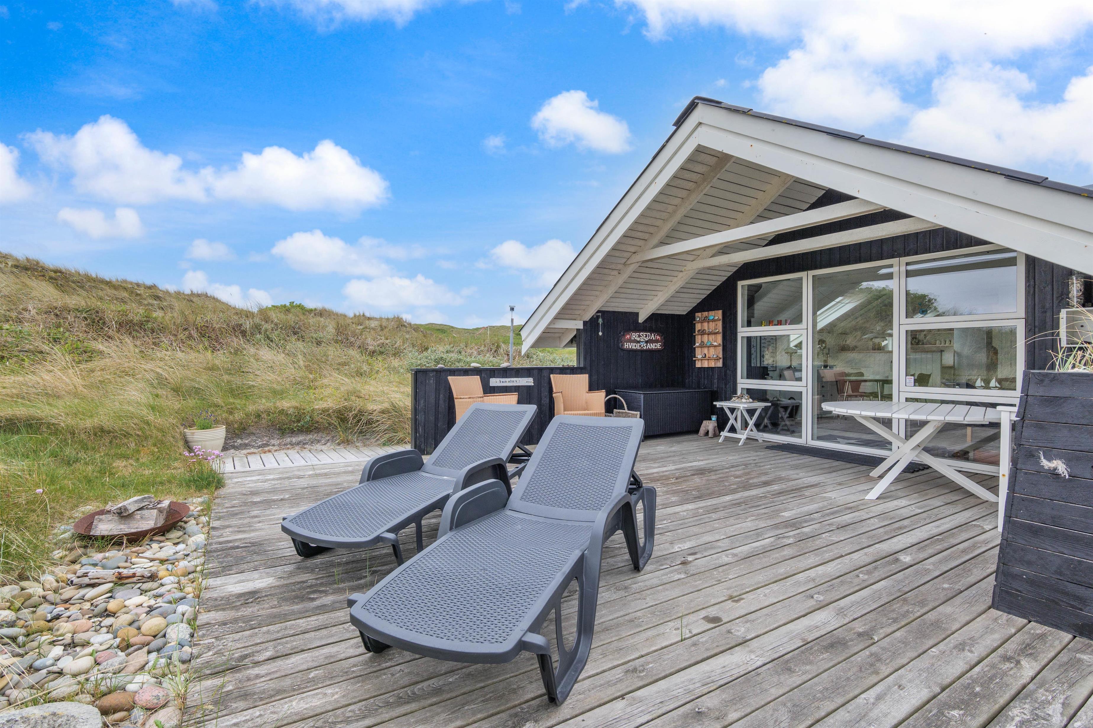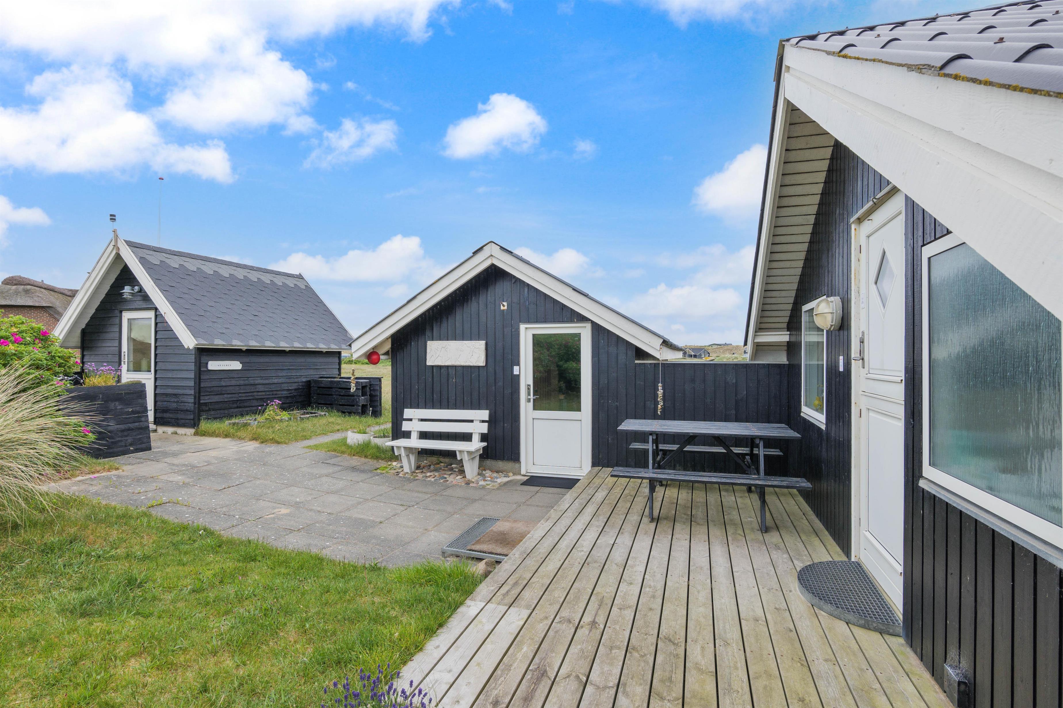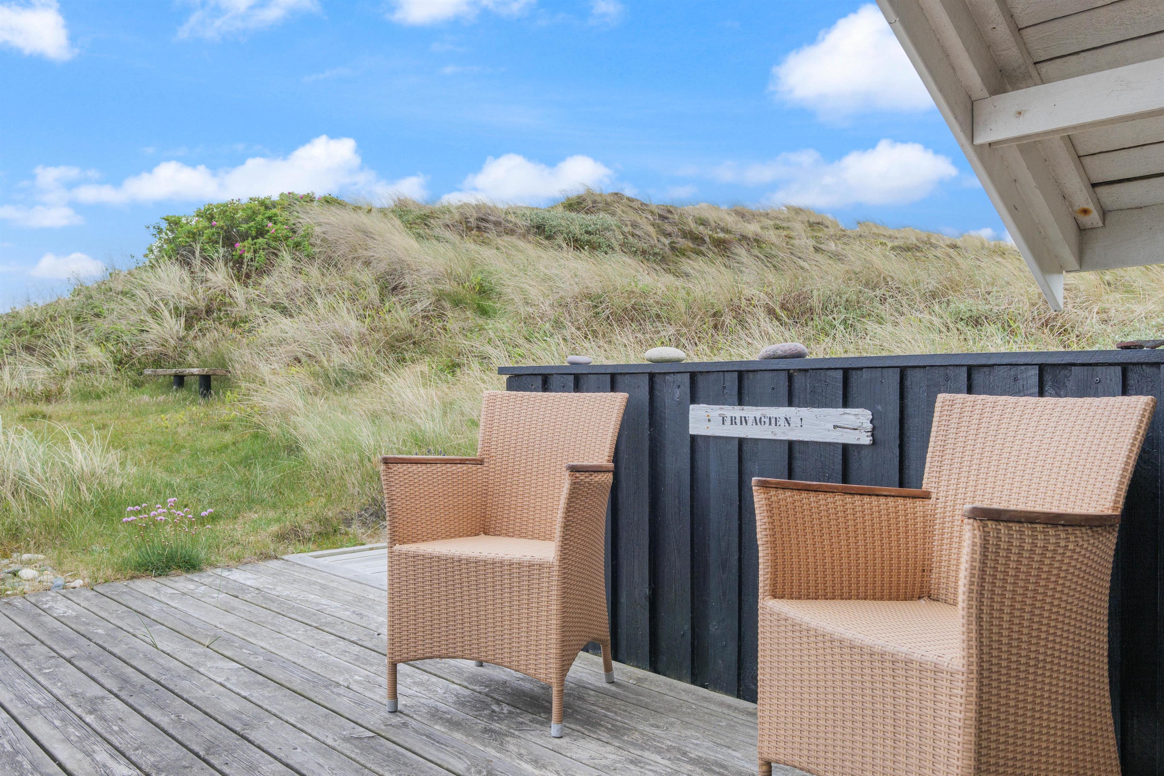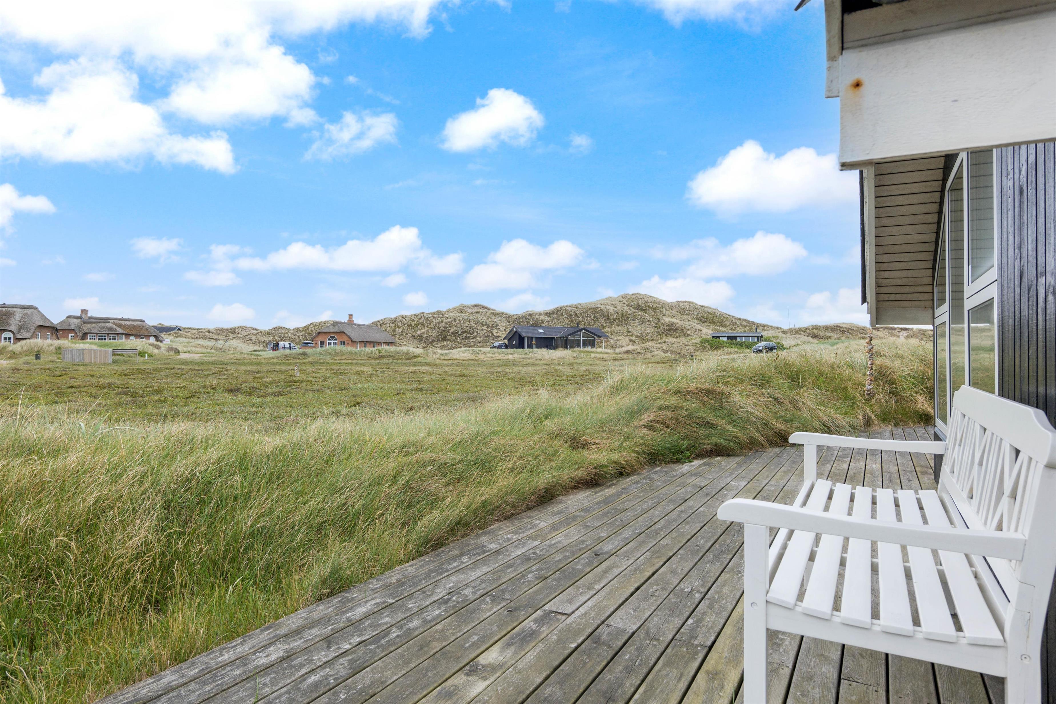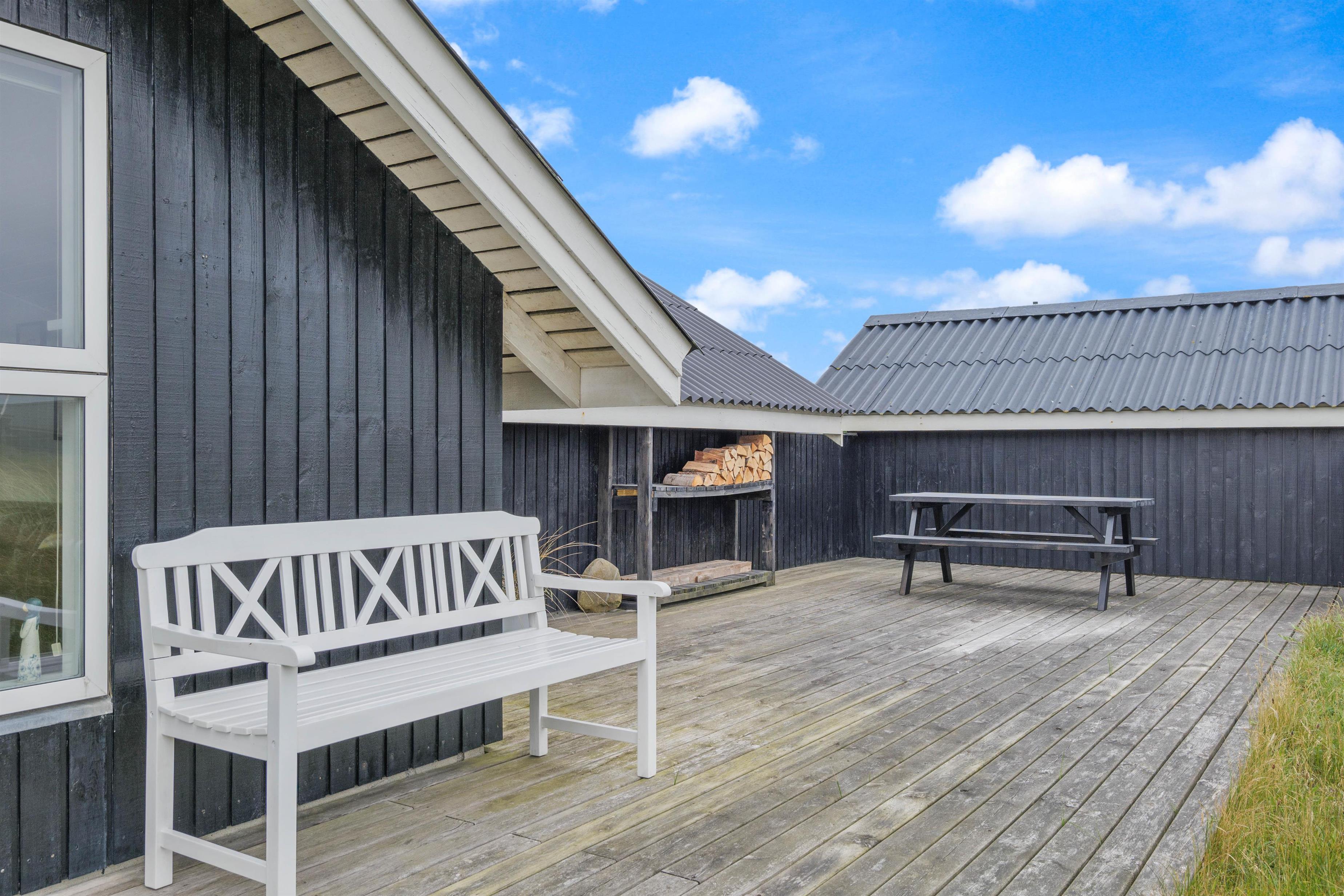 På den rummelige, afskærmede og delvist overdækkede terrasse kan du indtage nogle af måltiderne, slappe af med solbadning eller grille aftensmaden. På naturgrunden finder du en udendørs bruser og et redskabsrum. Udebruseren kan benyttes fra april til november. I en afstand af kun 550 meter ligger Vesterhavet og den dejlige sandstrand, som altså kun er en frisk gåtur fra feriehuset.