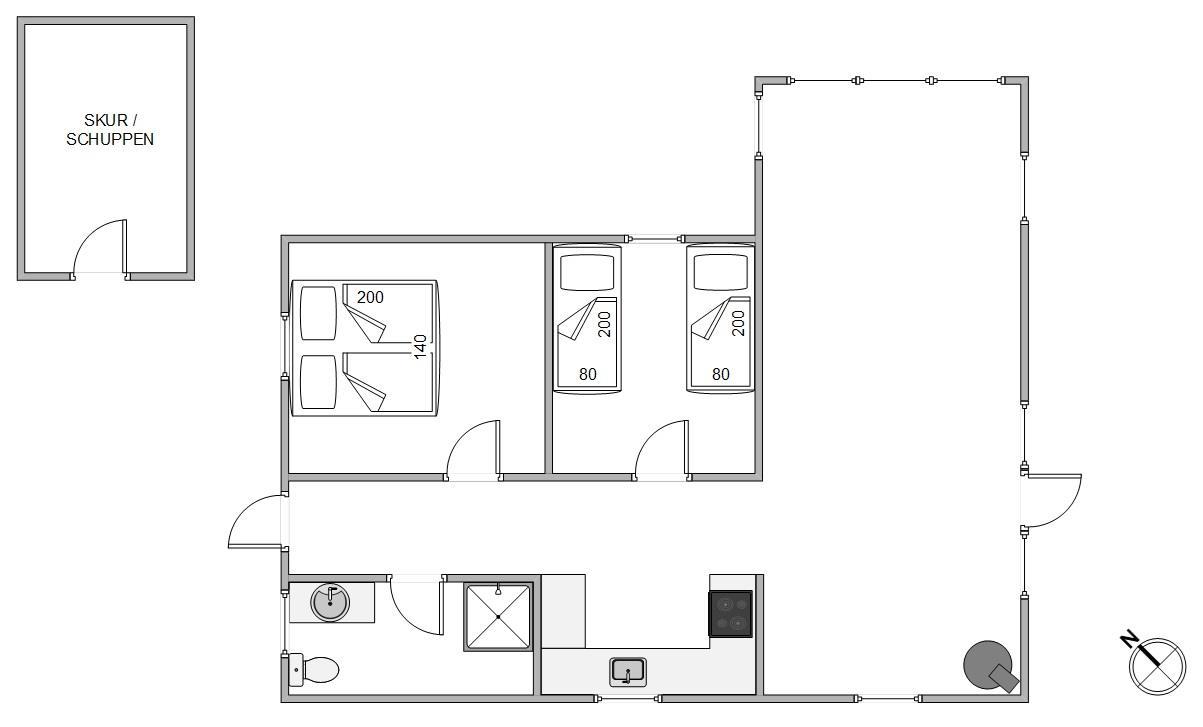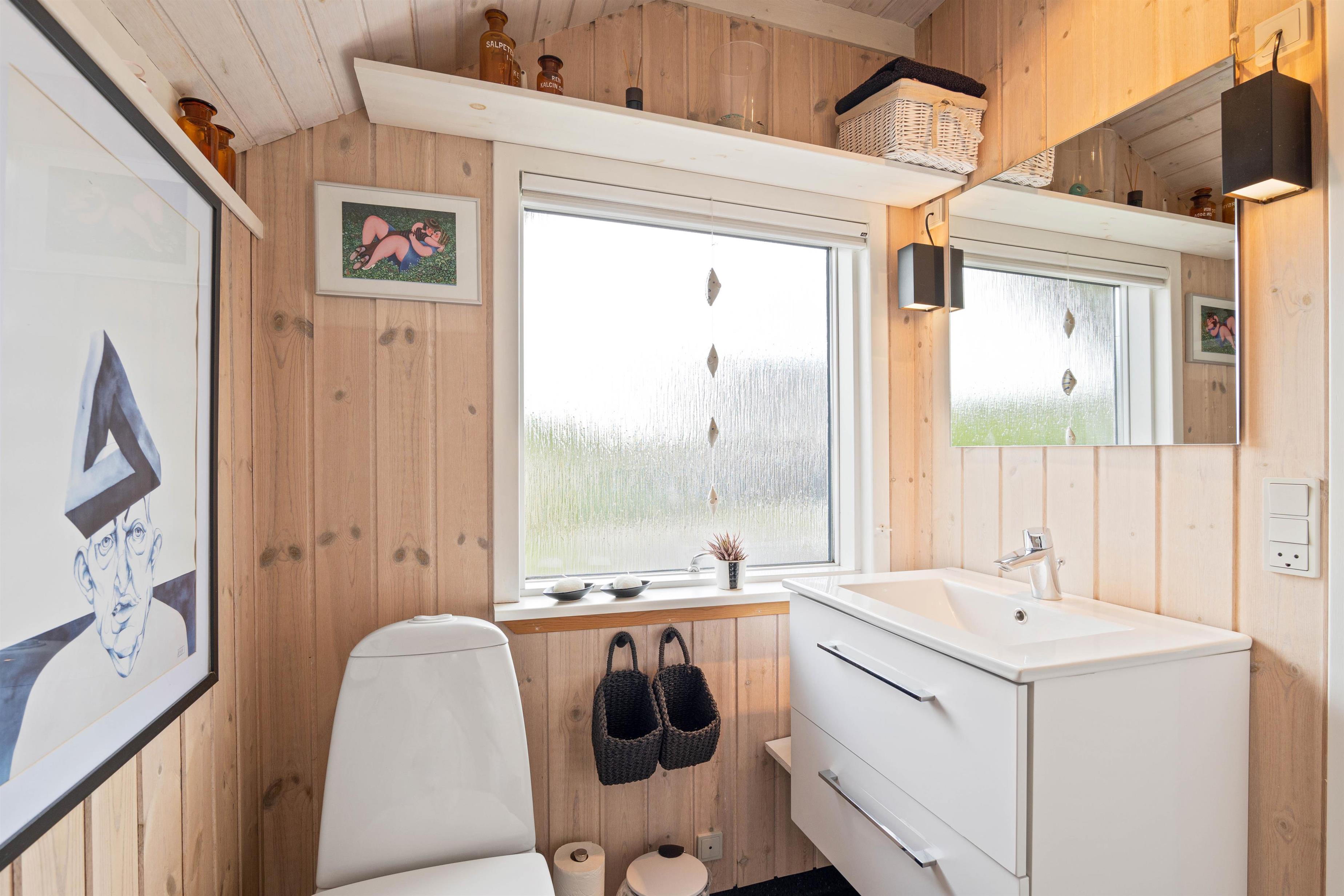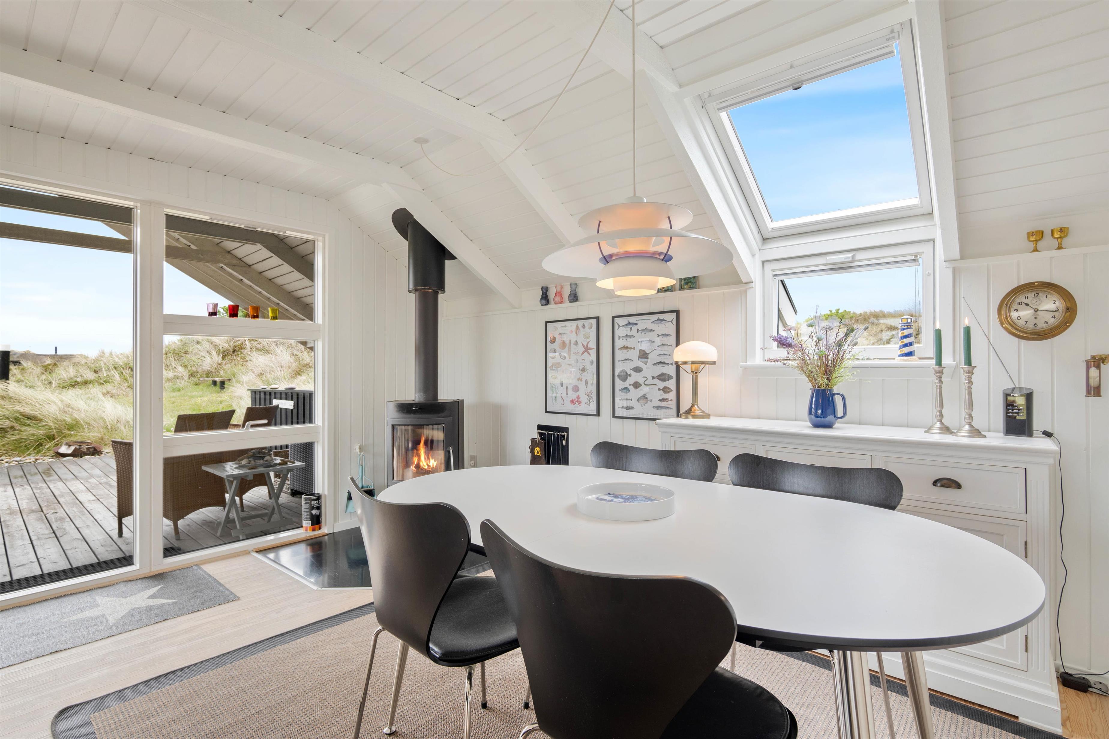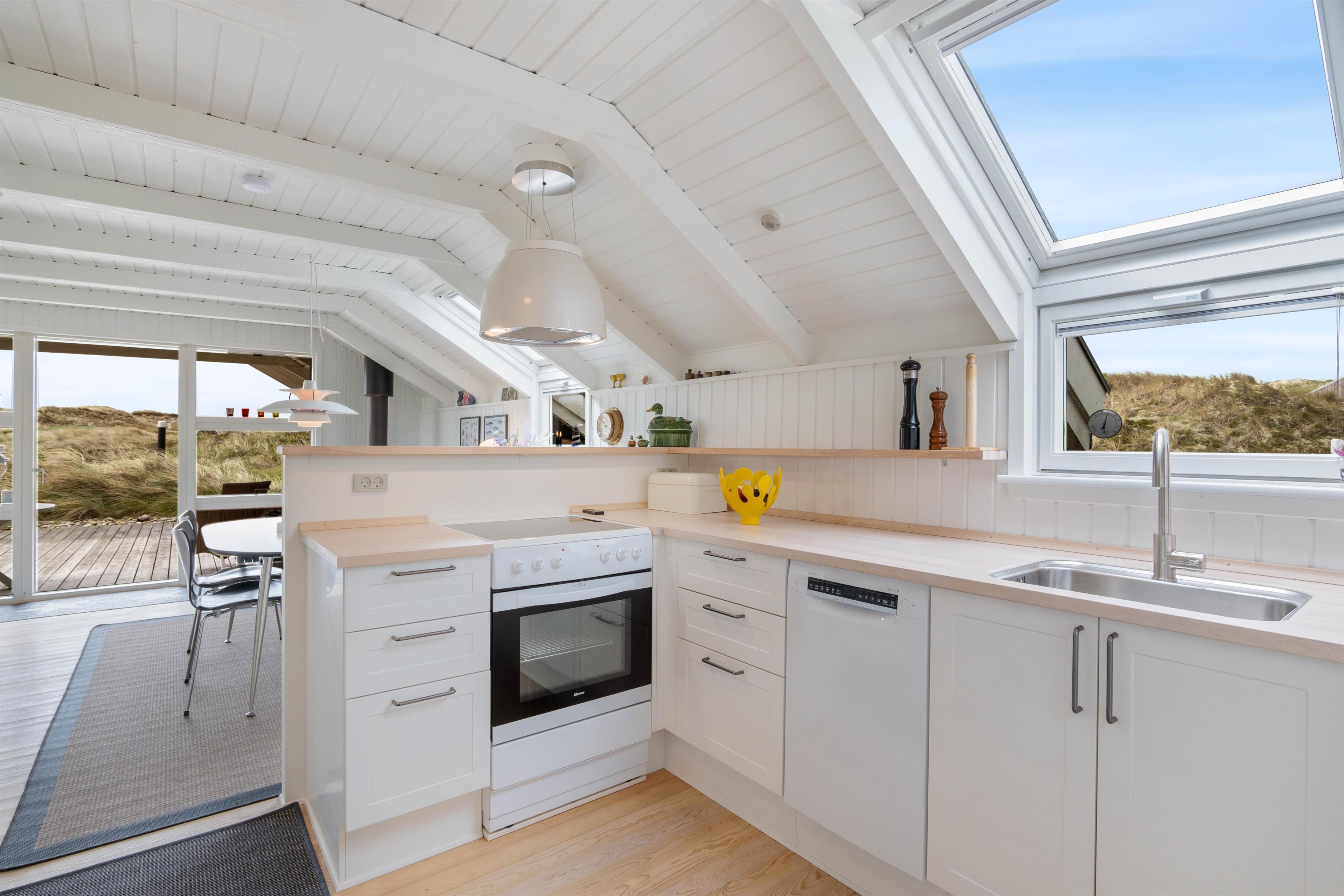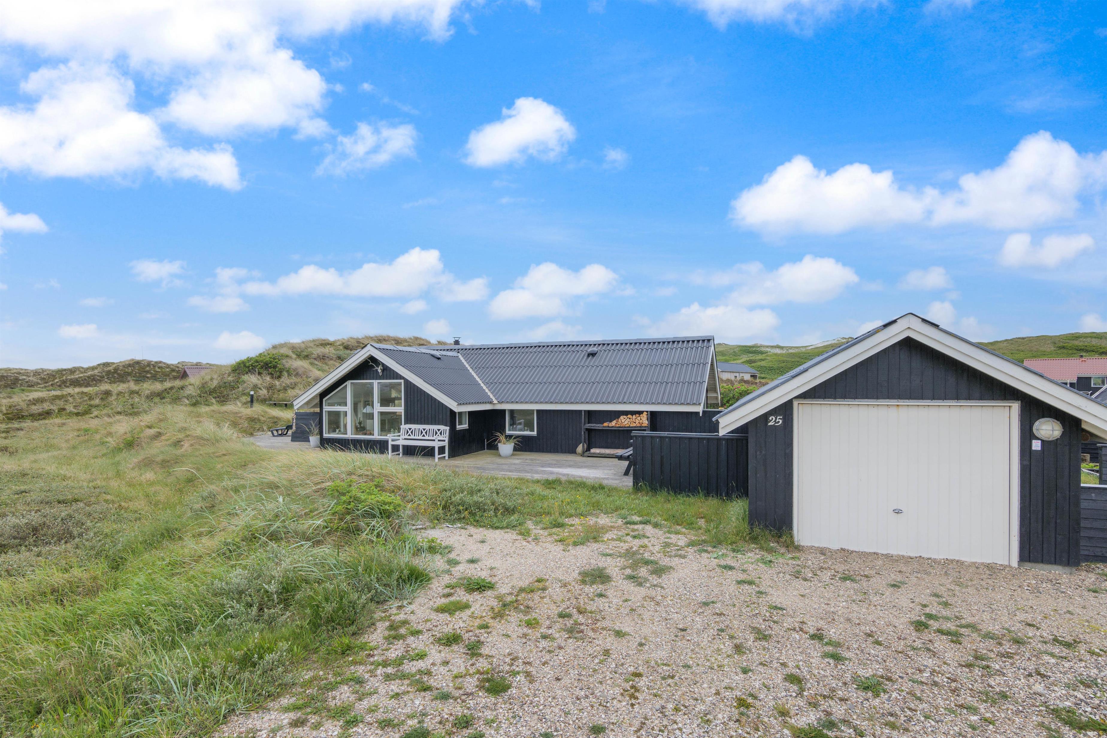På den rummelige, afskærmede og delvist overdækkede terrasse kan du indtage nogle af måltiderne, slappe af med solbadning eller grille aftensmaden. På naturgrunden finder du en udendørs bruser og et redskabsrum. Udebruseren kan benyttes fra april til november. I en afstand af kun 550 meter ligger Vesterhavet og den dejlige sandstrand, som altså kun er en frisk gåtur fra feriehuset.