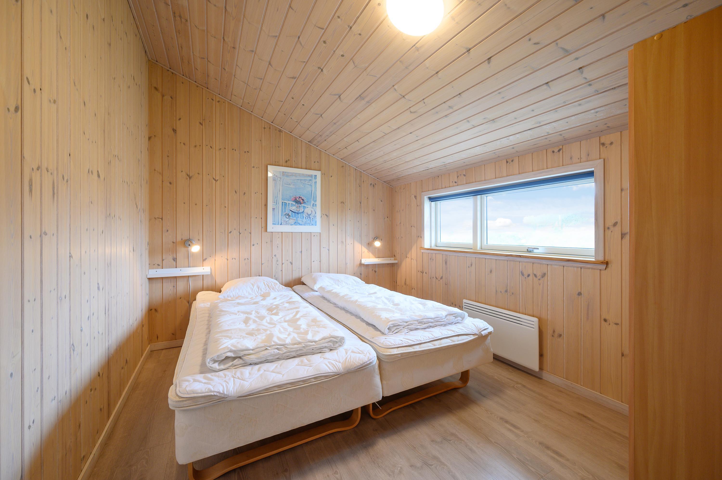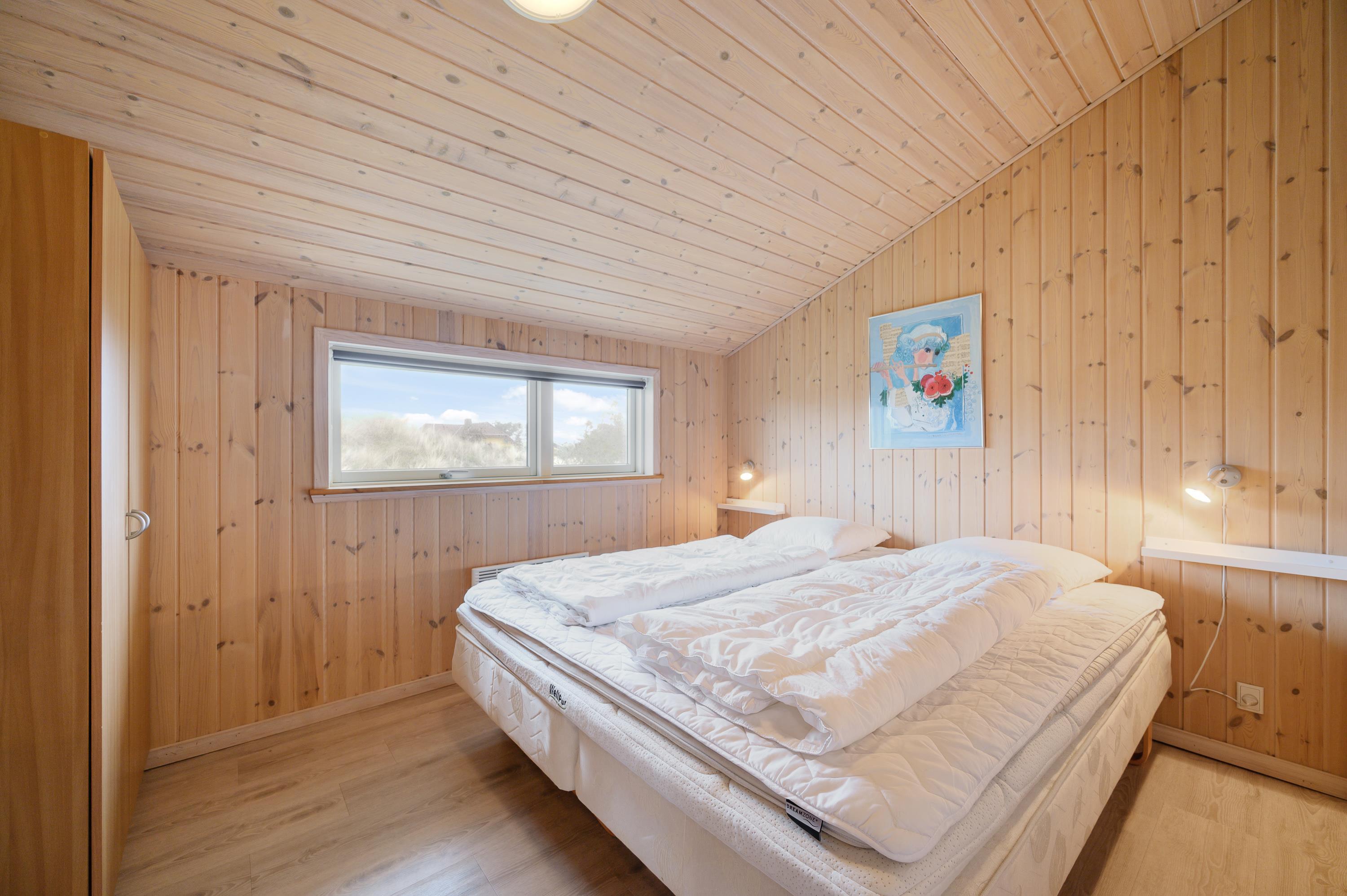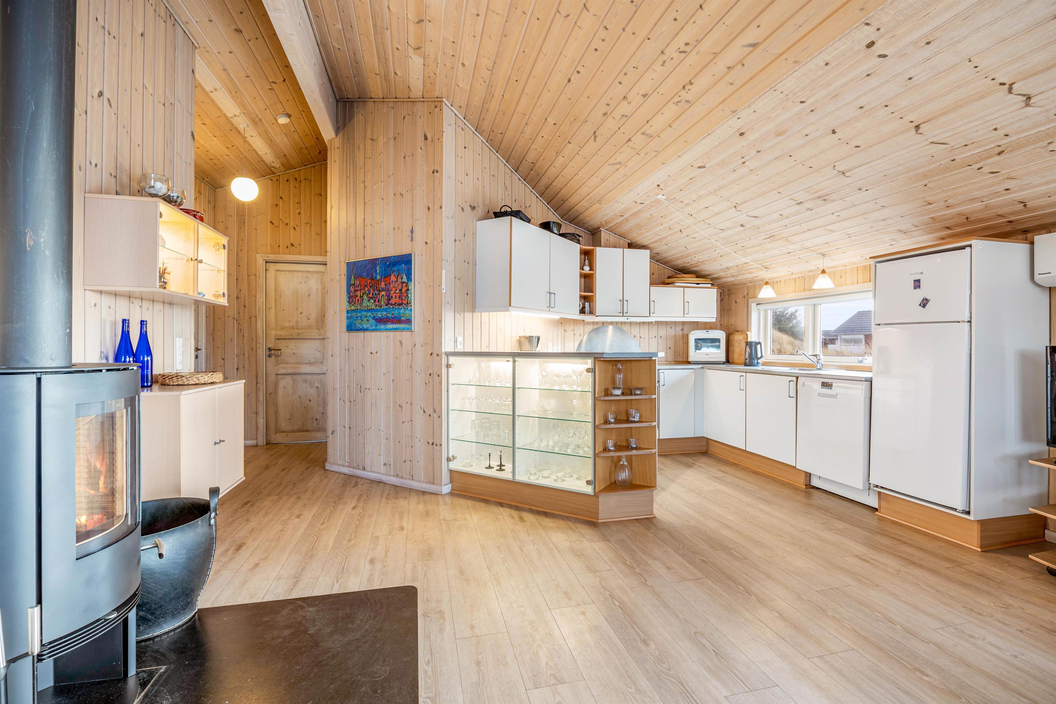 Indenfor er sommerhusets indretning lys og imødekommende. Feriehuset har med sine i alt 4 soverum plads til 8 personer. Det er primært de lyse trævægge og lofter, der dominerer indretningen i det store opholdsrum, som ligger i åben forbindelse med feriehusets køkken. Træets udformning, der går til kip, og duften fra træet skaber sammen med de store flotte vinduespartier en rigtig sommerhusstemning og et flot lysindfald i feriehuset. Uanset årstid.
