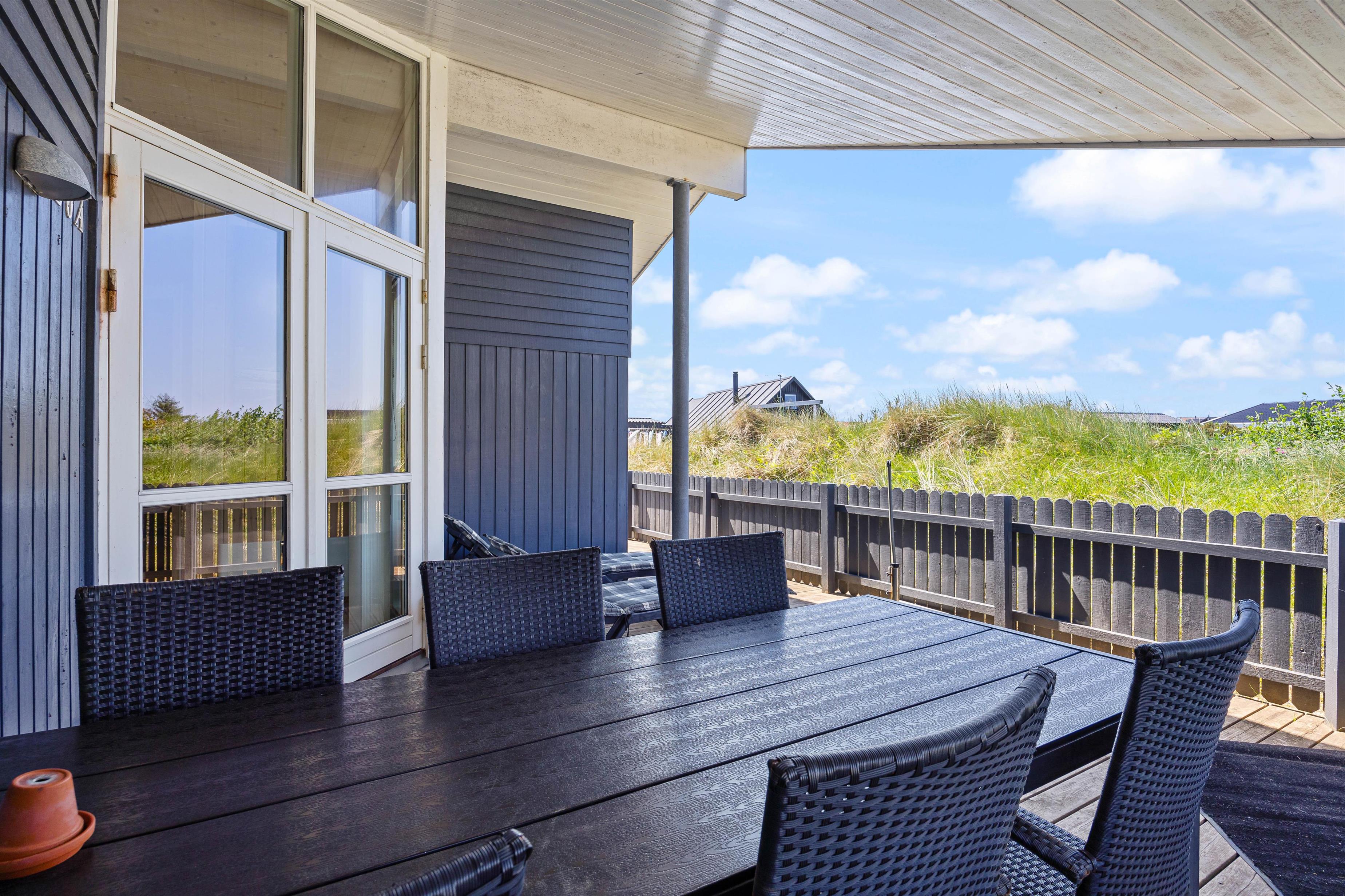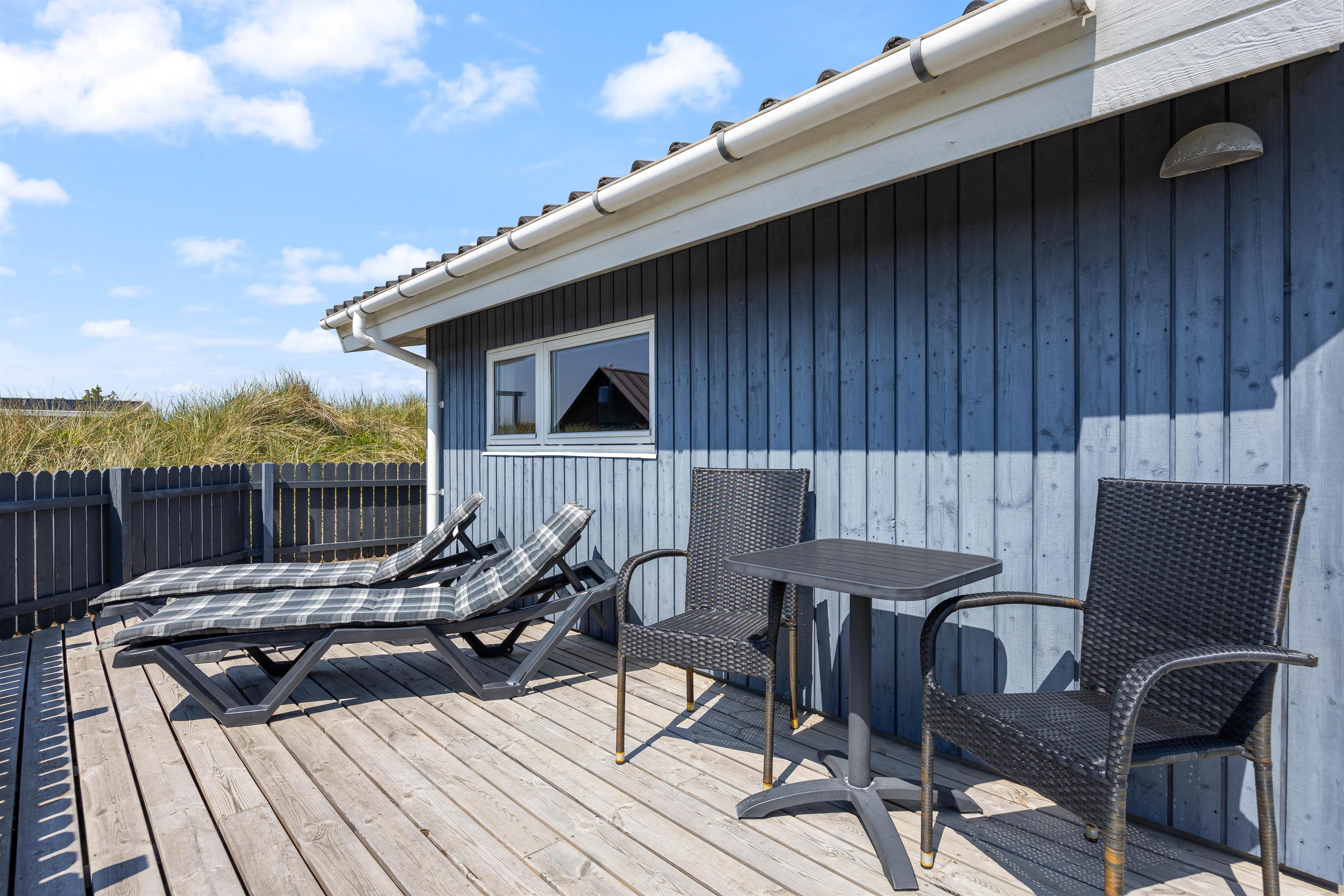 Sommerhuset har en dejlig lukket terasse mod vest, som er delvist overdækket. Her kan sommeraftenerne nydes med et koldt glas hvidvin, mens solen går ned i horisonten. Terrassen er samtidig helt ideel for hundeejere, da hunden kan gå frit på terrassen.
