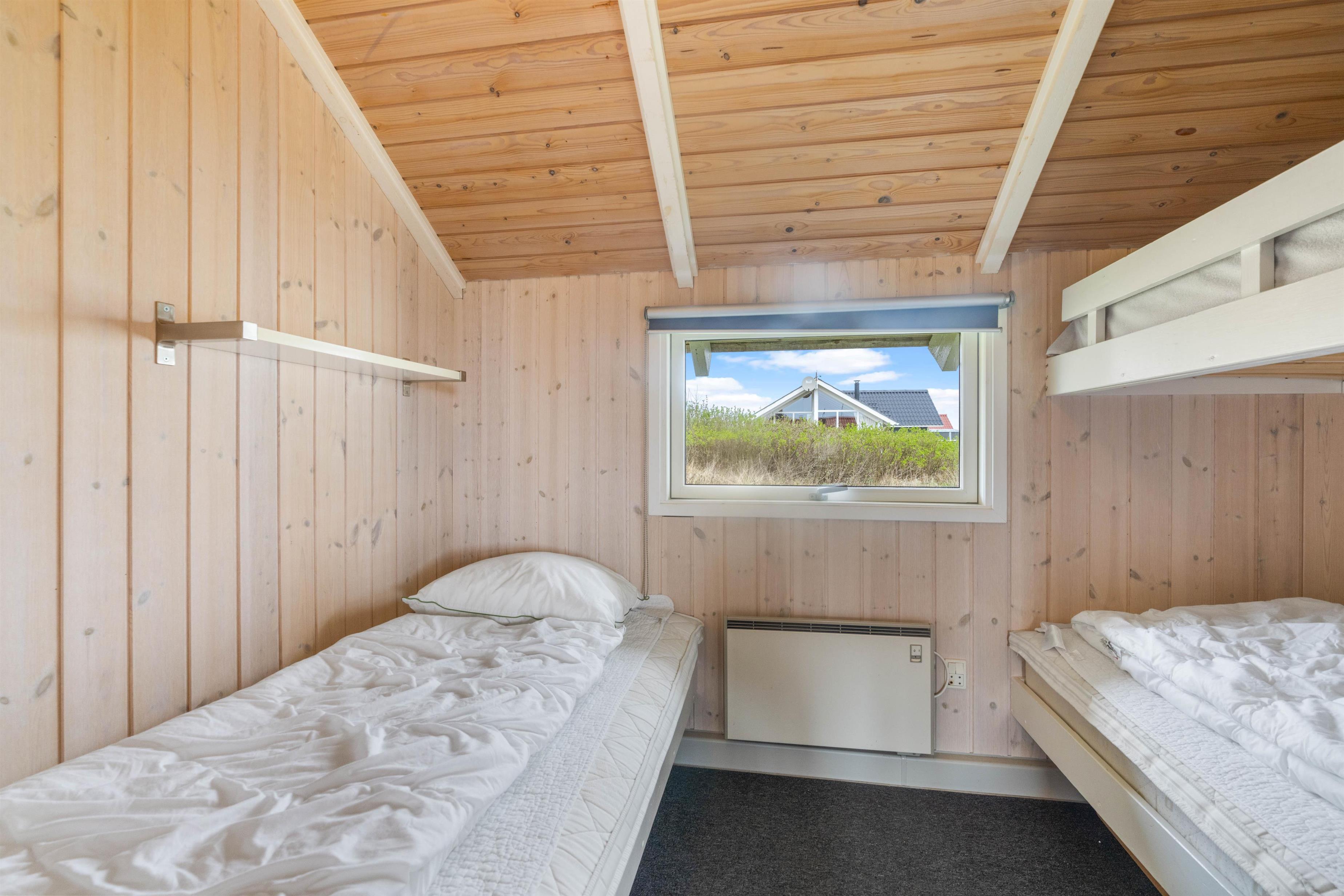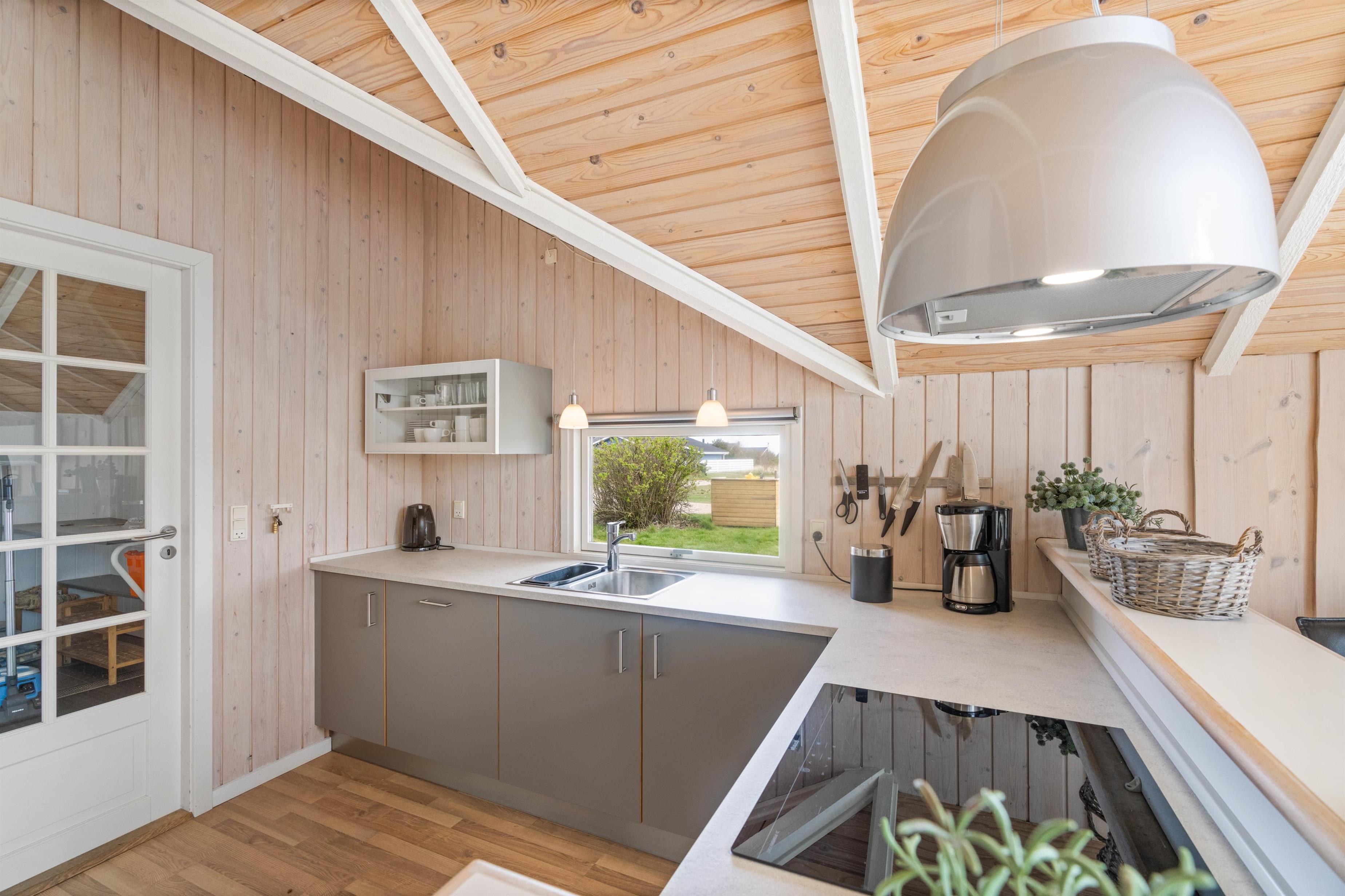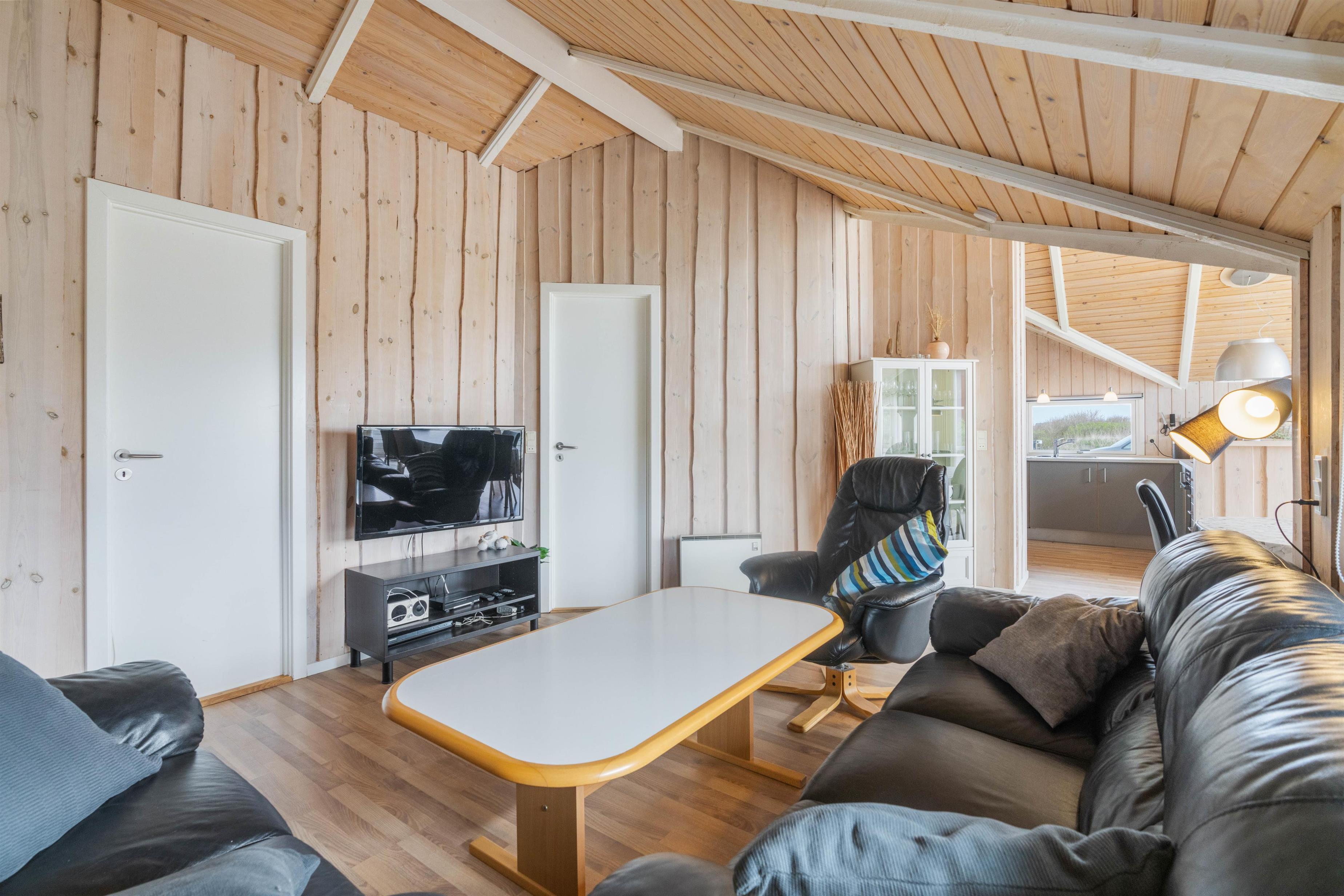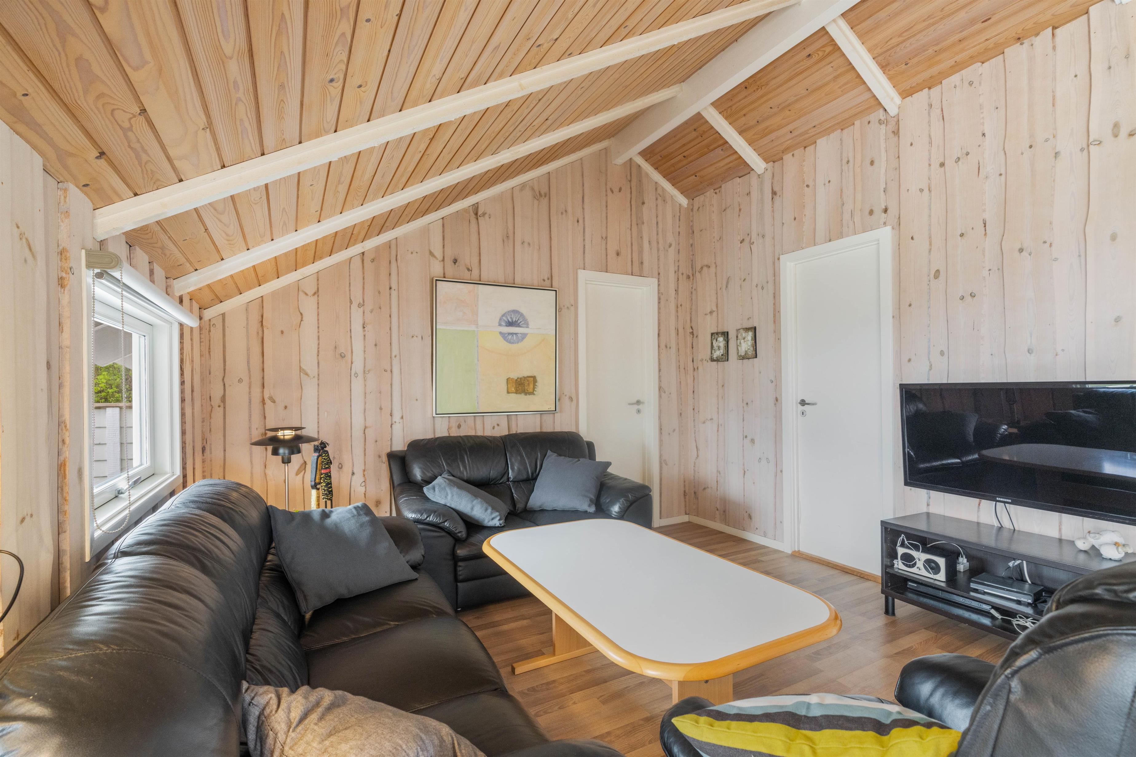Indretningen i det flotte sommerhus er lys og indbydende, og de mange vinduer sikrer et smukt kig til landskabet udenfor. Vægge og lofter er beklædte med træ, hvilket er med til at skabe en dejlig varm og hyggelig atmosfære i indretningen. I sommerhuset er der en brændeovn samt en varmepumpe.