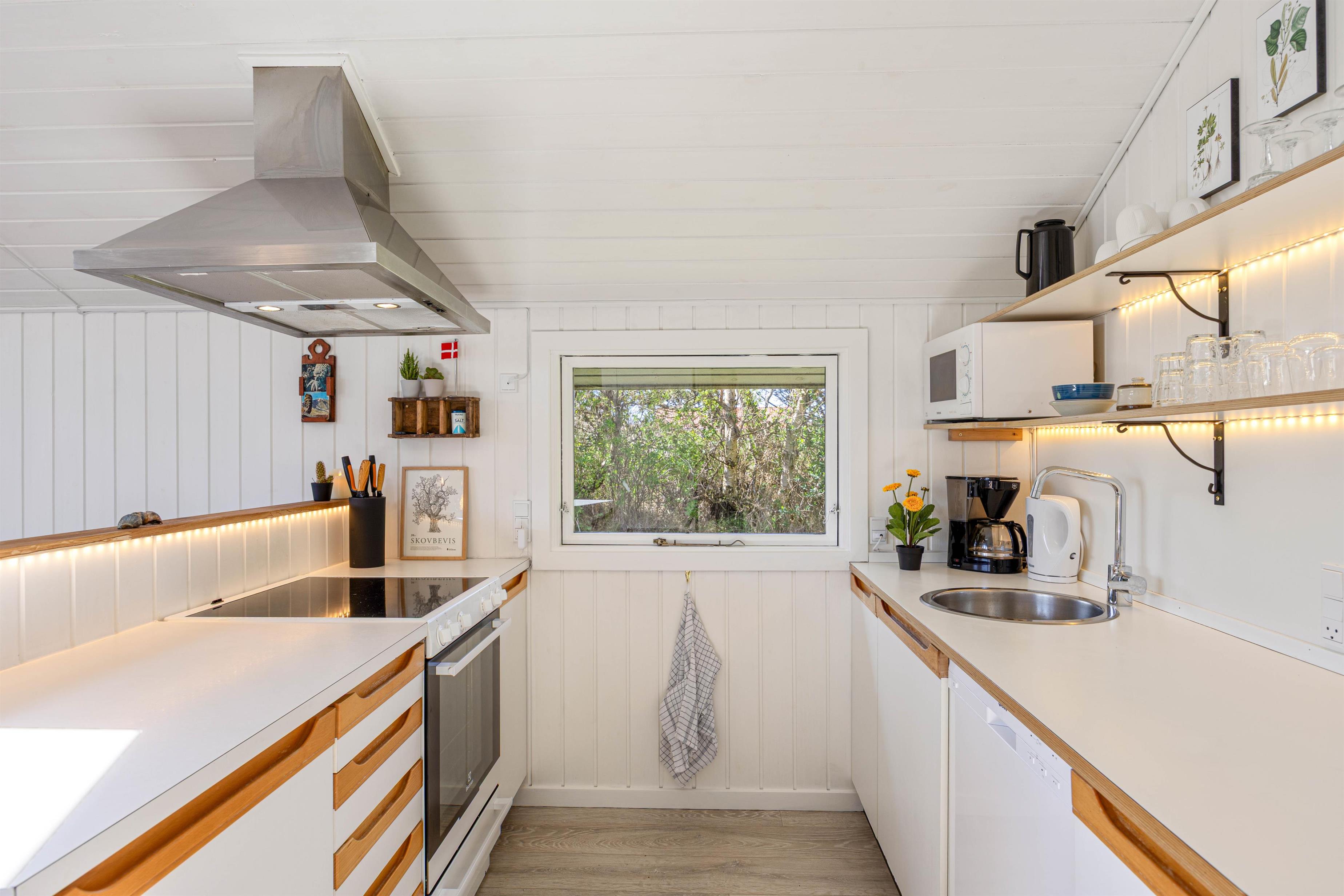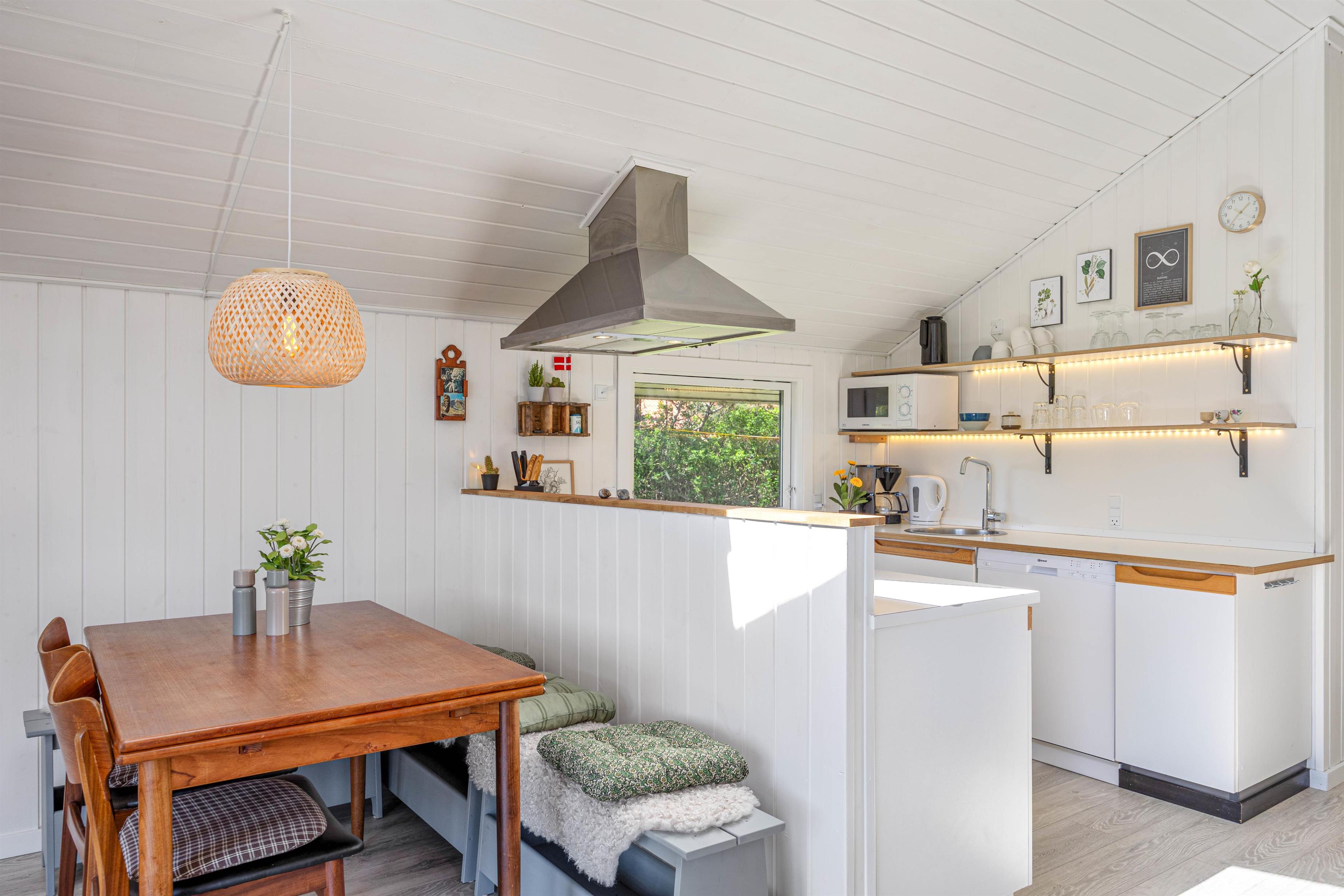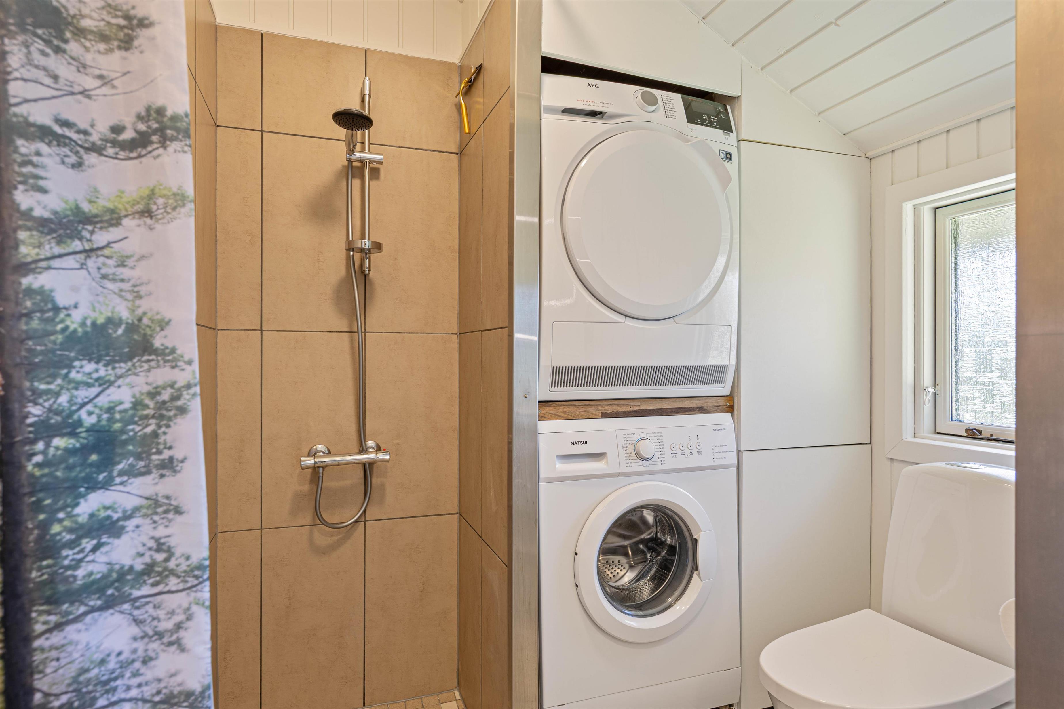 Det åbne køkken gør madlavningen til en del af fællesskabet og er udstyret med alt det nødvendige til feriemåltiderne. På badeværelset med gulvvarme finder I både vaskemaskine og tørretumbler, som gør det nemt at holde styr på hverdagens praktiske gøremål, selv i ferien.