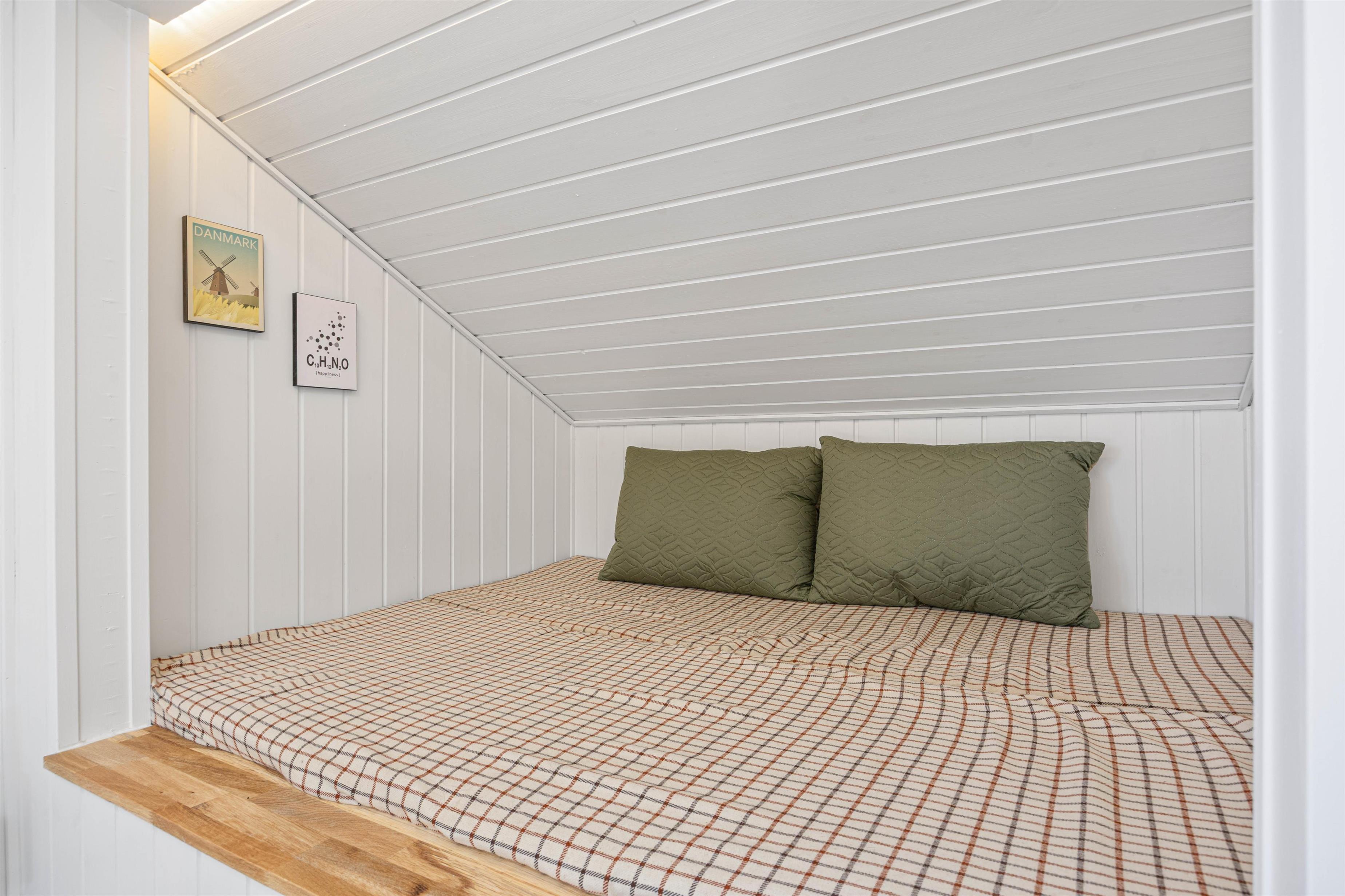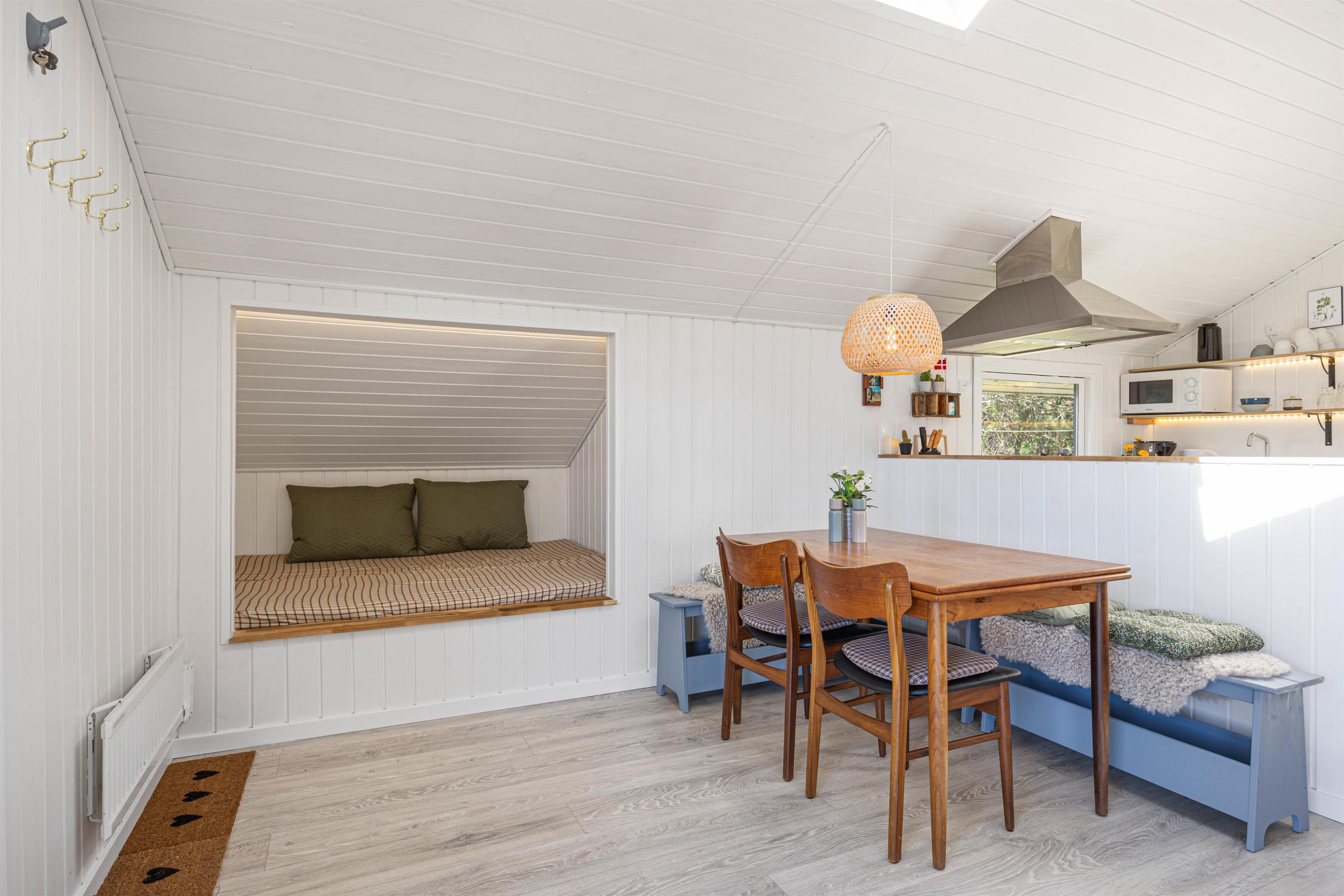 Når I træder indenfor, mødes I af en lys og venlig atmosfære, der inviterer til afslapning fra første øjeblik. Opholdsstuen er indrettet med en komfortabel sofa og fjernsyn med Chromecast, så I nemt kan streame jeres yndlingsfilm og serier. En Bluetooth-højtaler sørger for baggrundsmusikken, når I nyder et glas vin om aftenen eller hygger jer med et brætspil ved spisebordet. Den energibesparende varmepumpe sikrer en behagelig temperatur hele året rundt.