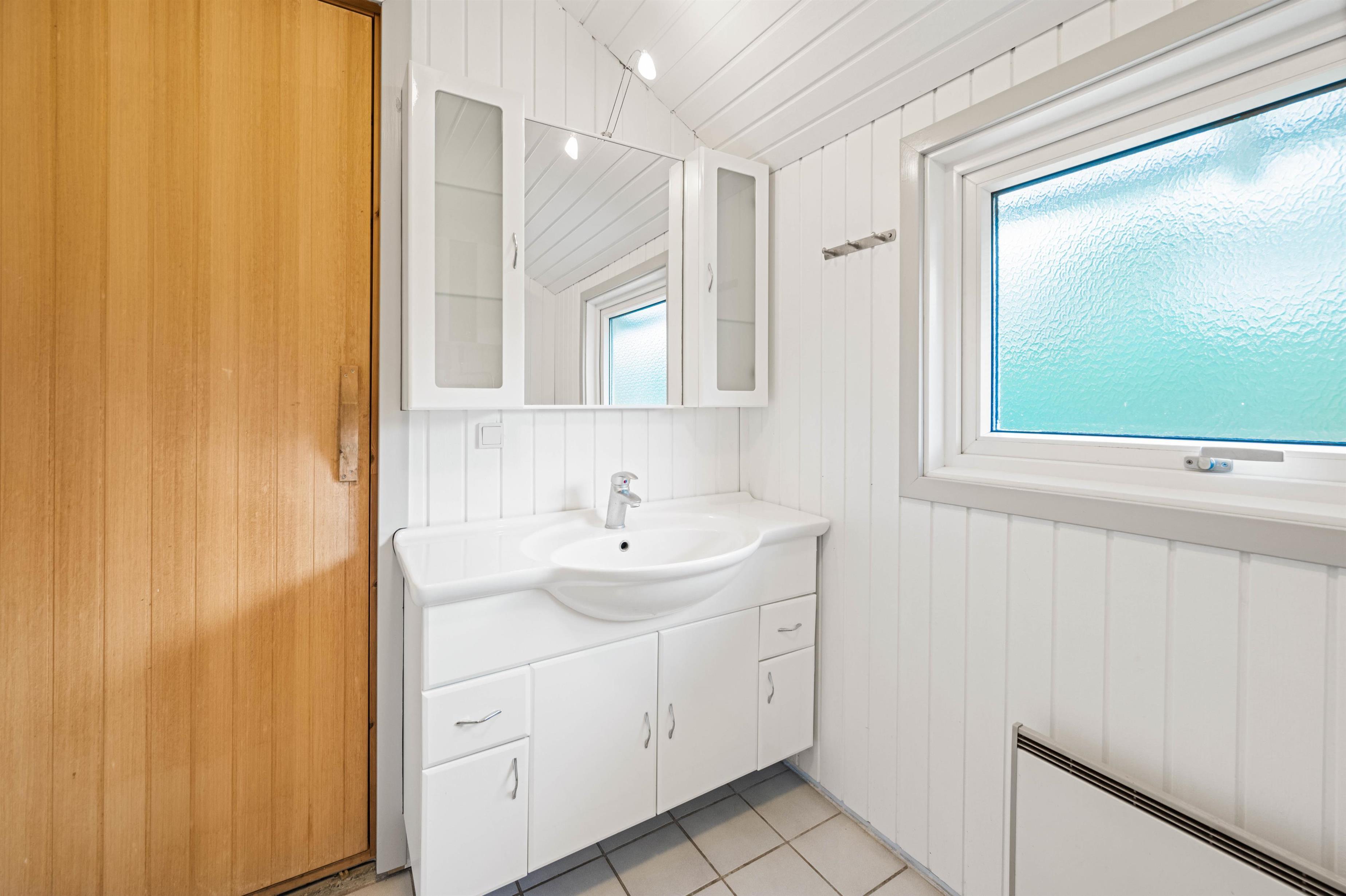 I forbindelse med det lyse badeværelse med gulvvarme finder I saunaen, der er den perfekte afslutning på en dejlig feriedag ved hav og fjord, for selv om sommerhuset er placeret på fjordsiden er der ikke mere end 1000 meter til det fantastiske Vesterhav.