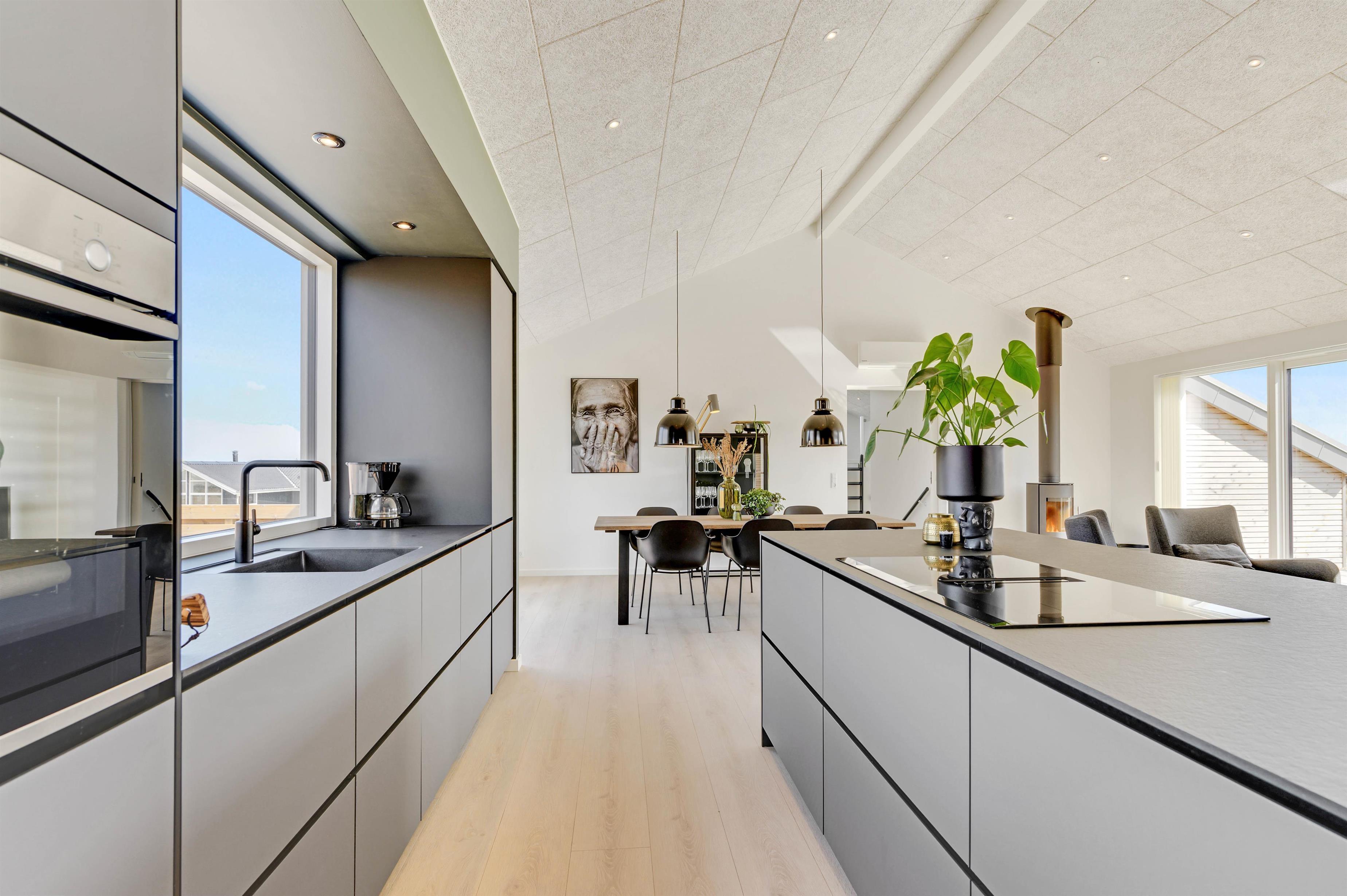 Hjertet i sommerhuset er det store og flotte opholdsrum med kombineret køkken og stue med spiseafdeling og sofahjørne. De store vinduespartier tager naturen med helt ind i stuen, giver et fantastisk lys i hele rummet – og ikke mindst en formidabel udsigt fra både spisepladsen og det hyggelige sofahjørne.