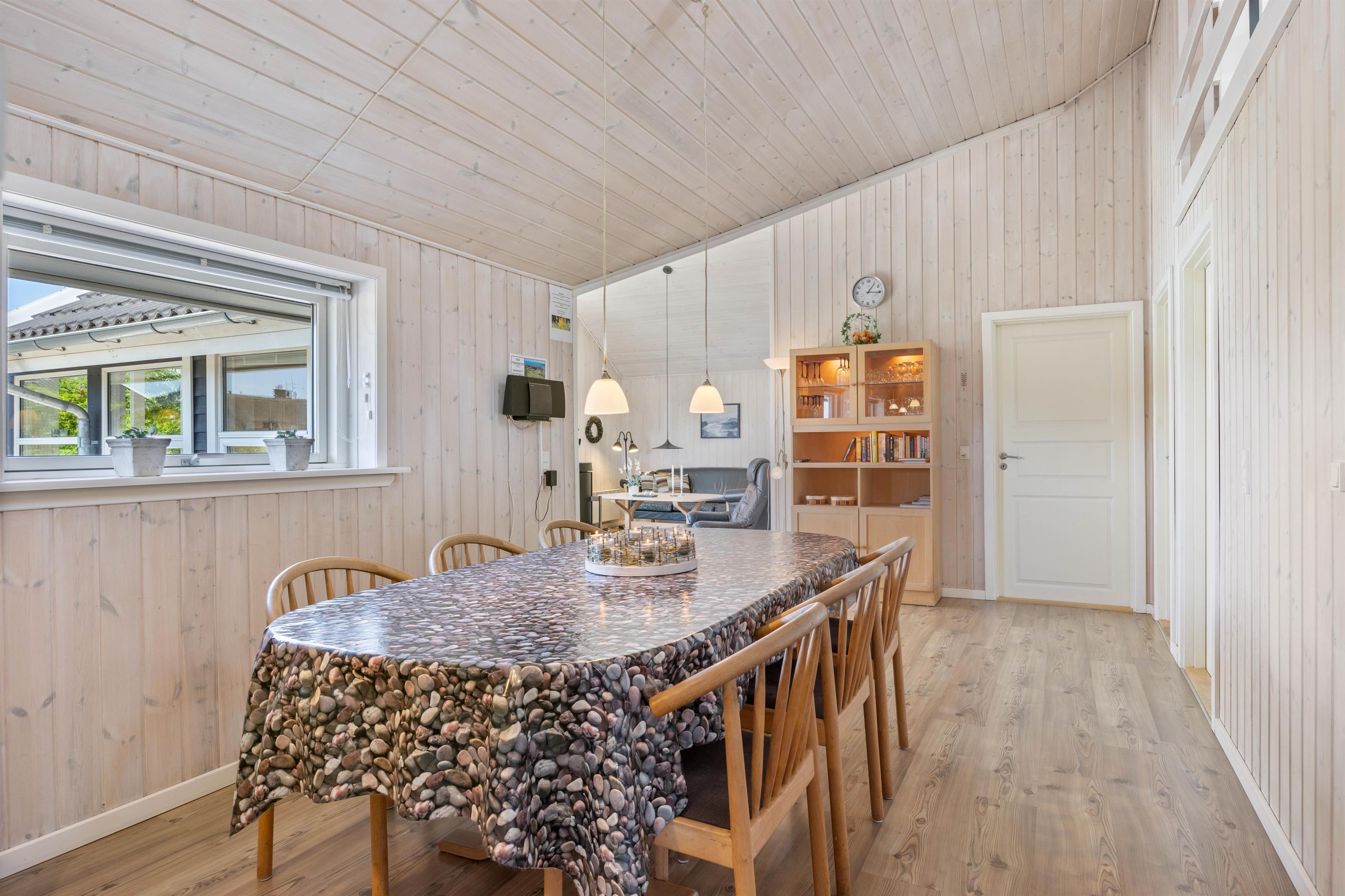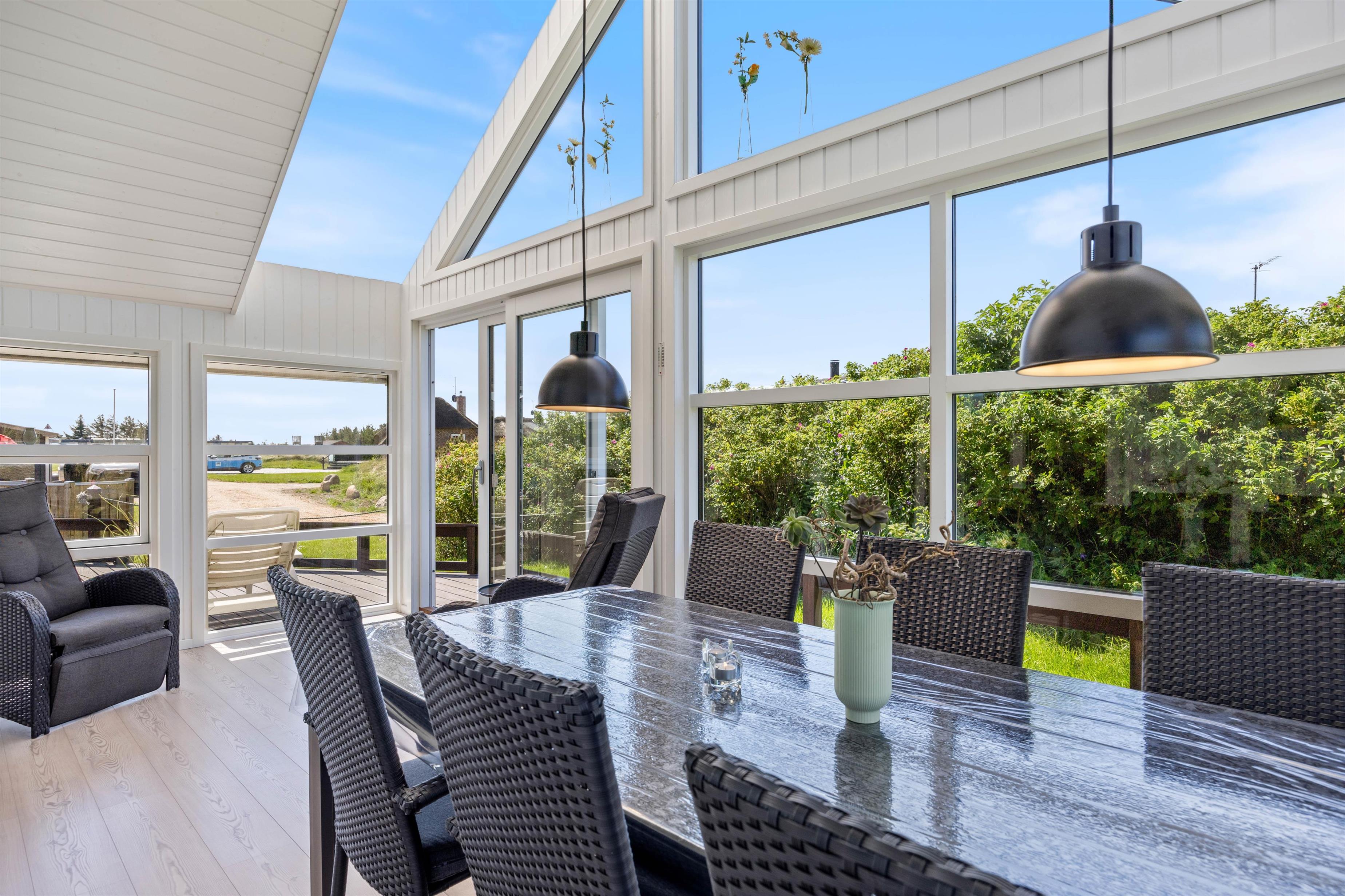 Sommerhuset på Vesterledvej 12 tilbyder en bred vifte af faciliteter for at sikre, at I har en komfortabel og afslappende ferie. Efter en lang dag med oplevelser kan I slappe af foran brændeovnen i stuen eller nyde en hyggelig aften i udestuen. Køkkenet er fuldt udstyret med opvaskemaskine, og både vaskemaskine og tørretumbler står til rådighed for jeres bekvemmelighed. Den energibesparende luft til luft varmepumpe sikrer et behageligt indeklima året rundt.