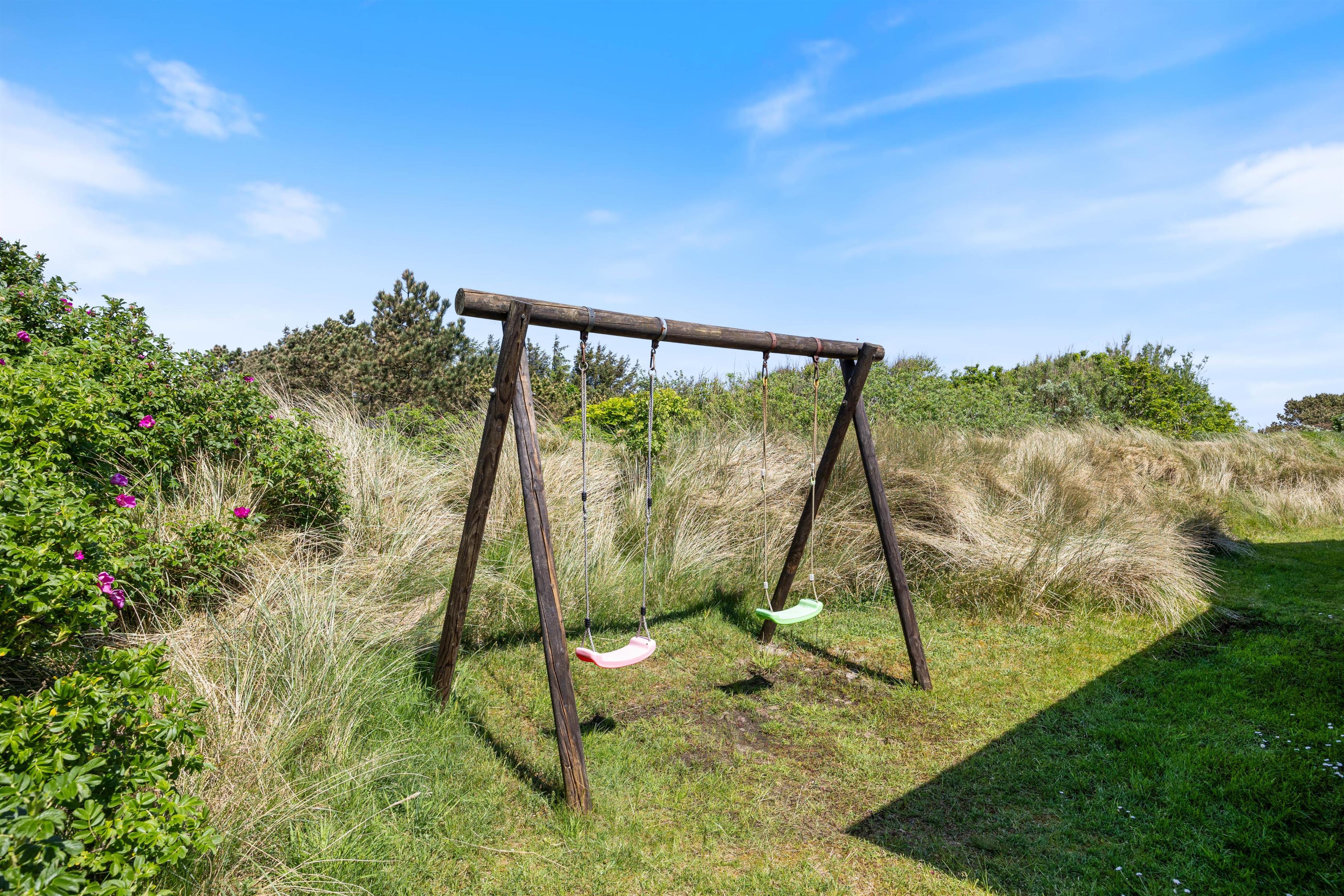 Den tilhørende afskærmede terrasse og naturgrunden indbyder til afslapning udendørs, hvor I også kan tænde op i grillen og nyde et lækkert måltid i de komfortable havemøbler. Børnene vil elske at lege på gyngen, mens I nyder en afslappet stund på terrassen.