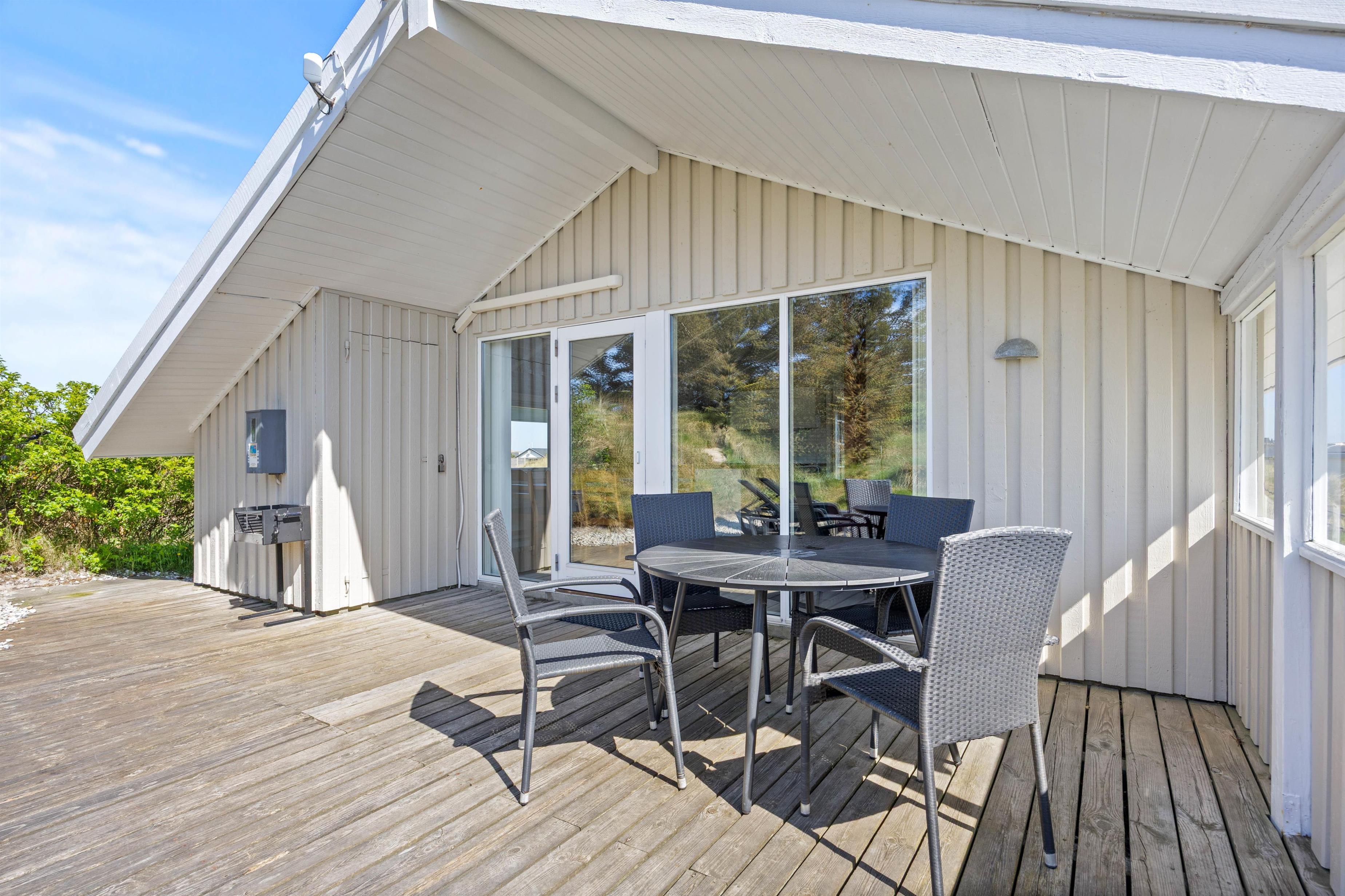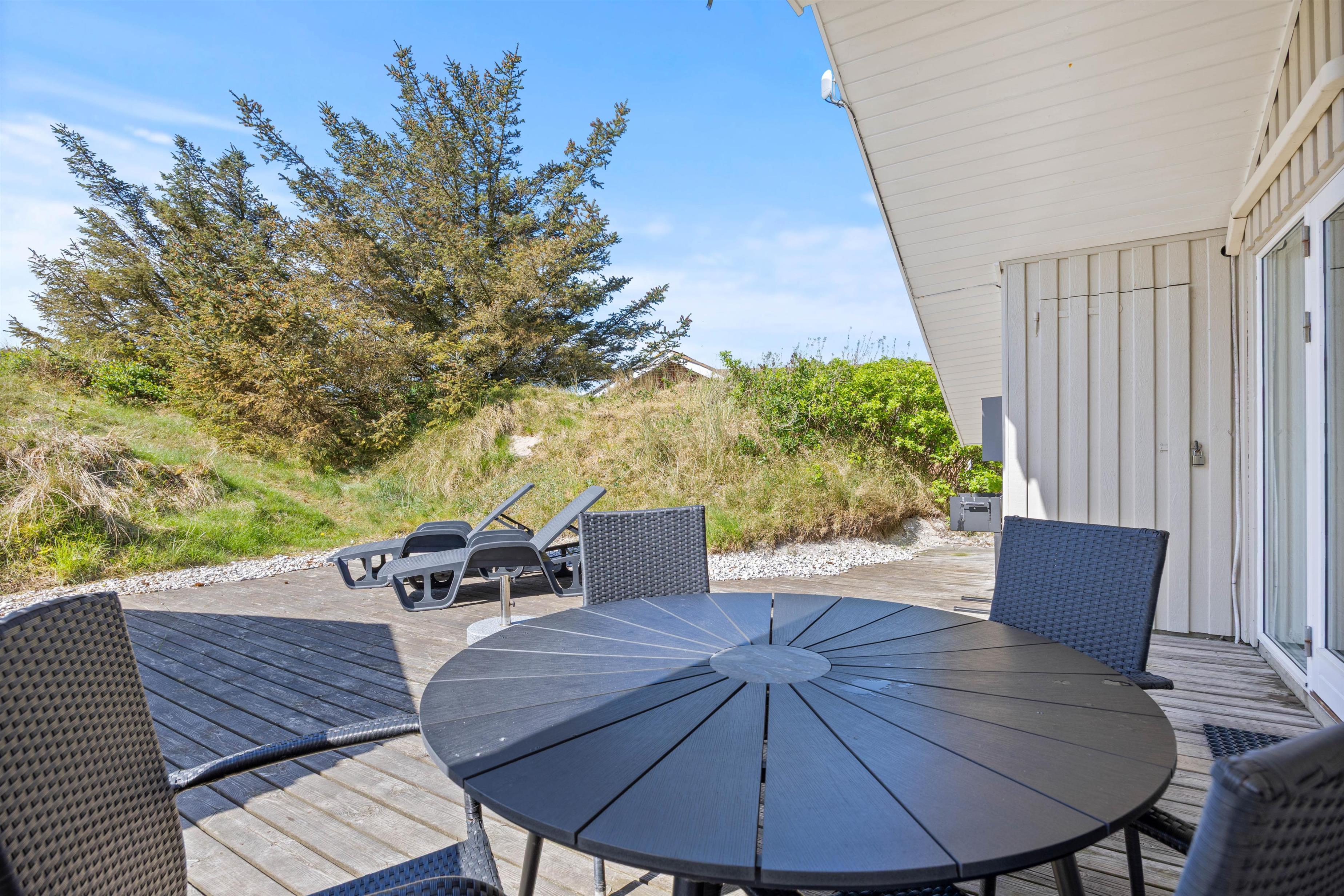 Fra sommerhusets spisestue er der direkte udgang til den hyggelige træterrasse, som er godt afskærmet, så du kan sidde i læ og nyde solen. Til terrassen hører havemøbler, liggestole og grill. Hvem kunne ikke tænke sig at nyde lune sommeraftener her? Tænd op i grillen og nyd de skønne omgivelser, mens børnene leger, og I venter på et lækkert måltid.