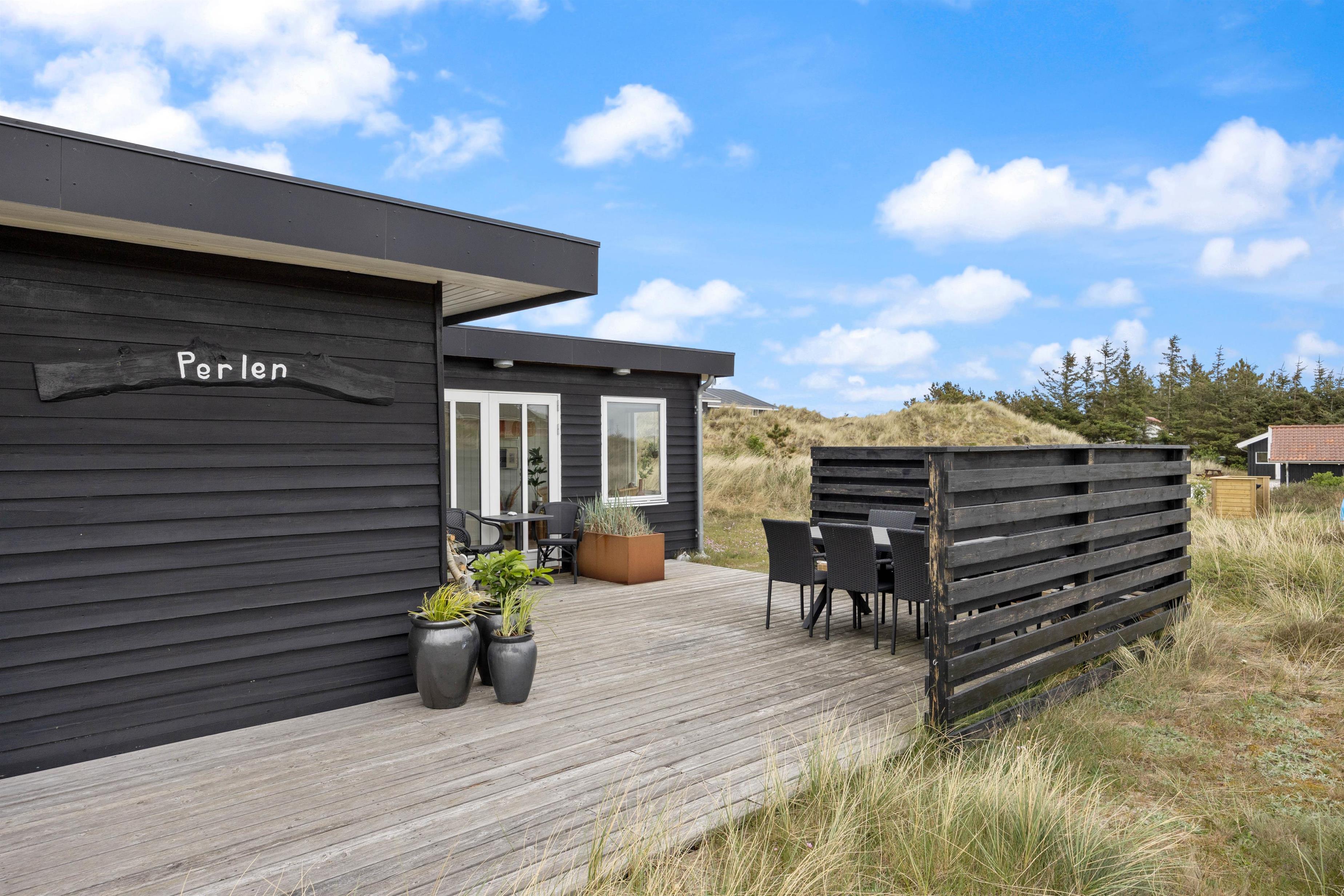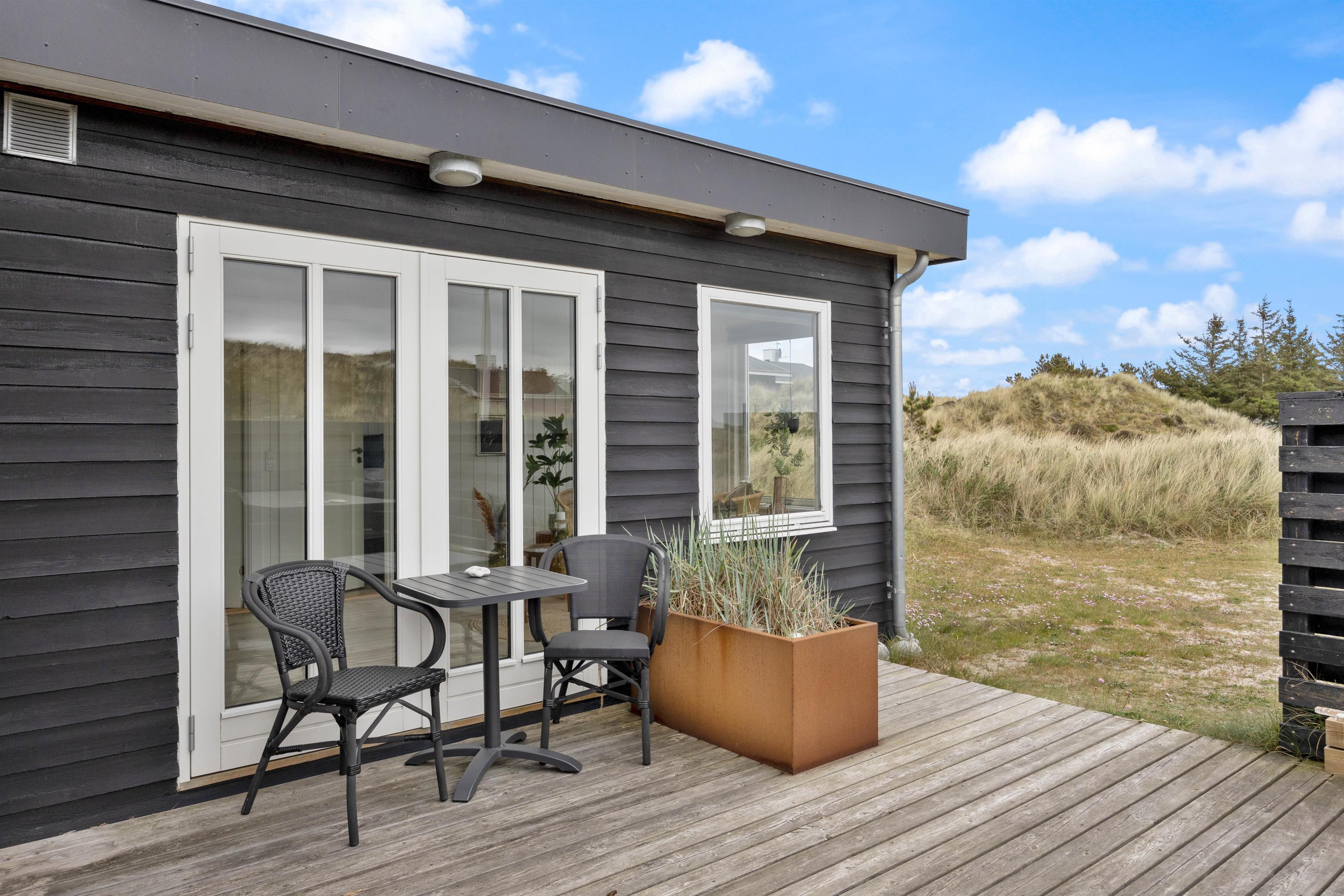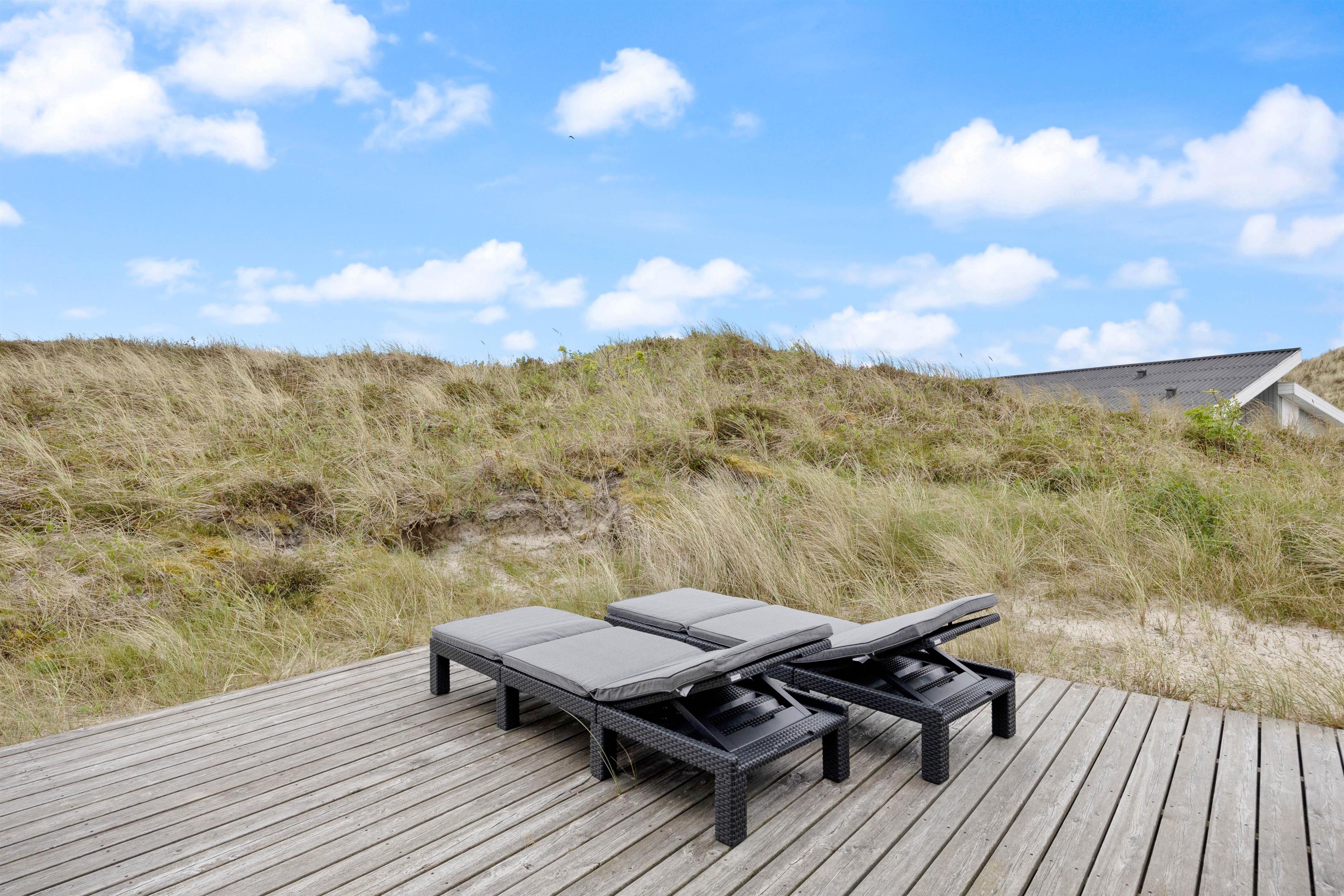 På den sydvestlige side af feriehuset er der en stor træterrasse, hvor I finder komfortable havemøbler. Omgivet af den 2200 kvadratmeter store natur- og klitgrund kan I her læne jer tilbage, nyde udsigten til naturen og læse jeres yndlingsbog.