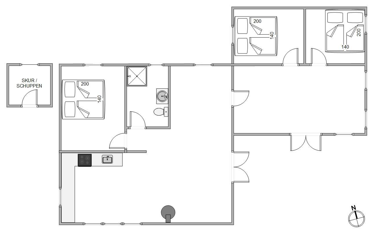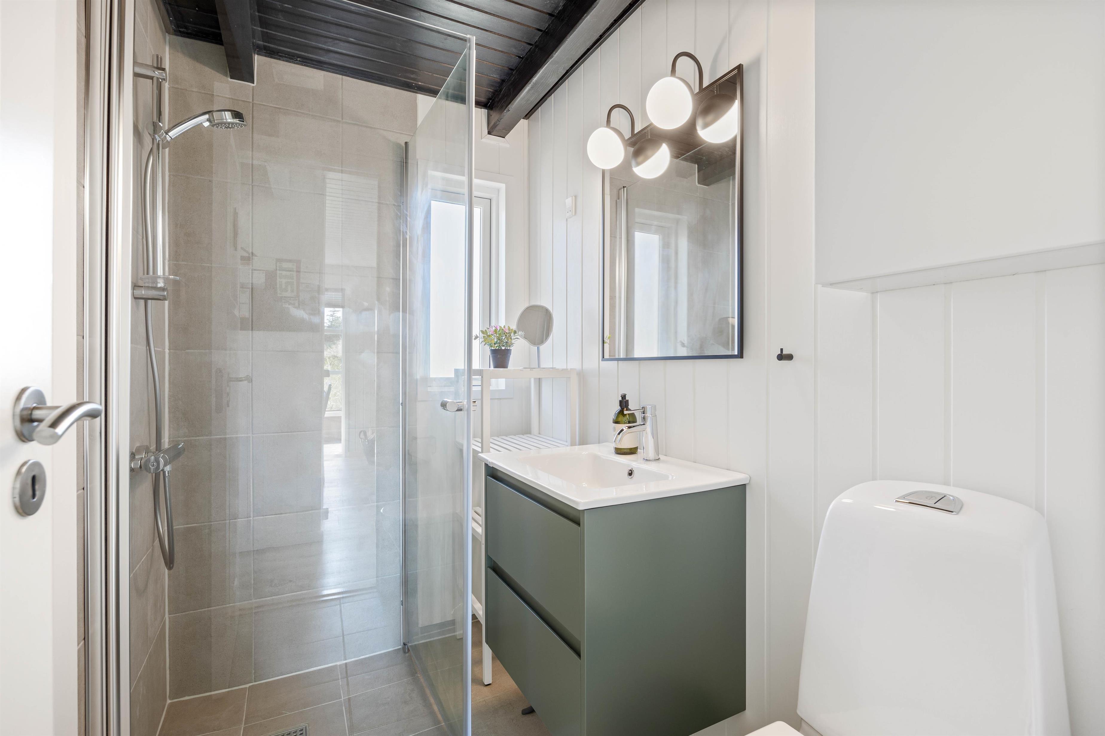 Sommerhuset har et fint badeværelse med gulvvarme, og I de 3 værelser med dobbeltsenge kan I få en god nats søvn.