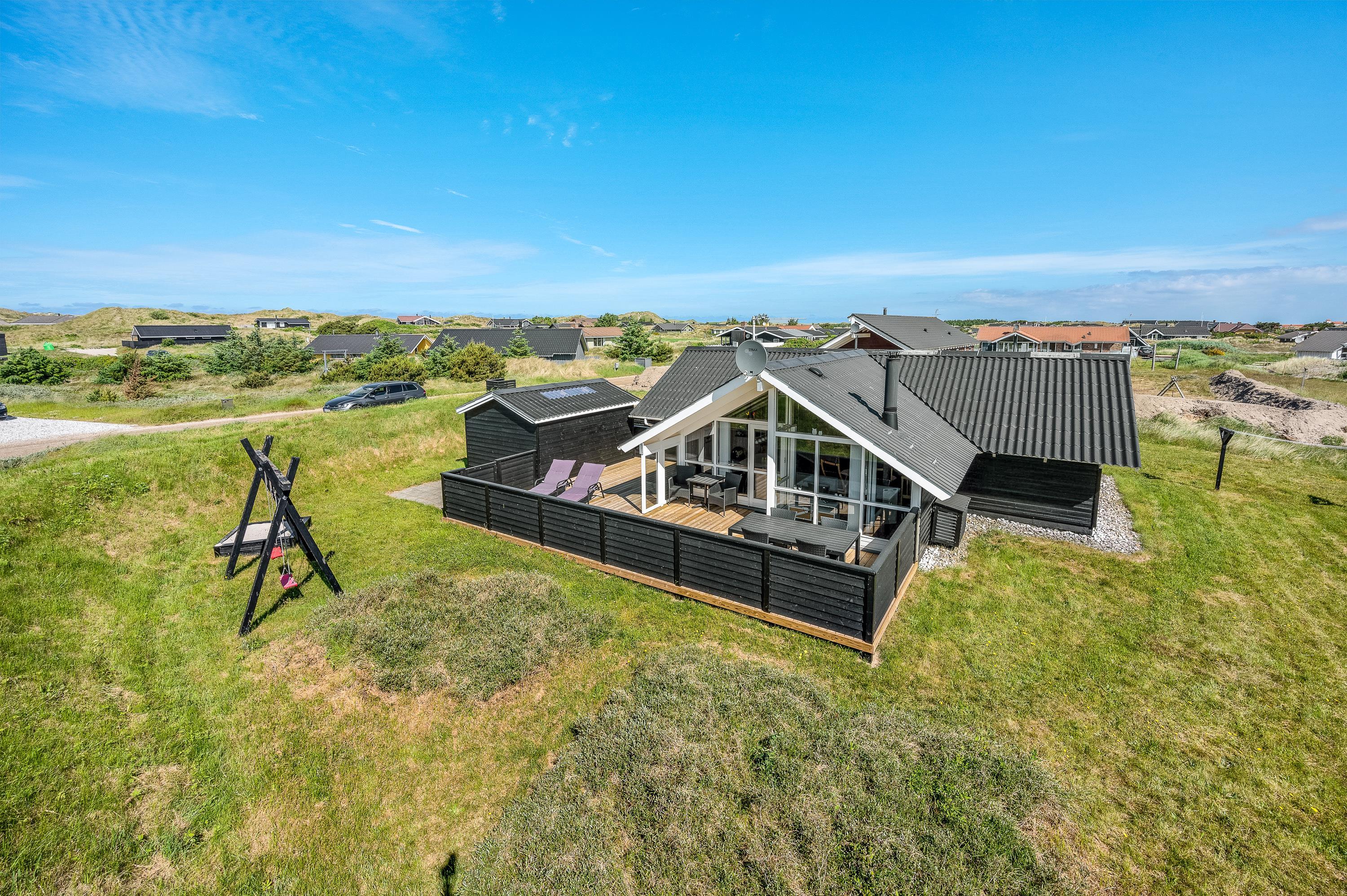 Til grillaftenerne er der en fliseterrasse, hvor du også kan sidde i læ for vinden. Børnene kan slå sig løs på naturgrunden og bruge gynge samt sandkassen. Cyklerne kan du opbevare i skuret.