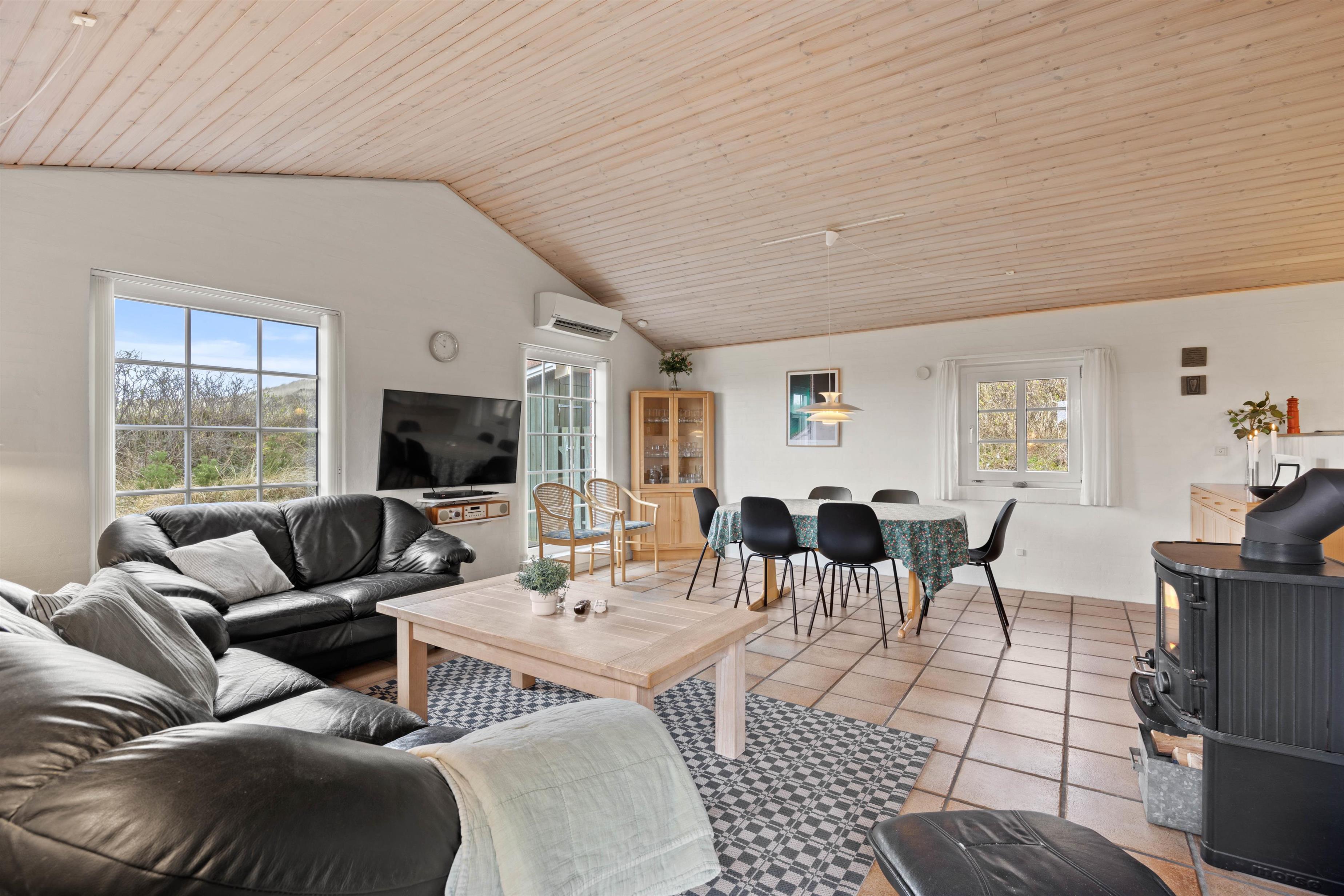 Hjerterummet er køkkenalrummet, der forener køkken, spiseafdeling samt stue. Her kan I sammen skabe nogle skønne ferieminder med fællesmiddage eller brætspilsaftner. Samtidig er det også her, at I kan koble fra og nyde ferien med en kop kaffe, en god bog eller film. Med et Chromecast har I nemlig mulighed for at streame alle jeres yndlingsfilm, mens brændeovnen knitrer i baggrunden. For et behageligt indeklima kan I gøre brug af den energibesparende varmepumpe.
