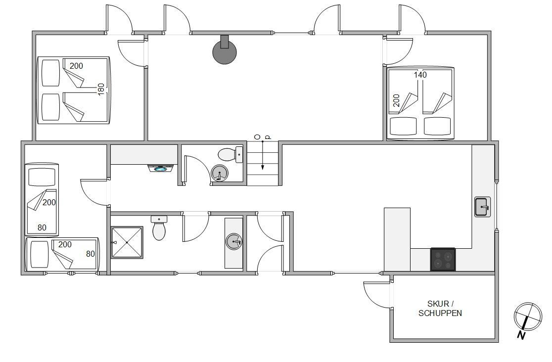 Her er plads til 6 personer, fordelt på 3 værelser, hvoraf 2 er med en dobbeltseng og det sidste værelse er med 2 enkeltsenge. Med både et gæstetoilet og et større badeværelse, undgår man kø, når der skal børstes tænder. Desuden sørger en kombineret vaskemaskine og tørretumbler for at man kan pakke let, når familien skal på ferie.