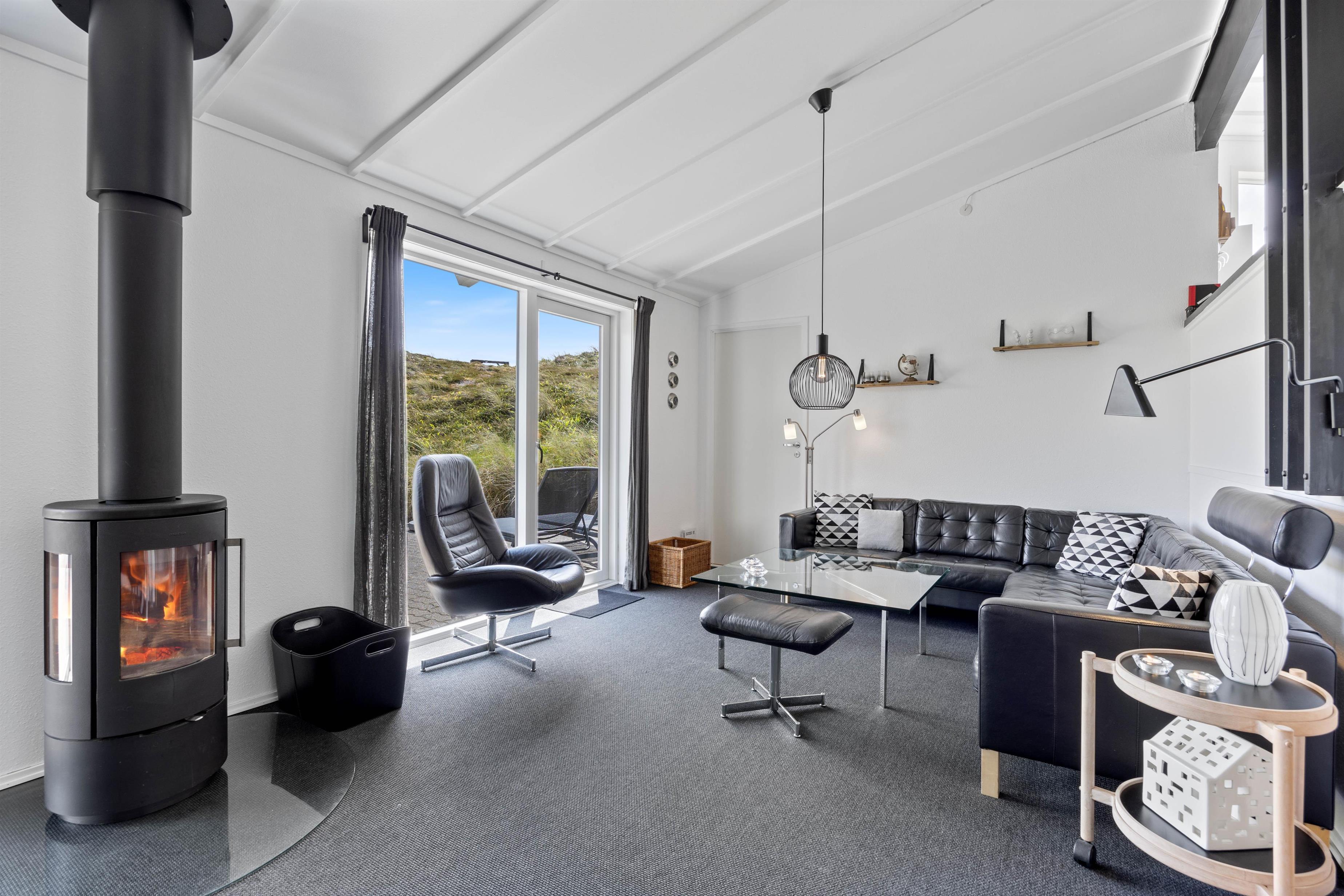 Stuen er hyggelig indrettet og med loft, der går op i kip. På de køligere dage kan man tænde op i brændeovnen og hygge sig med en god bog i sofaen, alt imens ”naturen næsten kommer ind i stuen”. Man har her en fantastisk udsigt mod syd, udover det storslåede klitlandskab.