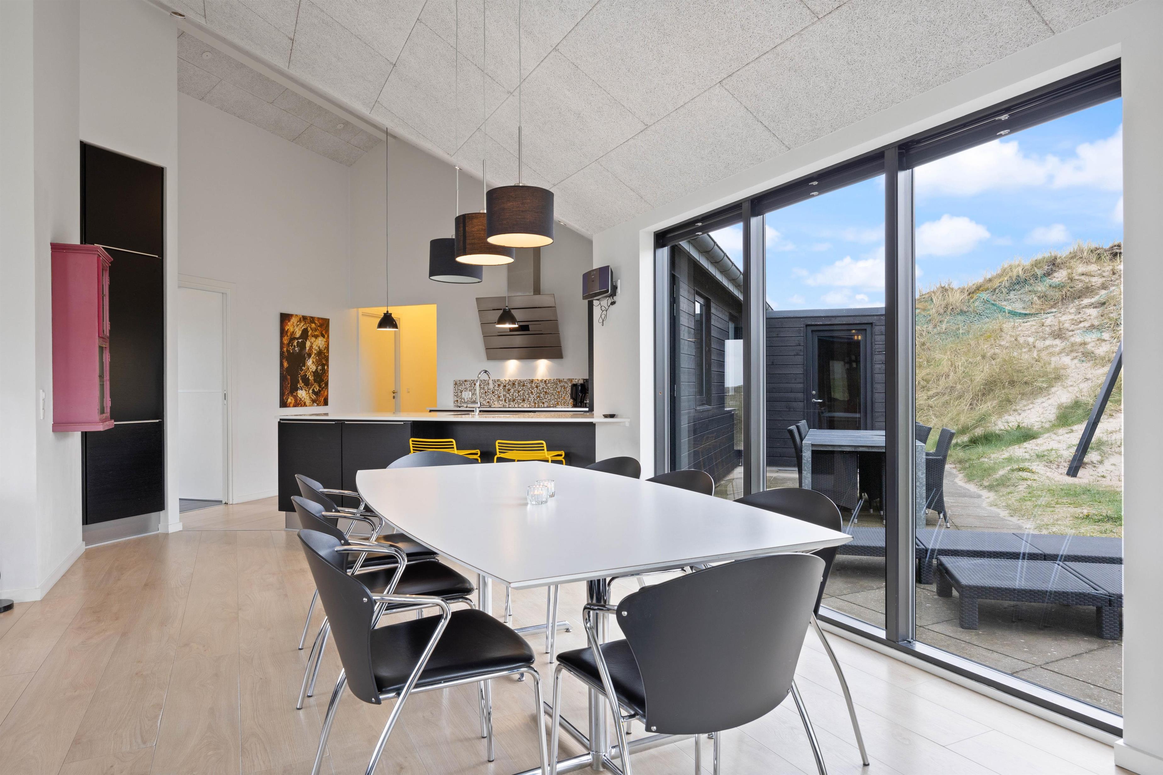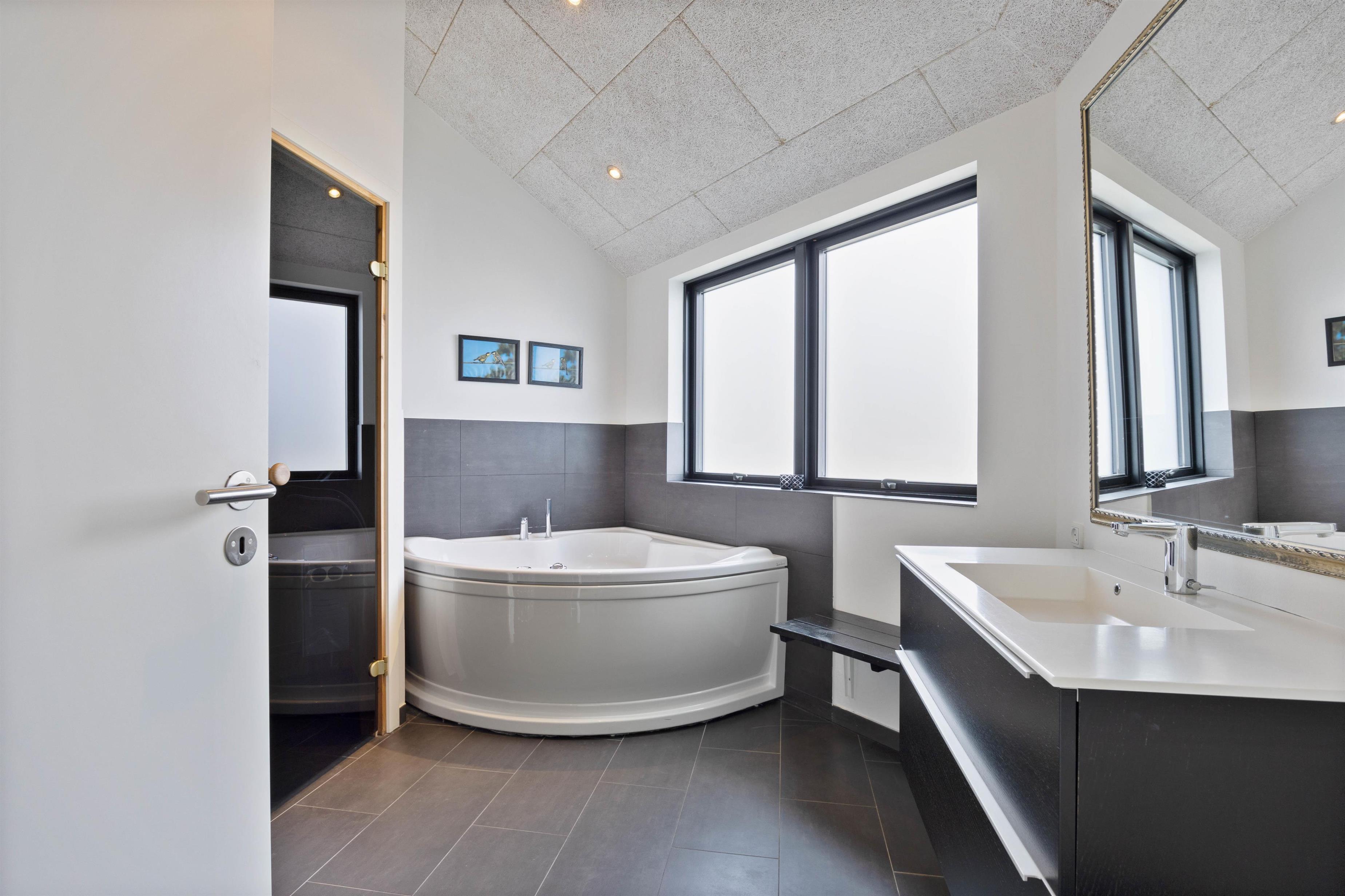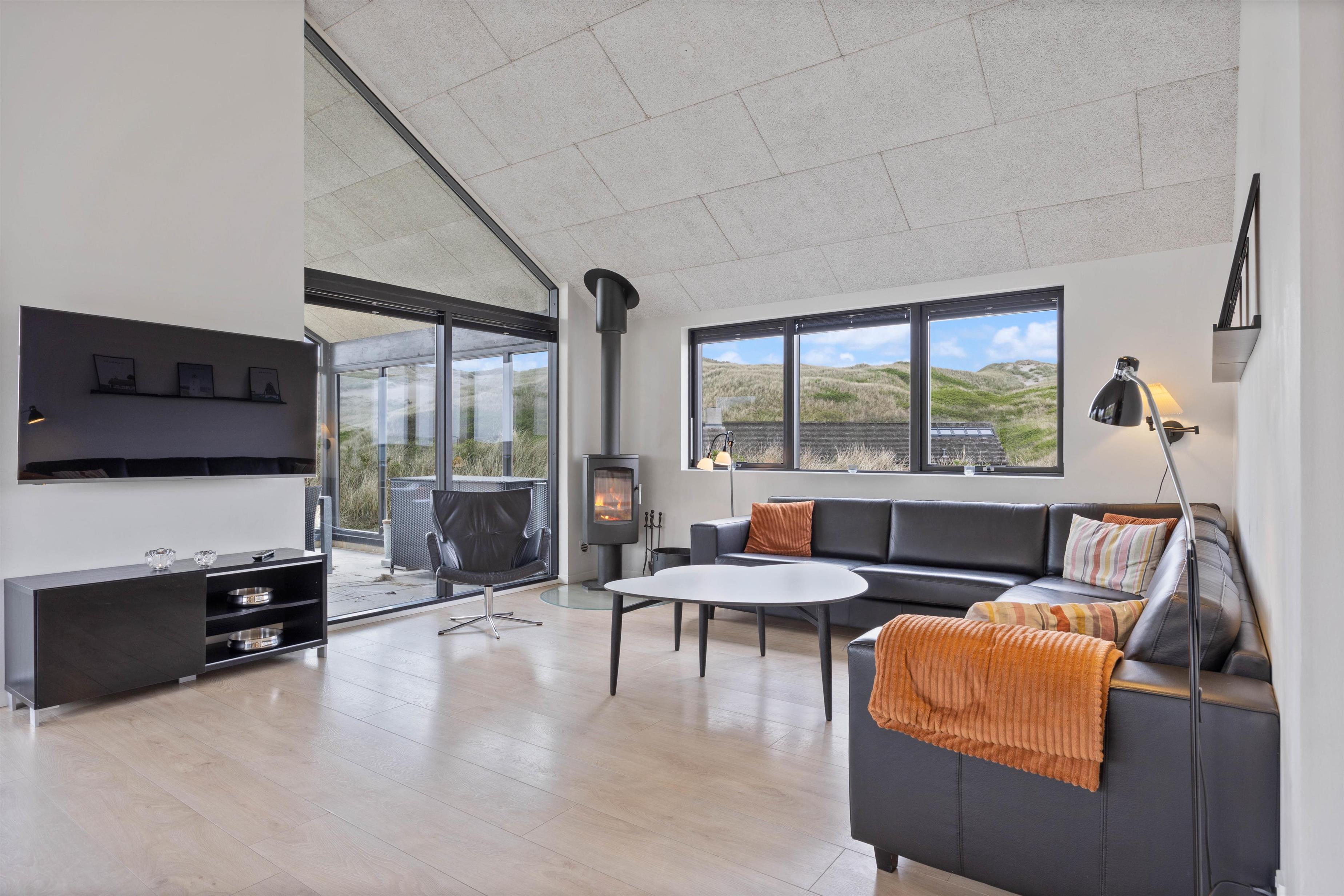 Feriehuset er lyst og lækkert med store vinduer med panoramaudsigt over den smukke natur, højt til loftet og velindrettet med enkle farver. Op mod syv feriegæster og deres to firebenede venner kan her få en skøn ferie, hvor der er plads til familien, store som små. Her er fire gode soveværelser, hvoraf to er med dobbeltseng, fladskærms-TV og med egne badeværelser, ét værelse har to enkeltsenge og det sidste værelse én enkeltseng. Alle værelser har trægulve med gulvvarme. Feriehuset byder også på et stort tredje badeværelse, hvor I for alvor kan koble af og komme ned i gear. Her venter spaens varme boblende vand og saunaen efter en gåtur ved det brusende Vesterhav. Her finder I også vaskemaskine og tørretumbler, som er praktisk og fleksibelt særligt for børnefamilien.