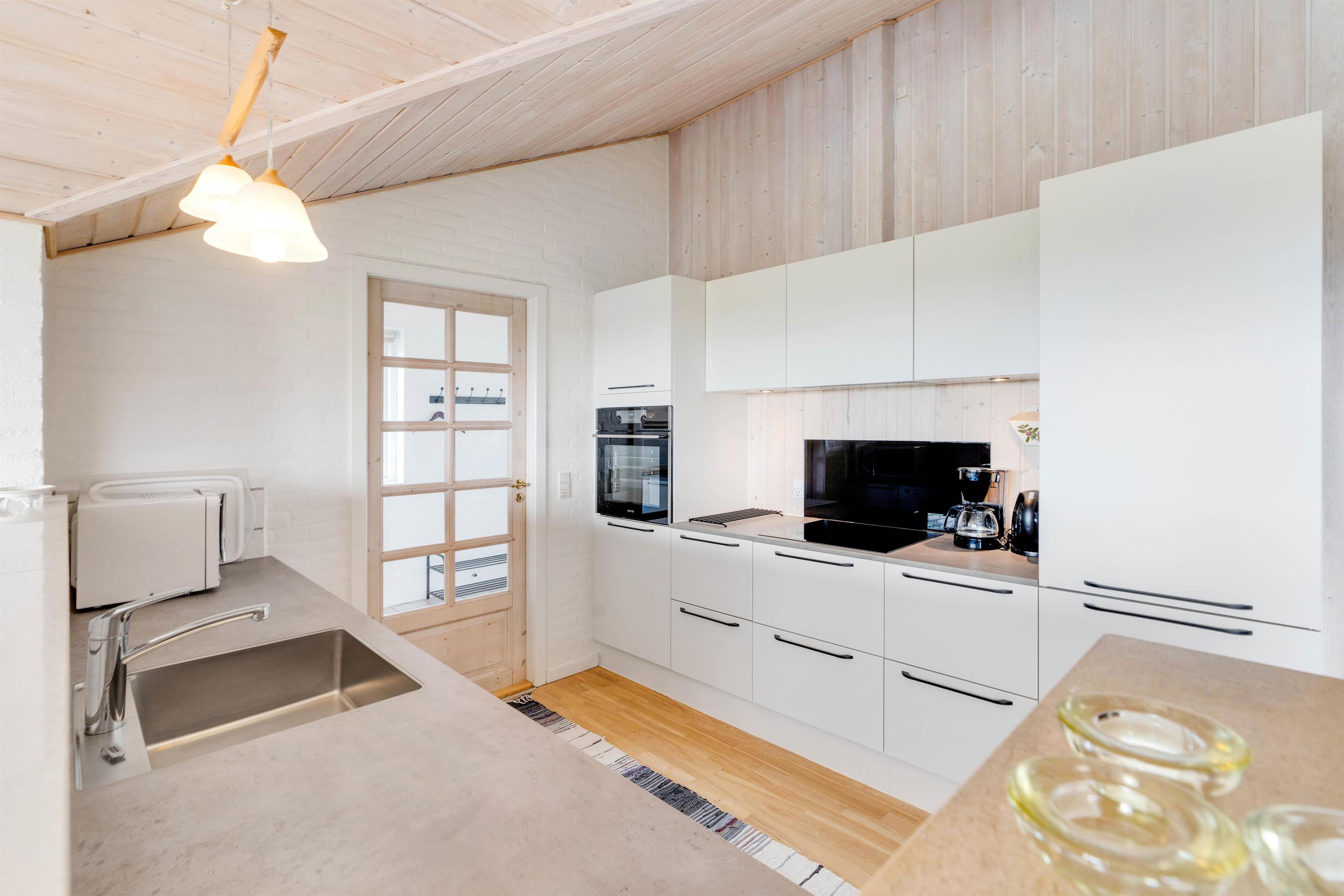 Køkkenet ligger i åben forbindelse med stue- og opholdsrummet, hvor I også finder et TV med chromecast og en brændeovn, som spreder dejlig varme. Køkkenet er lyst, pænt og har rigtig god bordplads.