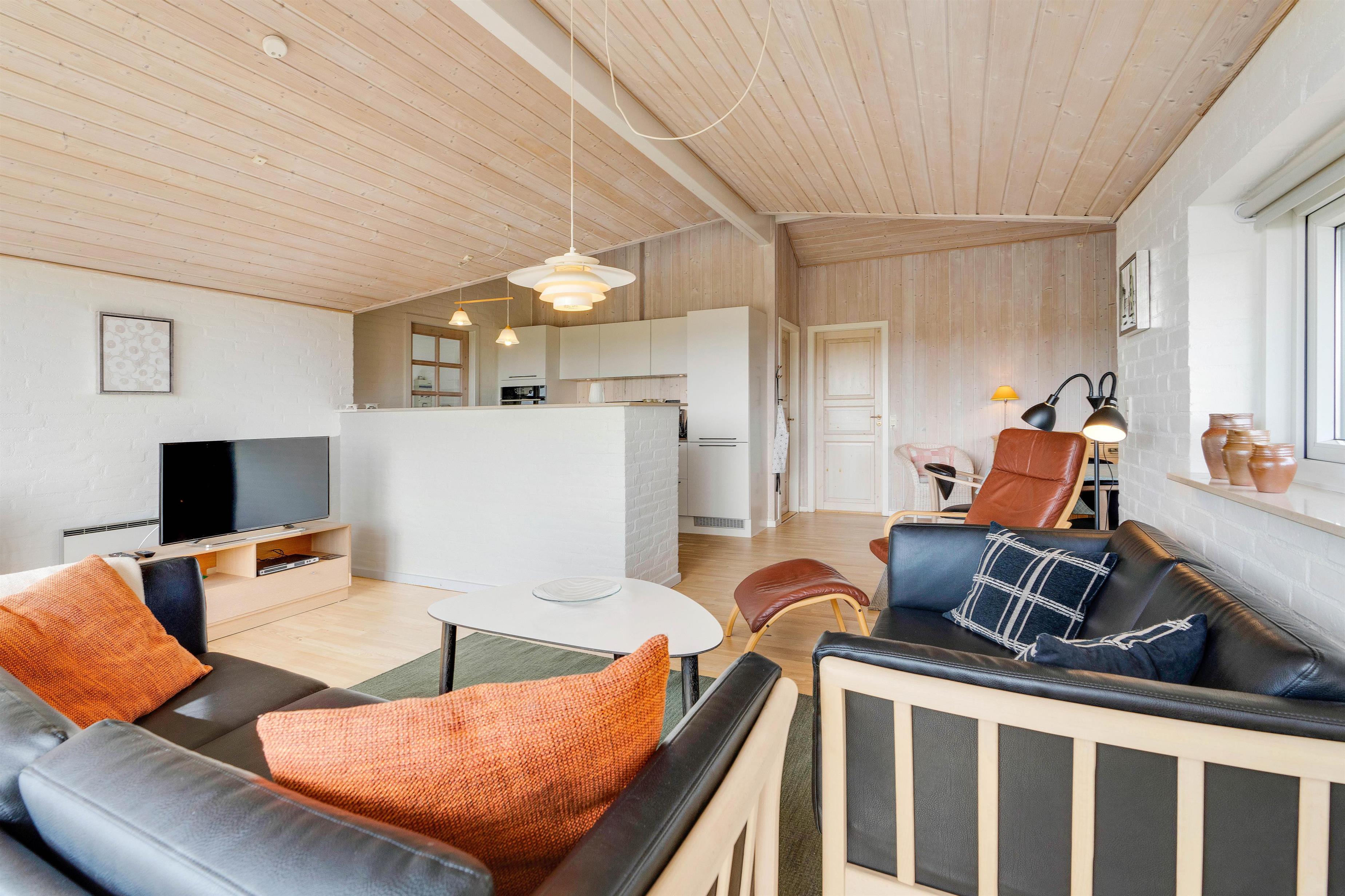 Alt i sommerhusets indretning fremstår indbydende. Vægge og lofte er holdt i helt lyse og sarte nuancer. Samtidig går loftet til kip i stuen, hvilket skaber en rigtig god følelse af rumlighed i rummet. De store vinduespartier ved terrasseområdet sørger samtidig for at invitere en masse lys indenfor, som er med til at forstærke effekten.