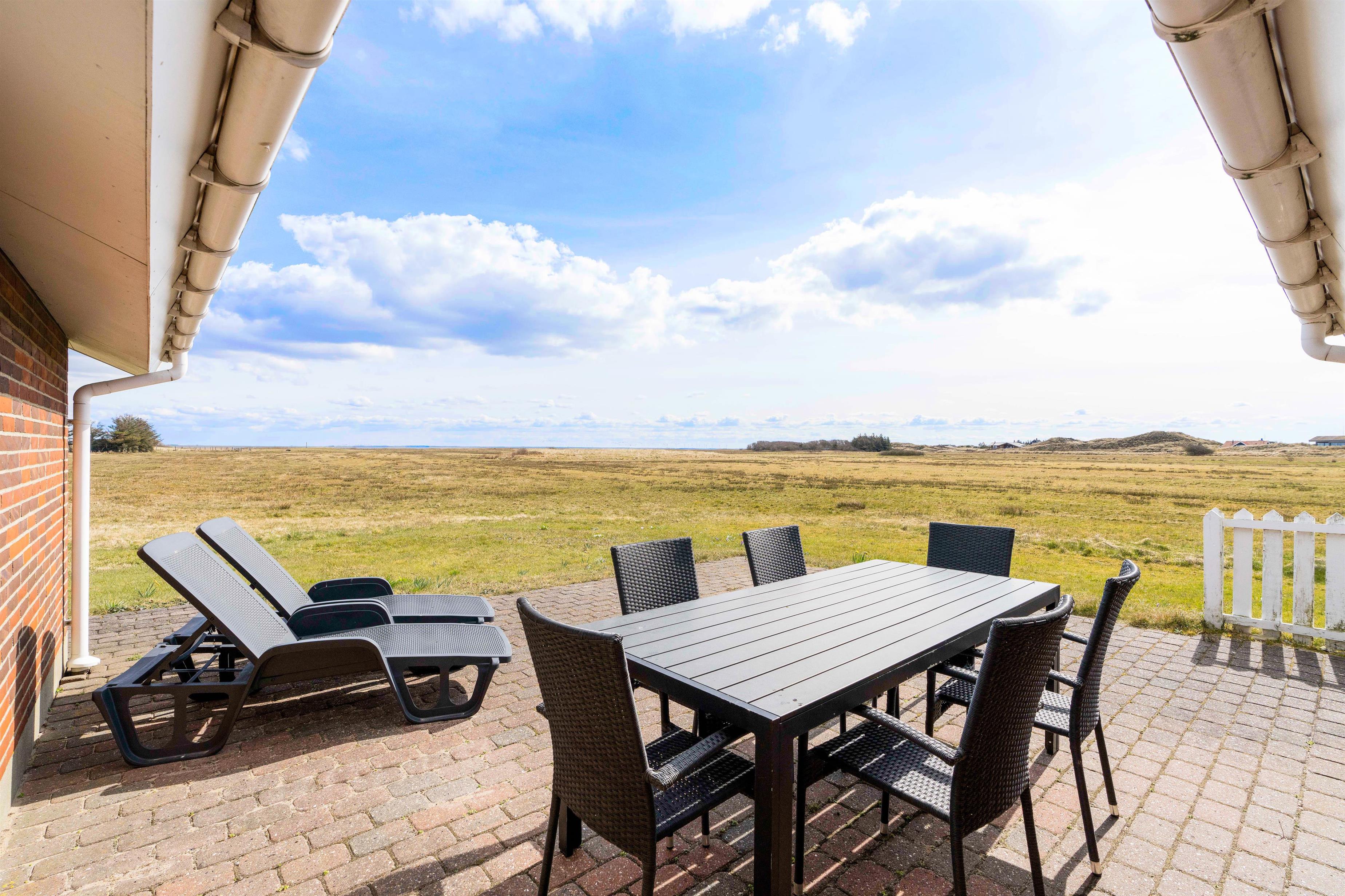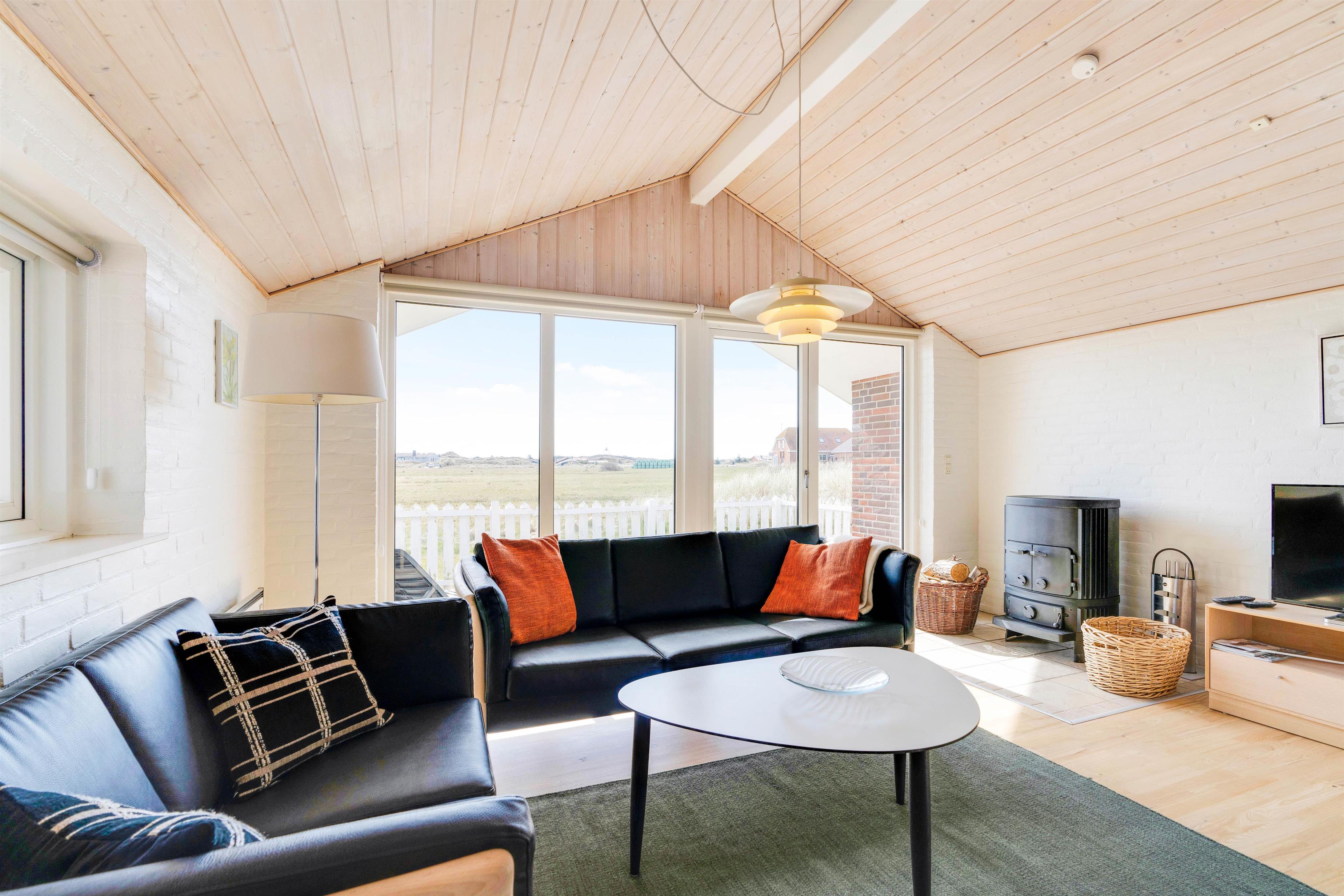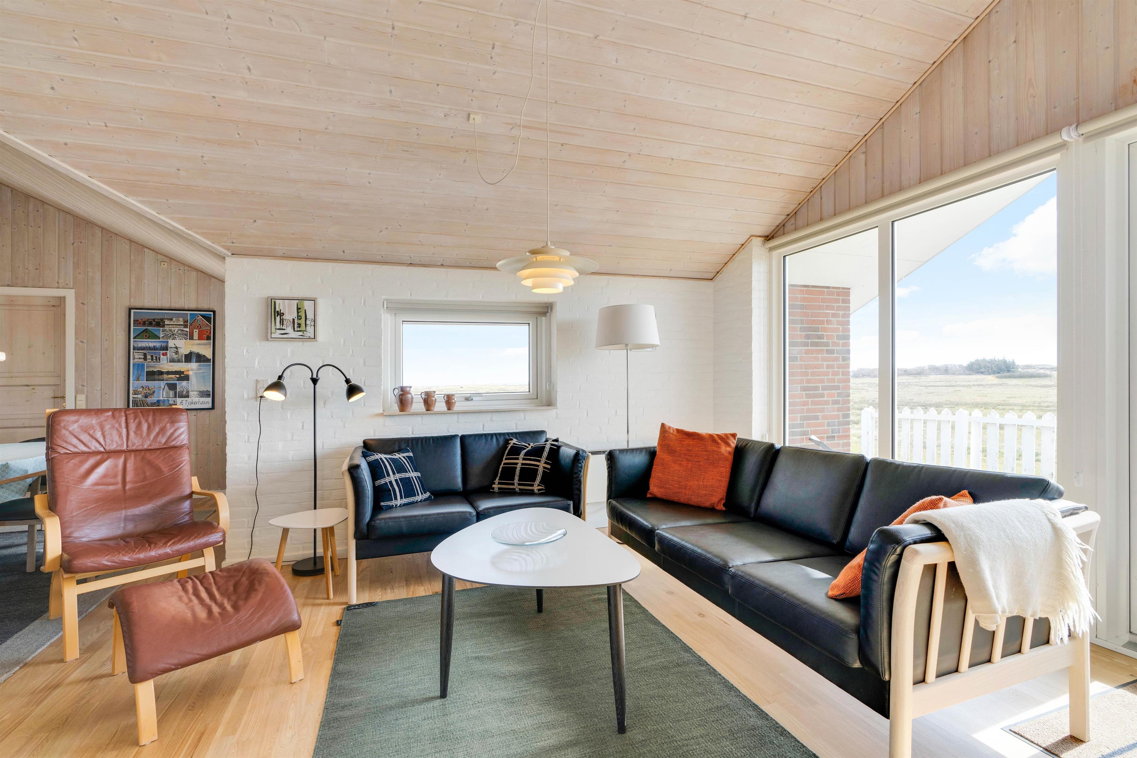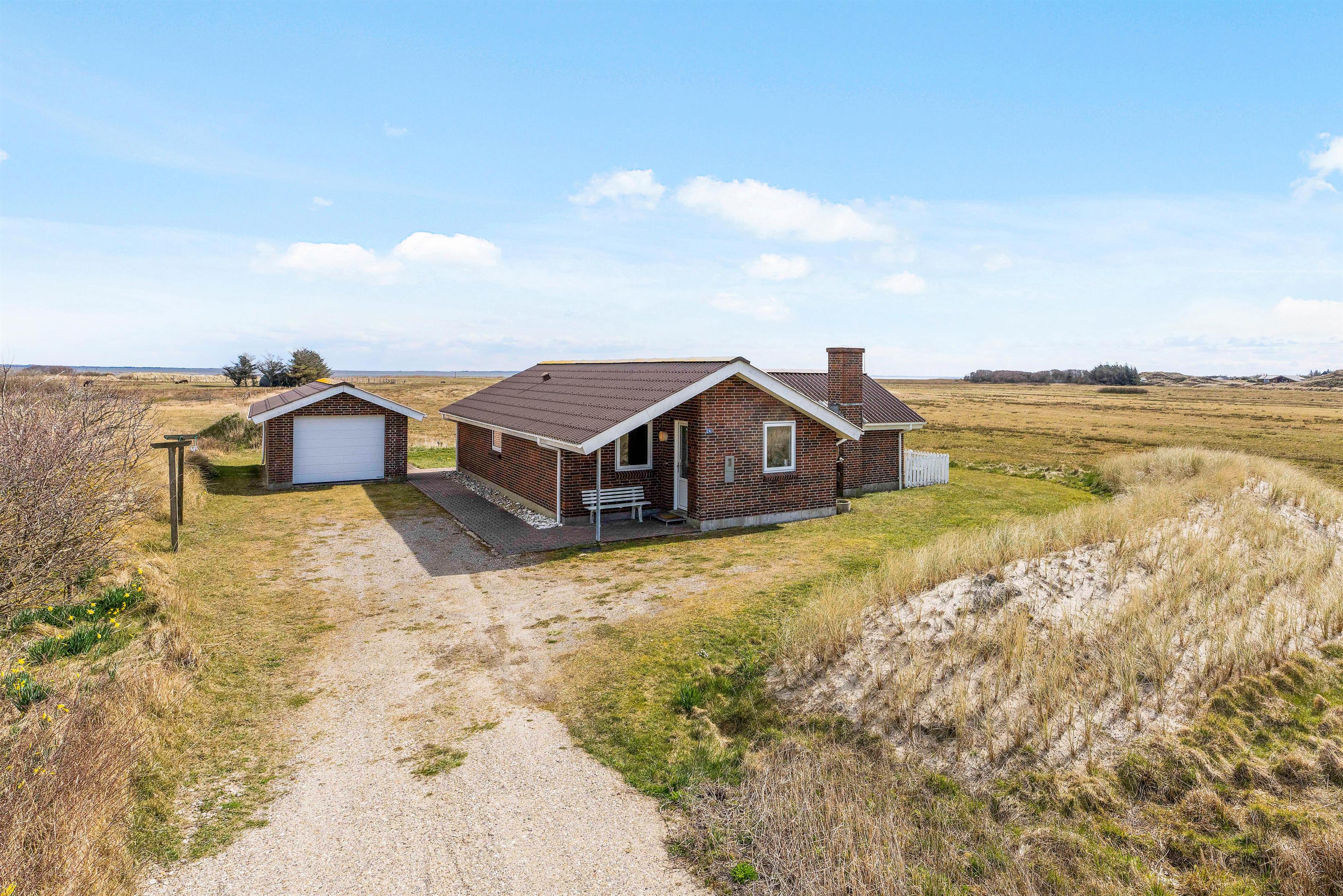 Fra feriehusets stue er der udgang til terrasseområdet. Det er her forårs- og sommerlivet leves med udsigt til det flotte engområde, der breder sig ned mod Ringkøbing Fjord. Til sommerhuset hører desuden en garage, så bilen kan parkeres i læ for vind og vejr.