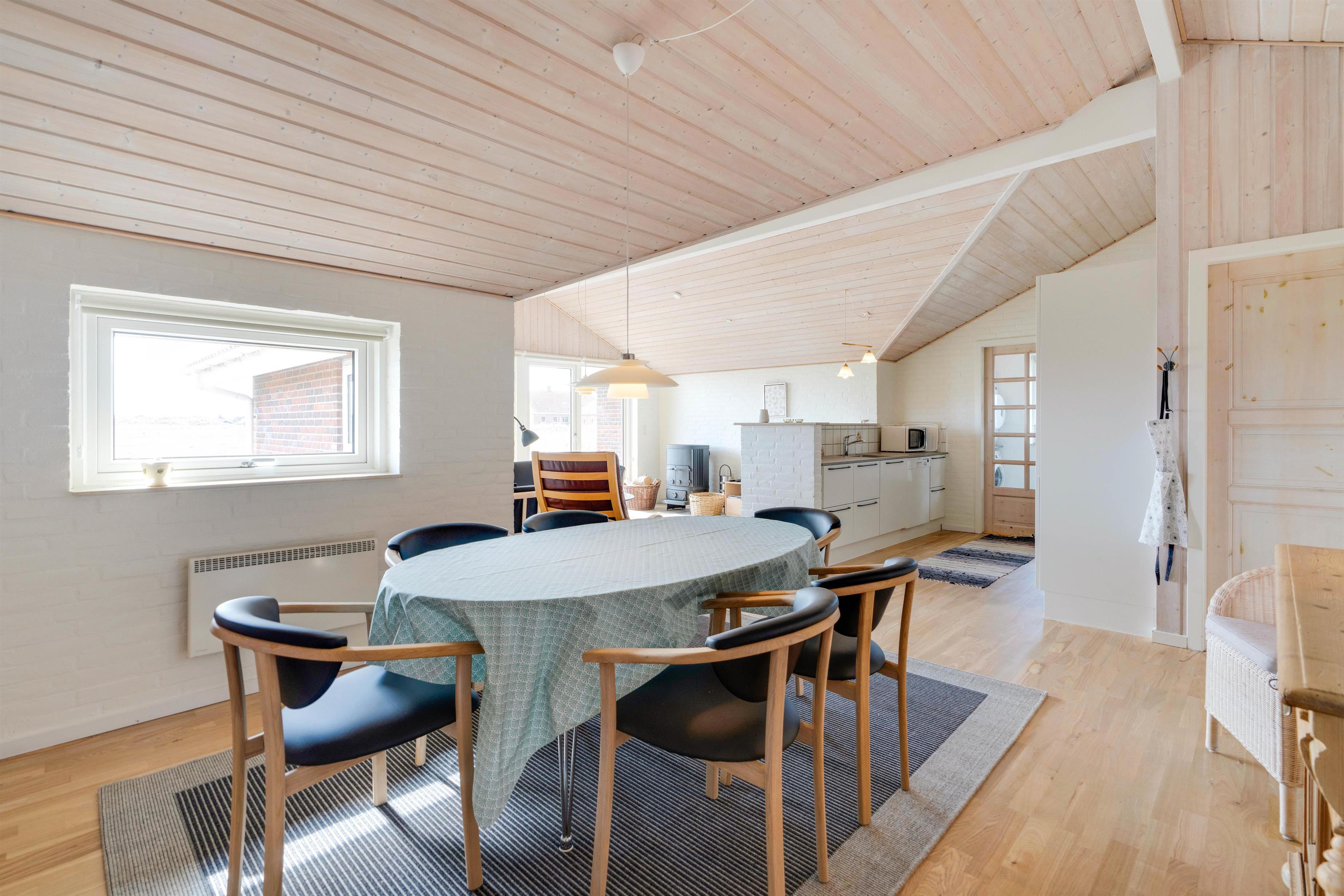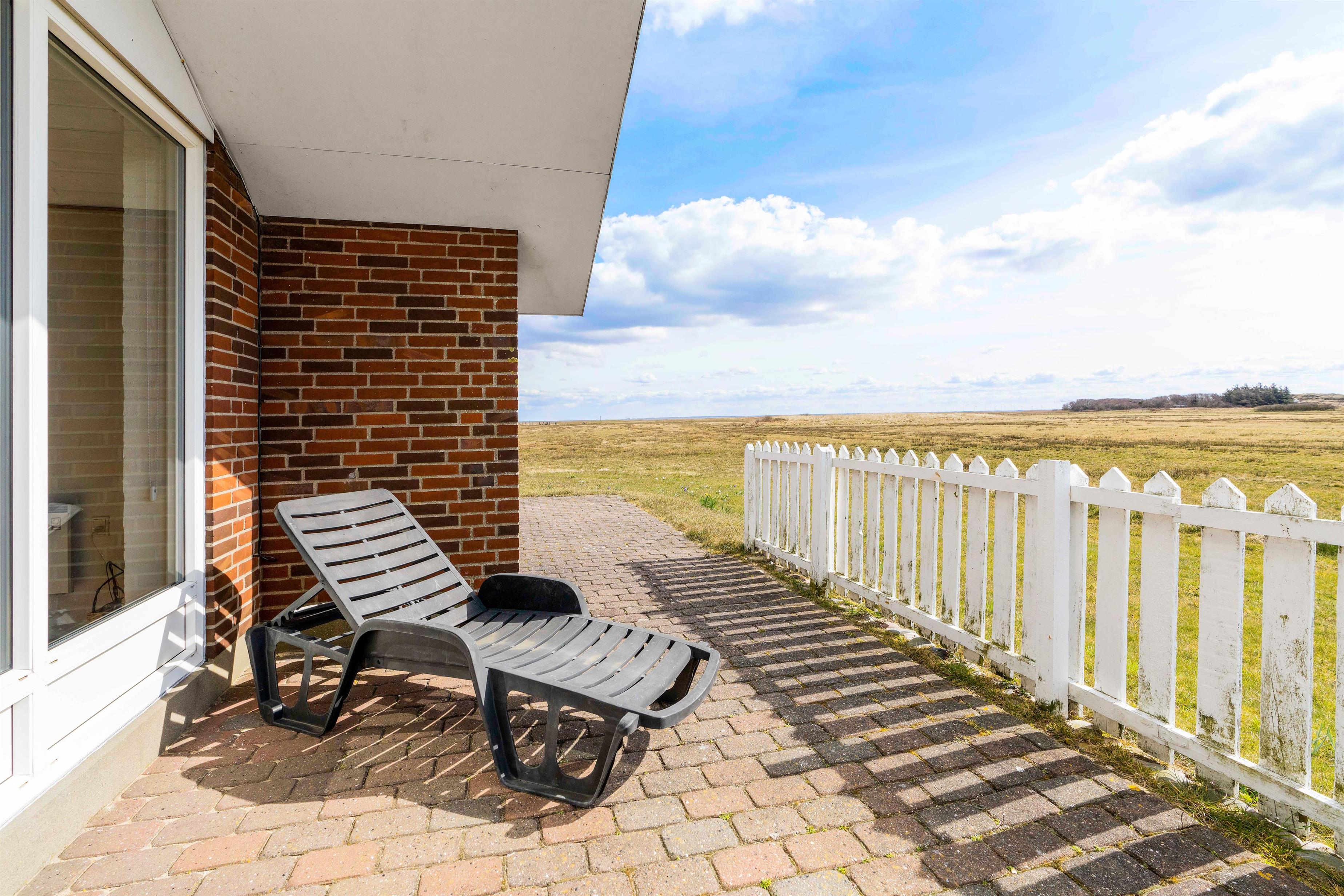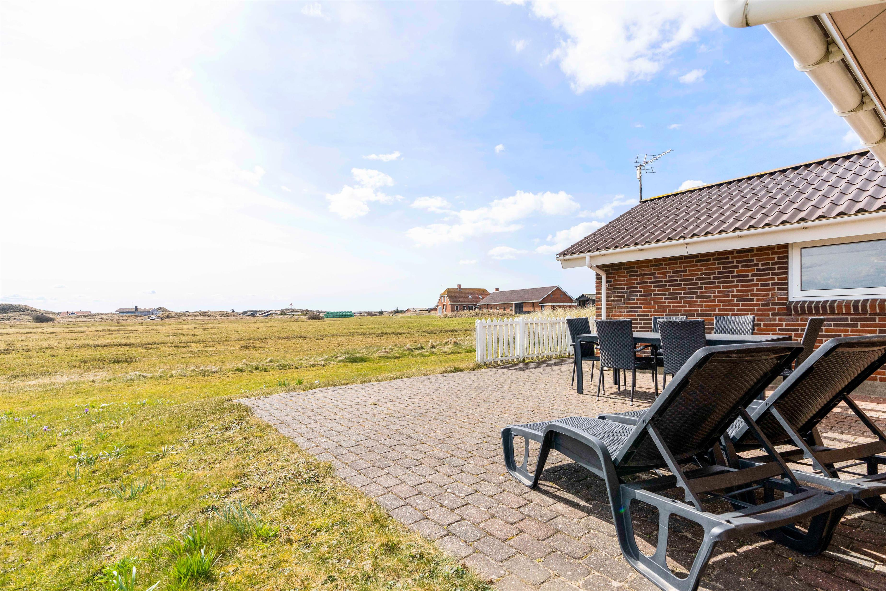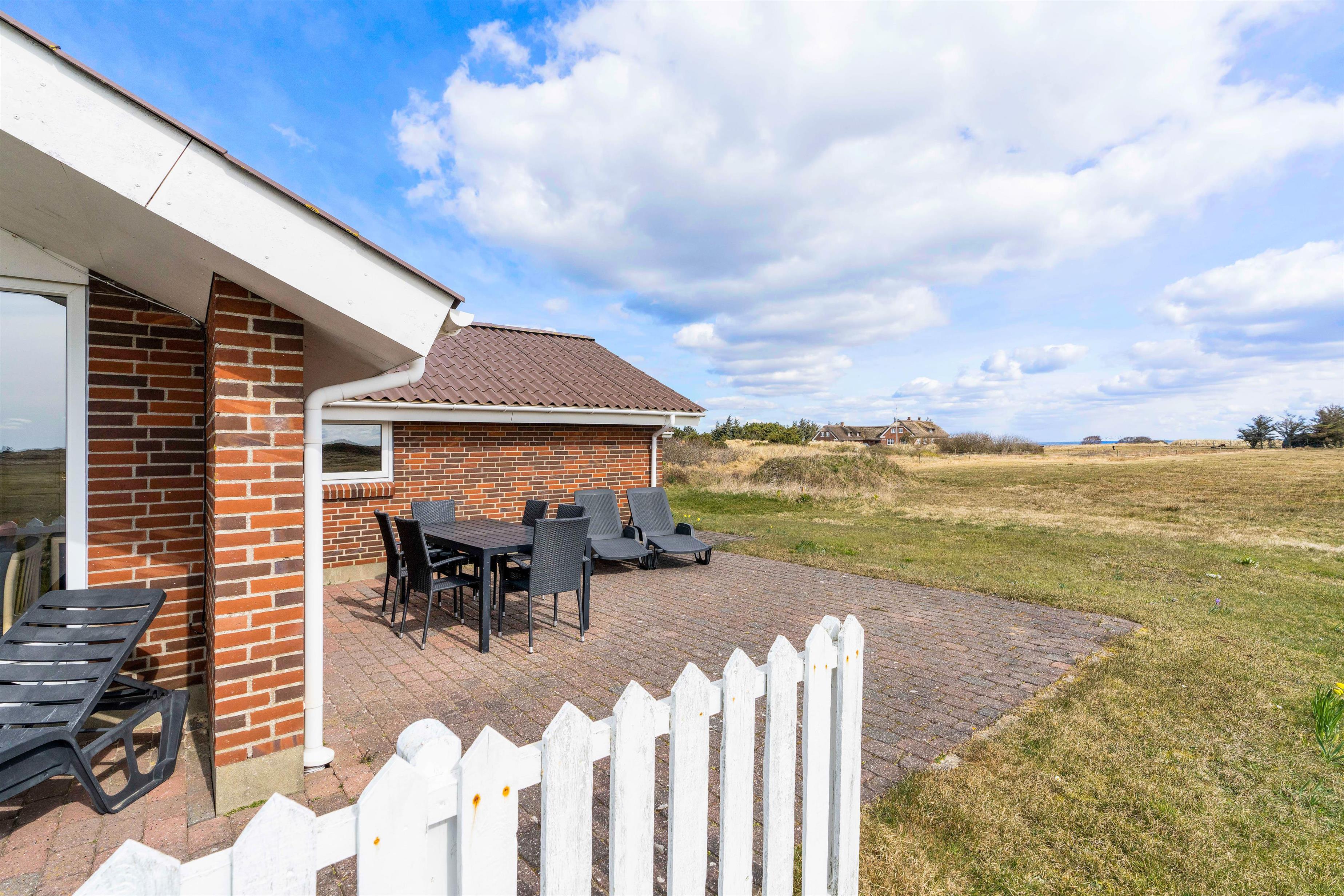 Fra feriehusets stue er der udgang til terrasseområdet. Det er her forårs- og sommerlivet leves med udsigt til det flotte engområde, der breder sig ned mod Ringkøbing Fjord. Til sommerhuset hører desuden en garage, så bilen kan parkeres i læ for vind og vejr.