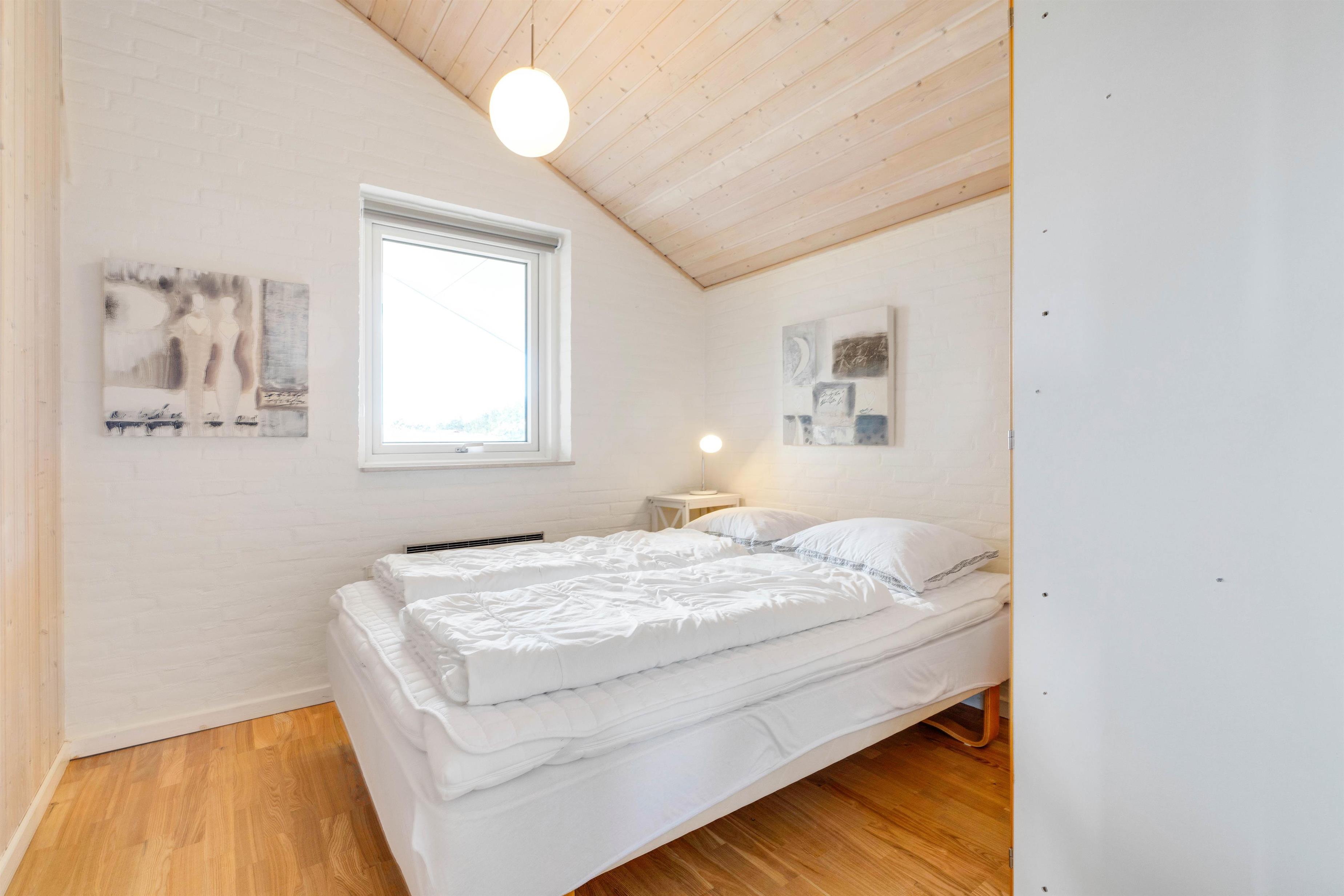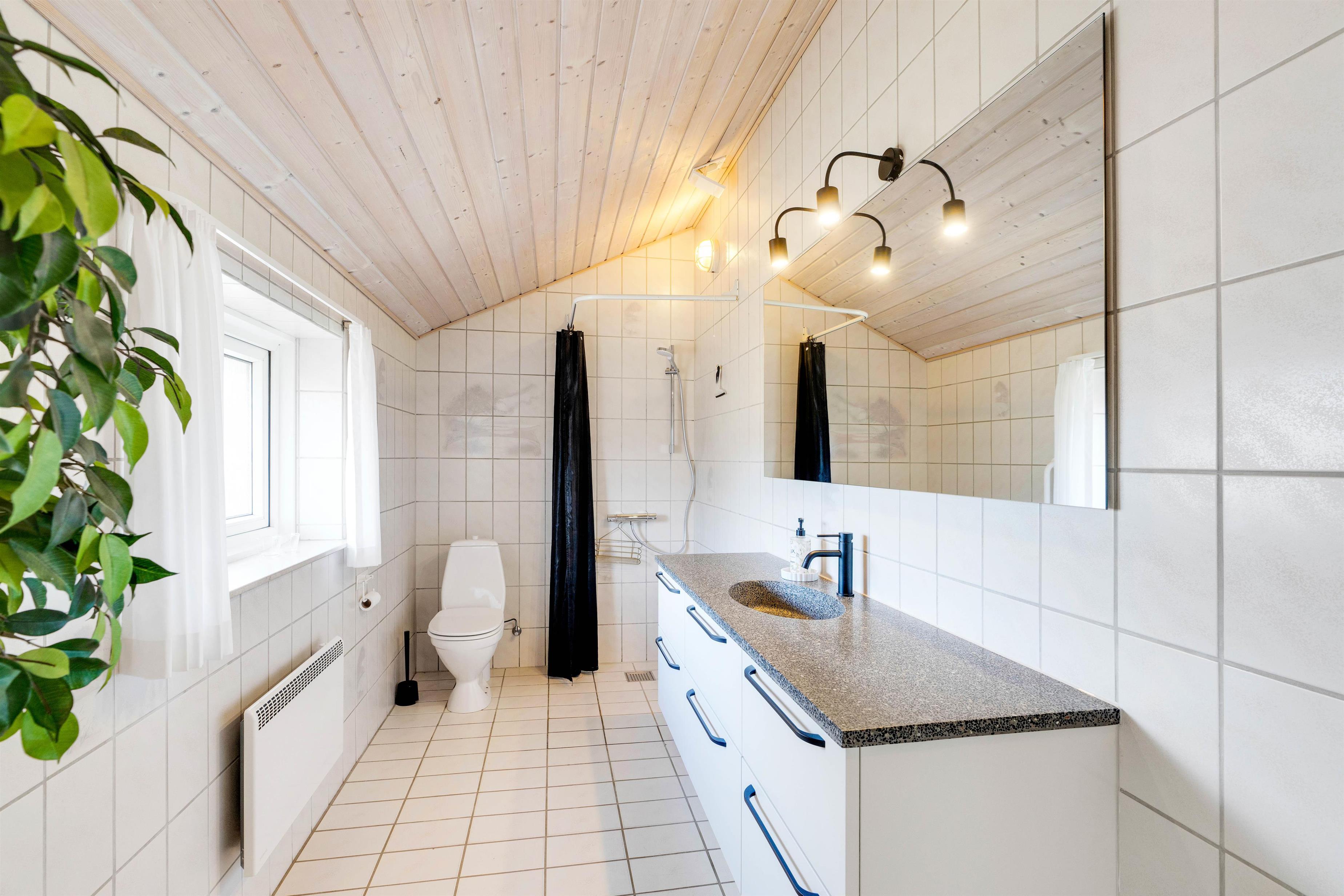 Sommerhuset har 3 soverum, som alle er med dobbeltseng. Derudover er her et fint badeværelse med gulvvarme samt et lille bryggers med vaskemaskine og tørretumbler.
