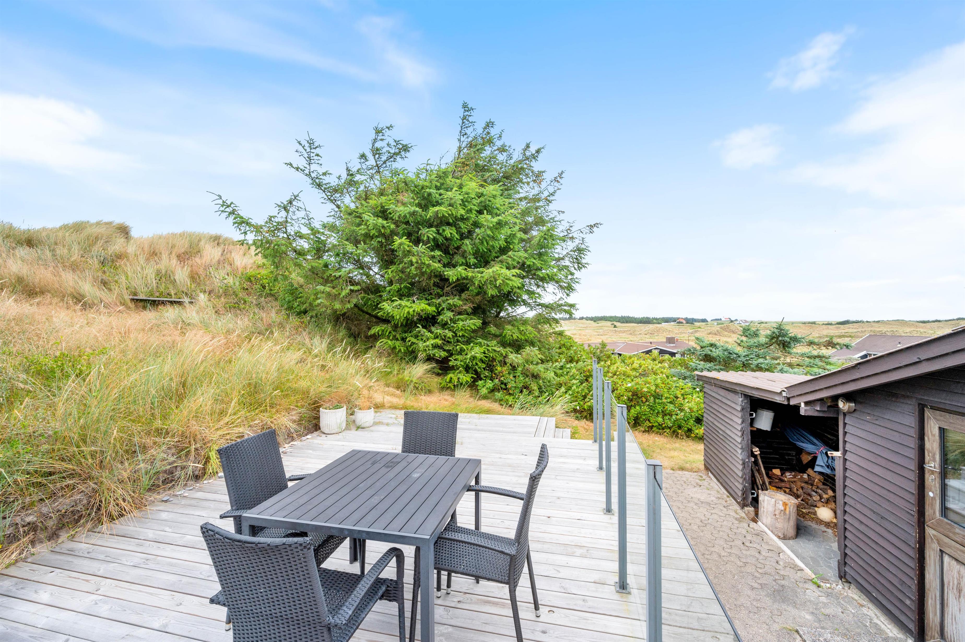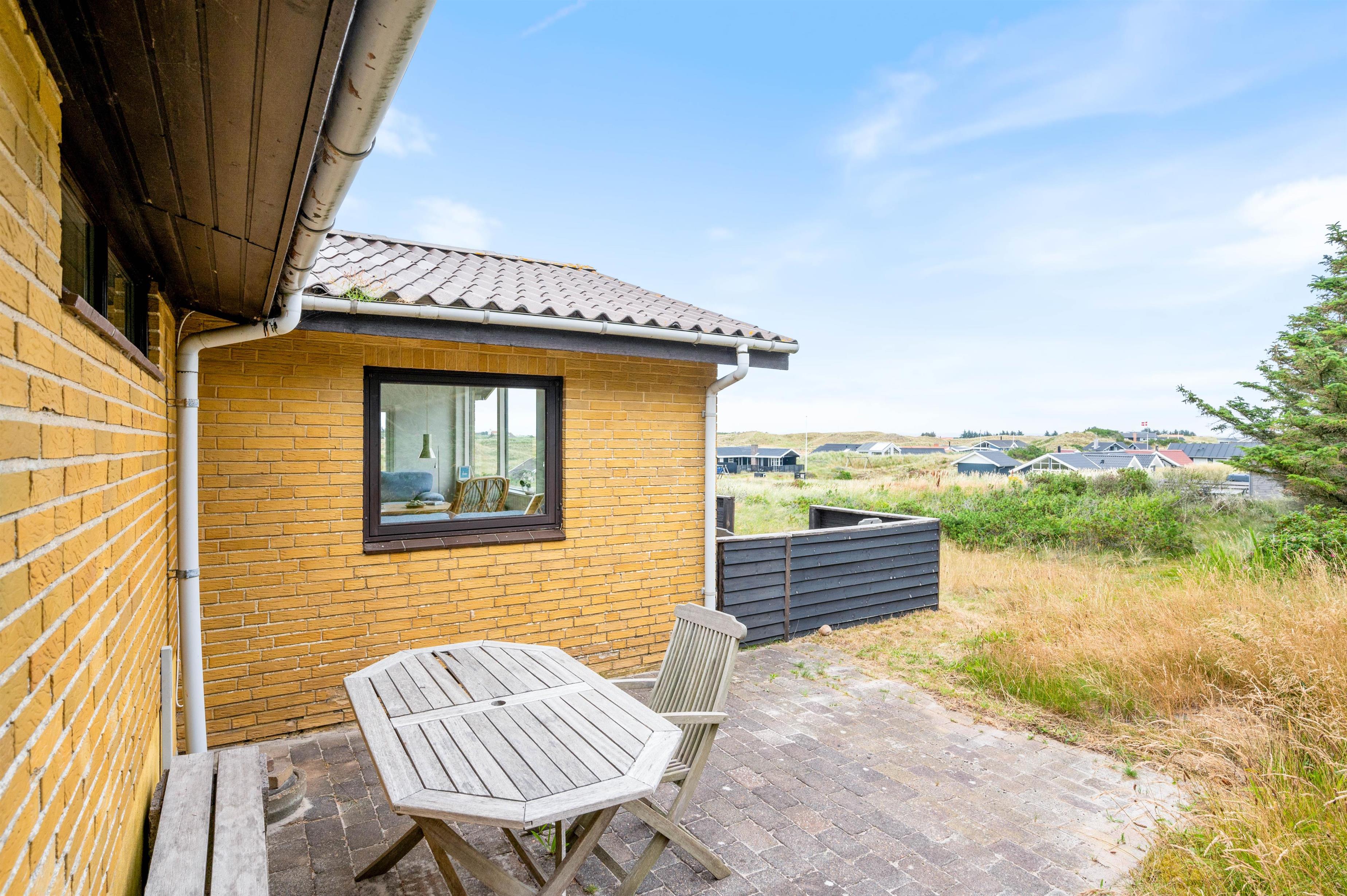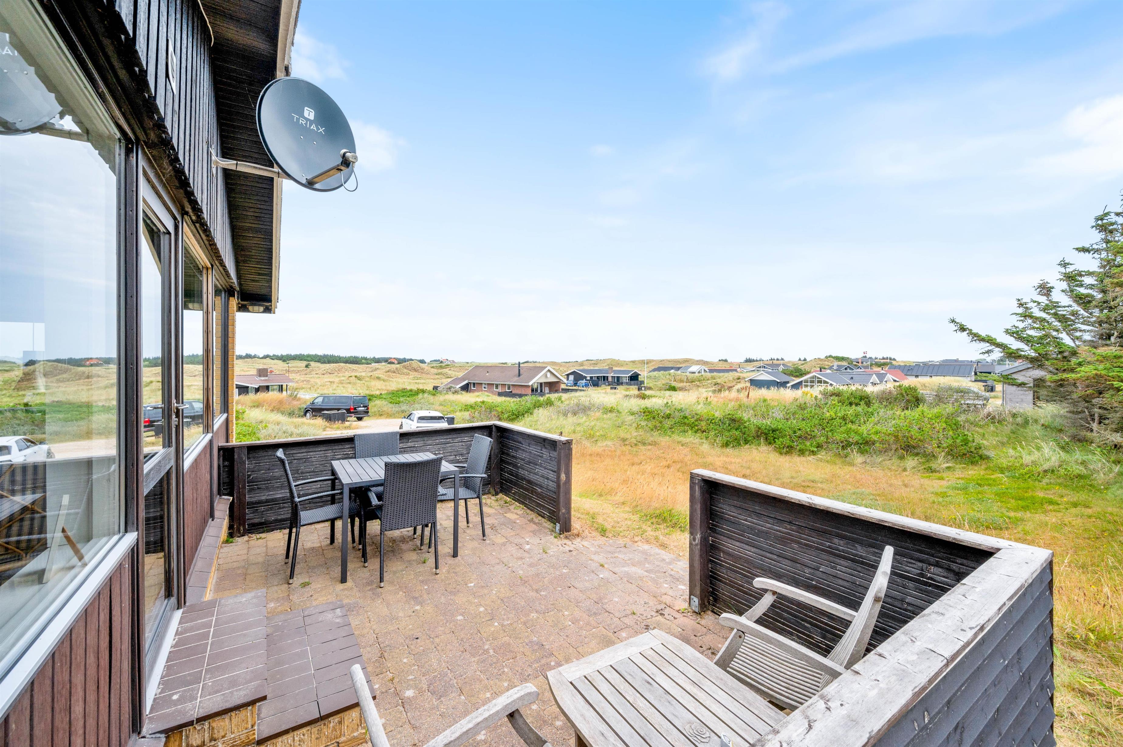 Fra stuen er der udgang til en lille fin terrasse, hvor morgenkaffen kan nydes til solopgangen over Ringkøbing Fjord. På vestsiden af feriehuset er der bygget en forhøjet terrasse ind i klitten, så I også her helt ugeneret kan nyde udsigten – og samtidigt sidde i læ. Nyd en lækker grillmiddag, mens dagens sidste solstråler forsvinder bag klitten og farver himlen orangerød.