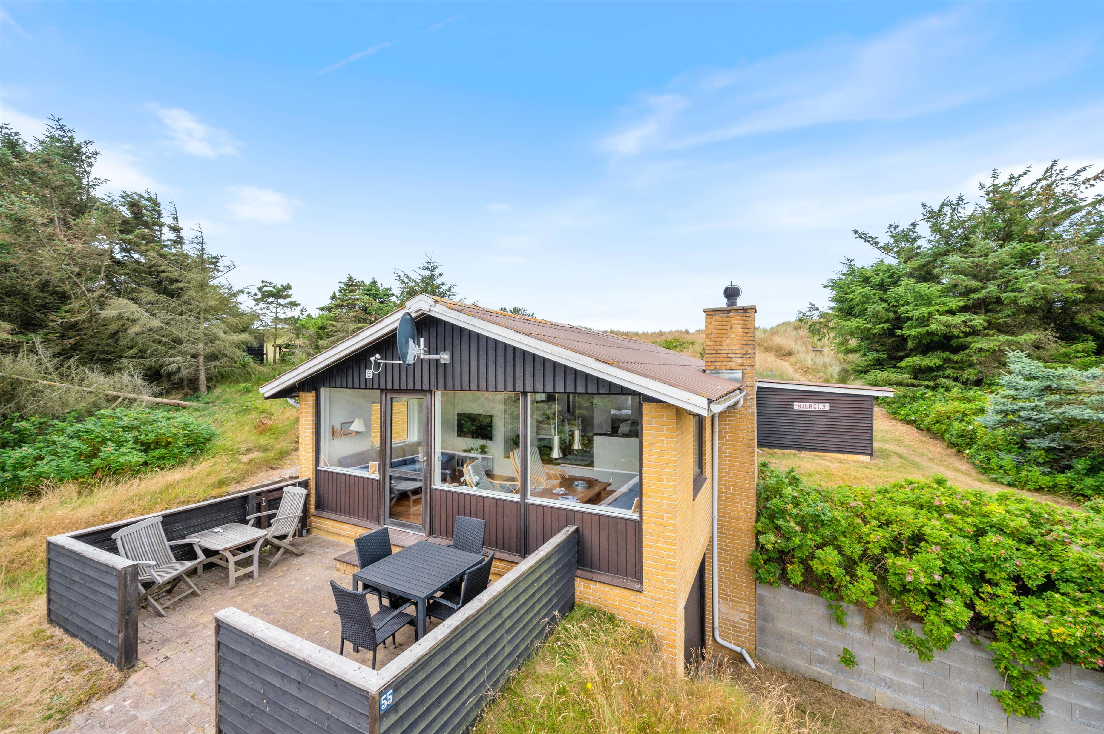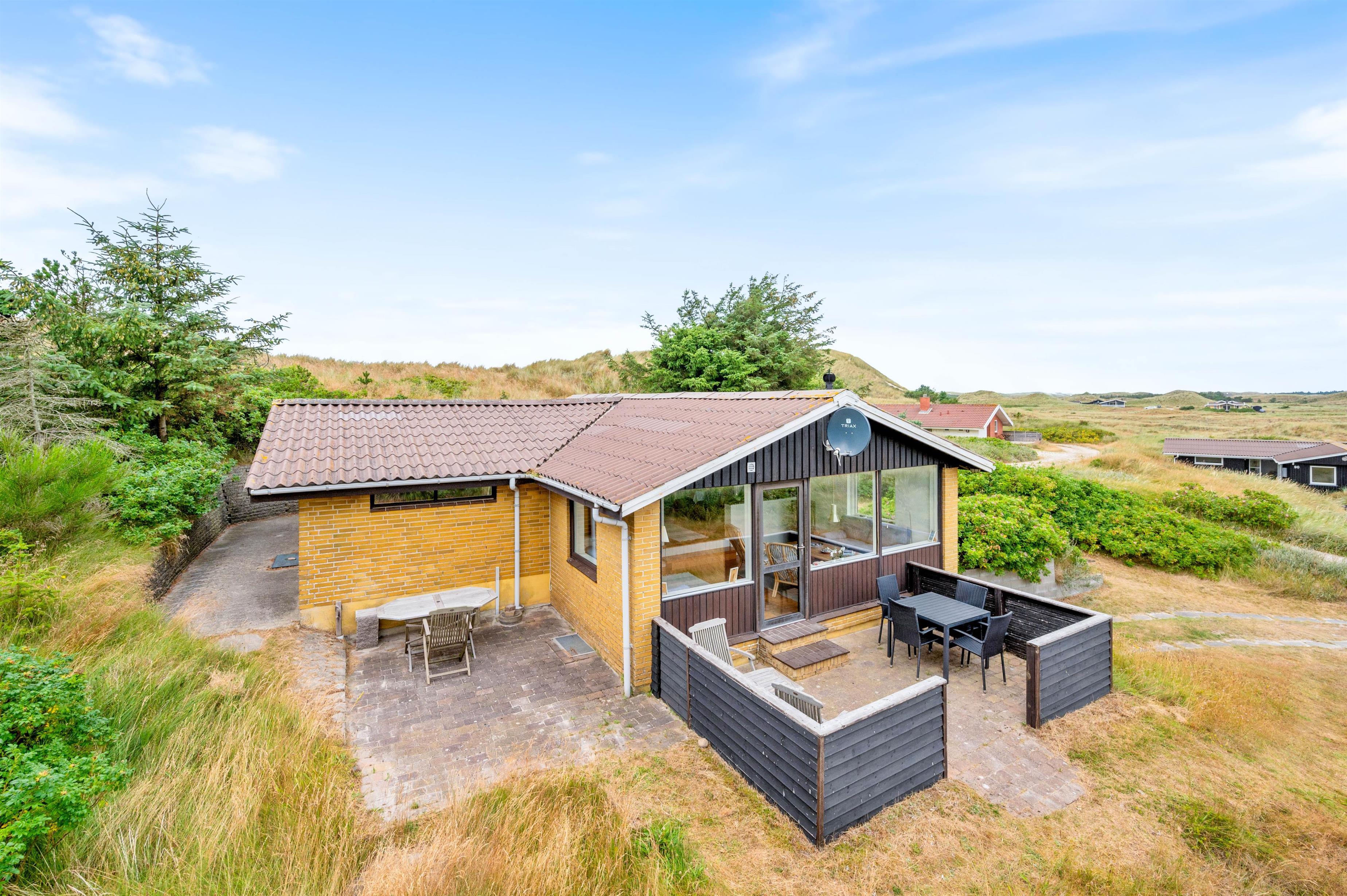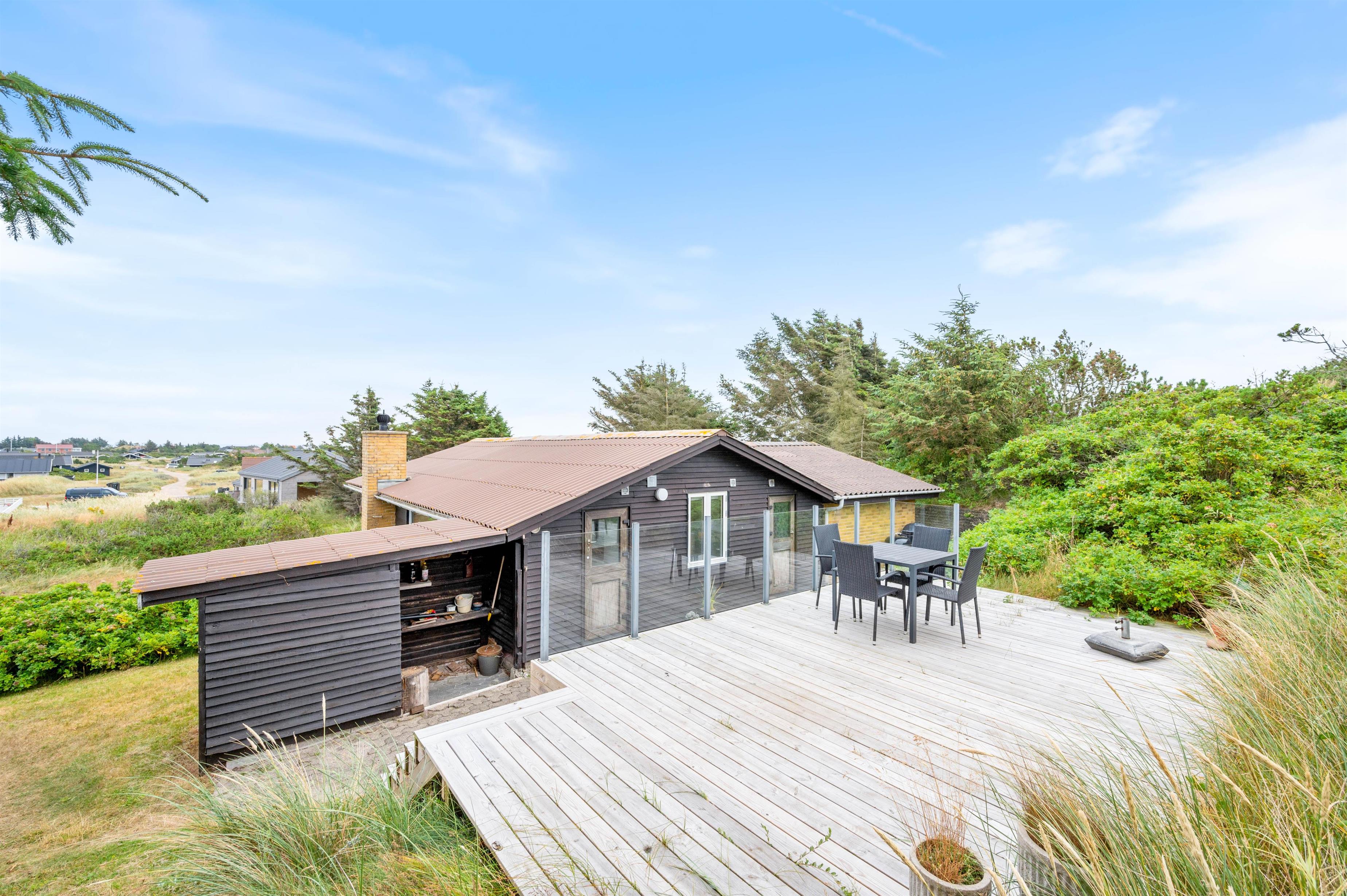 Fra stuen er der udgang til en lille fin terrasse, hvor morgenkaffen kan nydes til solopgangen over Ringkøbing Fjord. På vestsiden af feriehuset er der bygget en forhøjet terrasse ind i klitten, så I også her helt ugeneret kan nyde udsigten – og samtidigt sidde i læ. Nyd en lækker grillmiddag, mens dagens sidste solstråler forsvinder bag klitten og farver himlen orangerød.