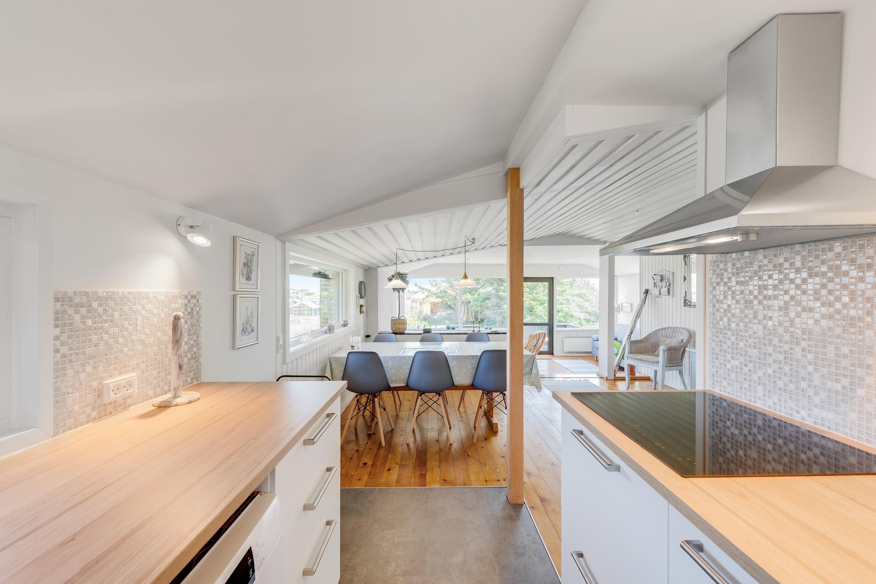Det praktiske og veludstyrede køkken ligger i åben forbindelse med spisestuen, hvorfra der er nedgang til stuen, som ligger et trin længere nede. De store østvendte panoramavinduer i stuen tager solen og den storslåede natur med helt ind i stuen, samtidig med at I har en fantastisk udsigt over området – både fra køkken og fra stuen.