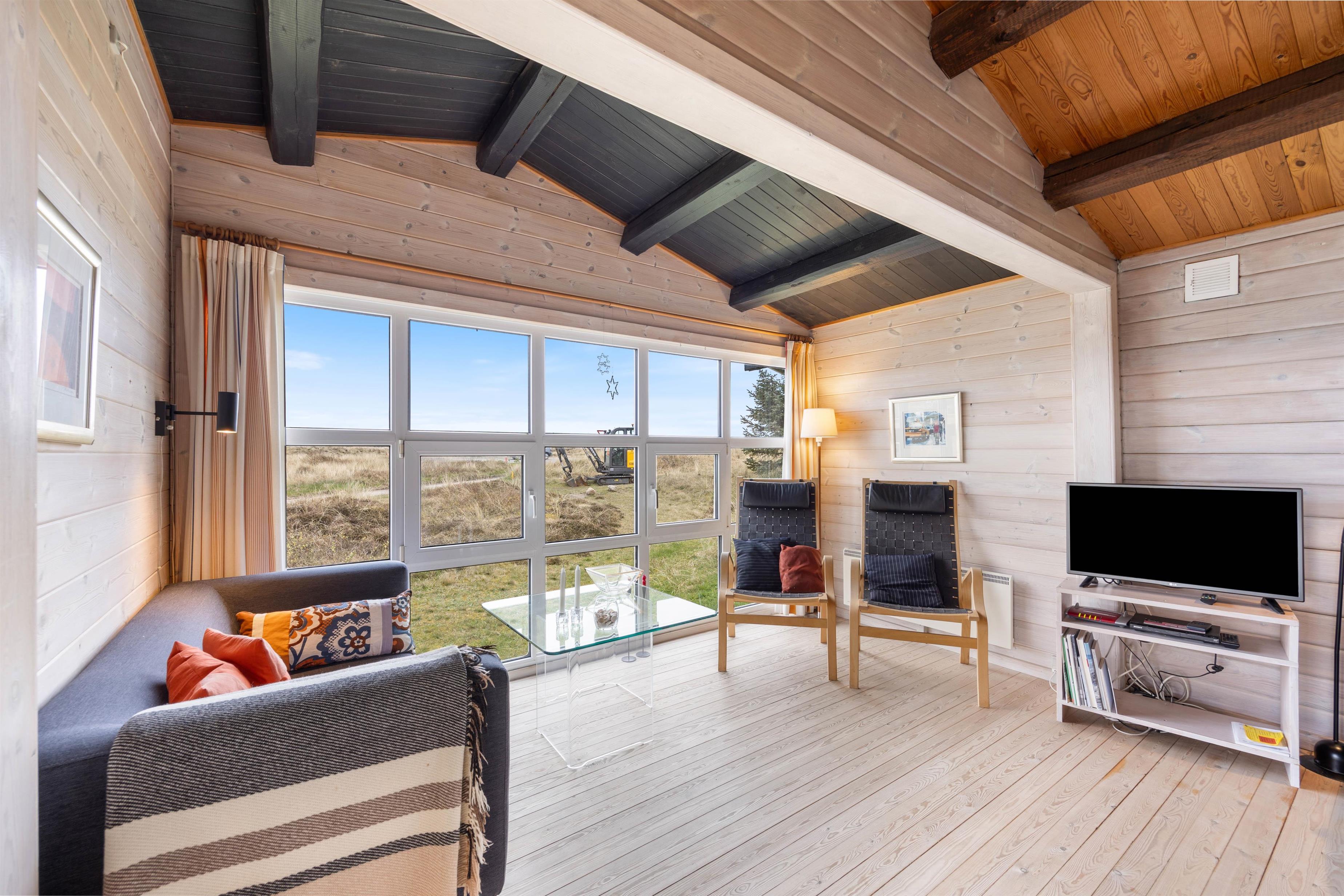Der er 3 soveværelser med trægulv i sommerhuset. 2 af værelserne har hver en dobbeltseng, det sidste værelse har 2 enkeltsenge, hvor den ene er placeret lidt højere og på tværs af den anden. Badeværelset har gulvvarme og en bruseniche. I køkkenet er der en frostboks på 10 L i forbindelse med køleskabet. Stuen er rigtig hyggelig med trægulv og træloft til kip med synlige bjælker. Der er brændeovn, et fladskærms-TV og en DVD. Desuden er der en energibesparende varmepumpe, som I med fordel kan benytte.