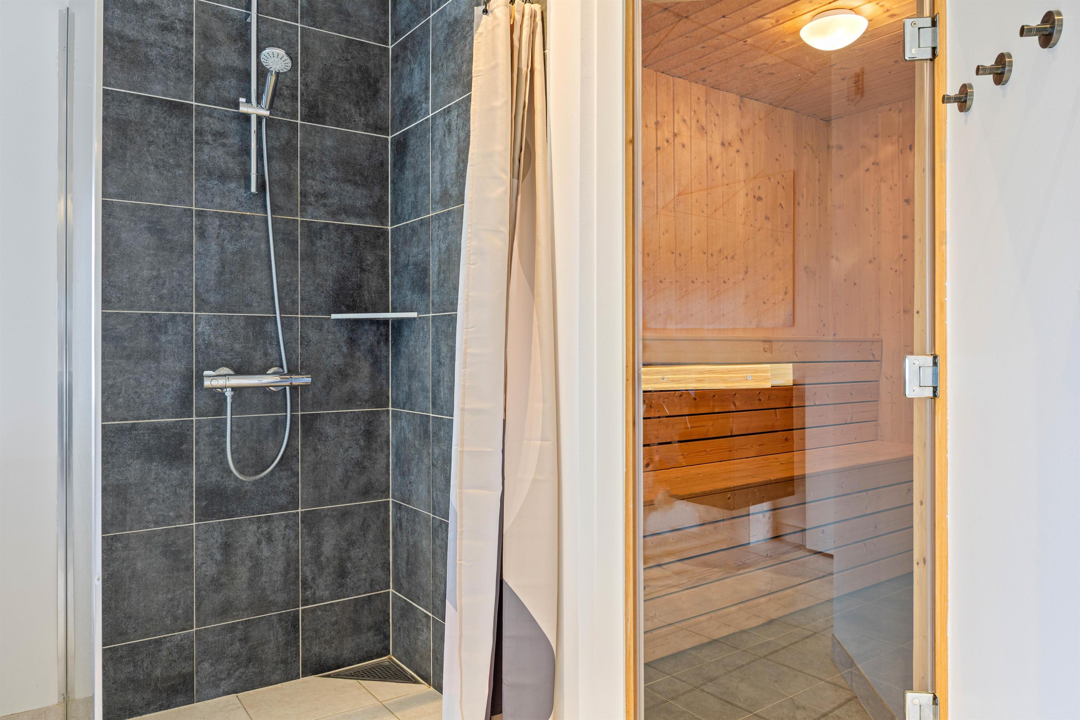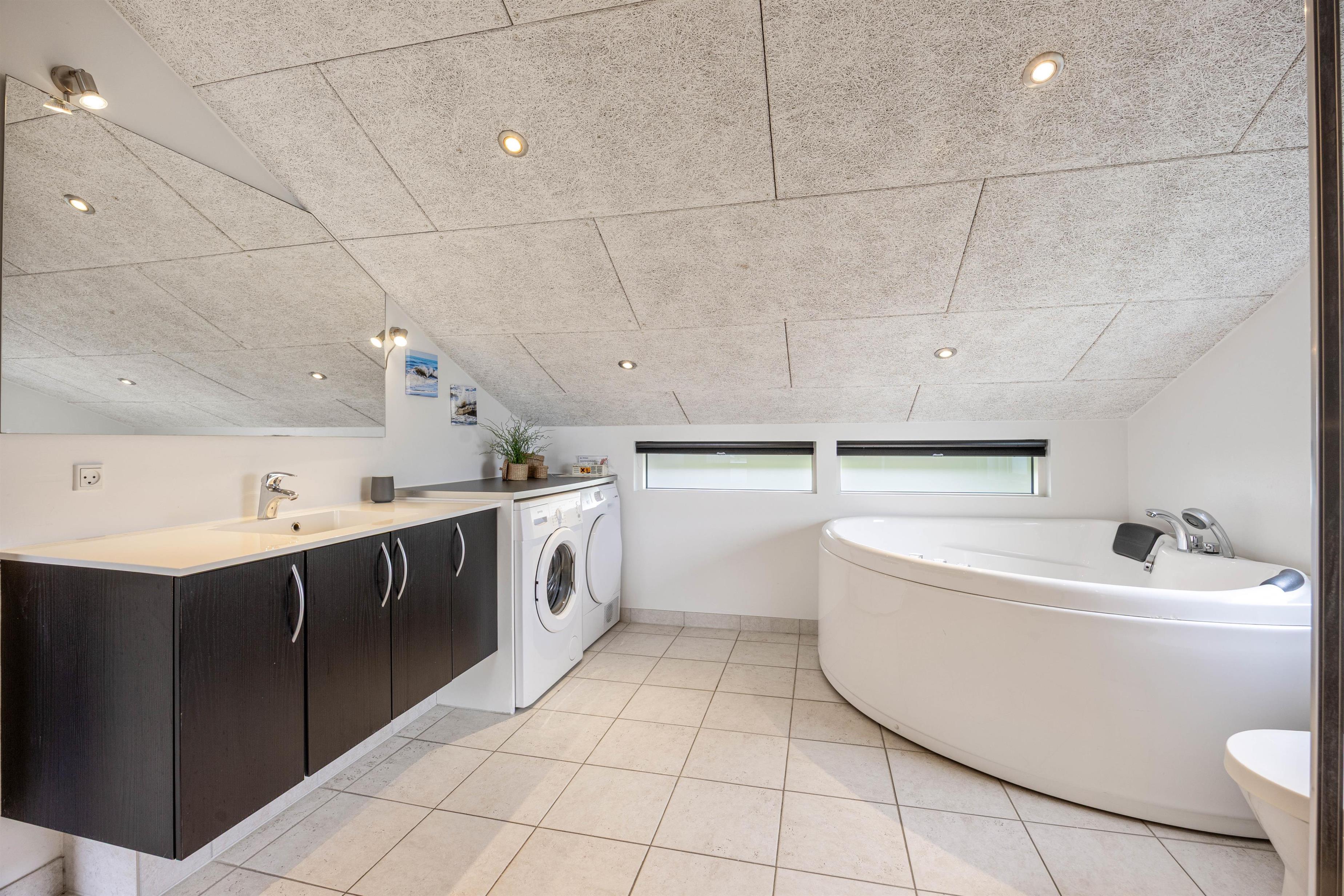Der er 2 fine badeværelser i sommerhuset – begge med gulvvarme, som giver ekstra komfort på kolde dage. Det ene badeværelse er desuden indrettet med både spabad og sauna, så I rigtig kan forkæle jer selv efter en lang gåtur i naturen. Det andet badeværelse er kommet til i forbindelse med en renovering og tilbygning i 2025. Derudover er der både vaskemaskine og tørretumbler i sommerhuset, så I let kan klare hverdagens praktiske gøremål.