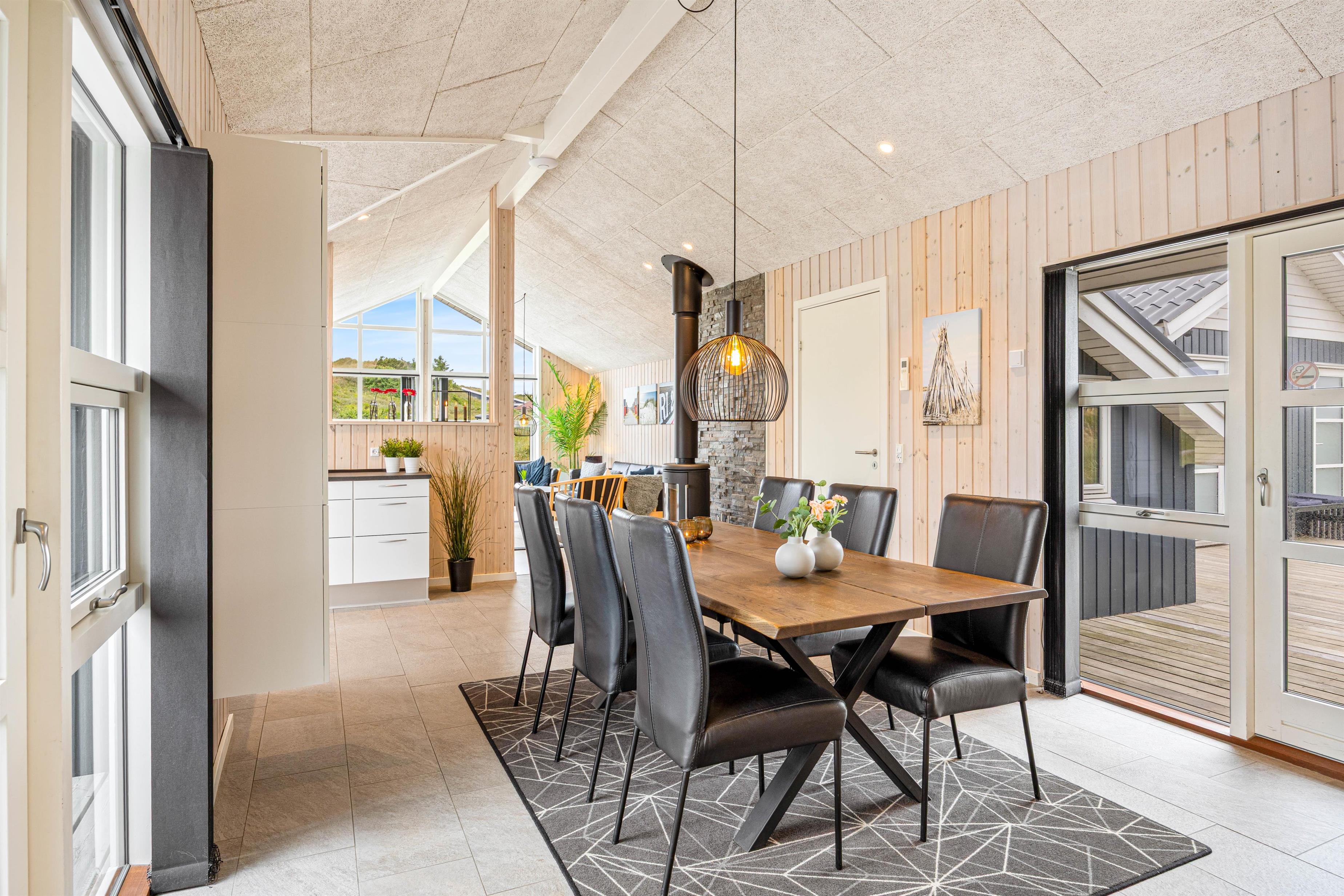 Indretningen er præget af et lyst og skandinavisk udtryk med store vinduespartier, der lader dagslyset strømme ind og skaber en dejlig forbindelse mellem inde og ude. I stuen er der brændeovn til de kølige aftener, og i køkkenet finder I alt, hvad I skal bruge til feriens måltider.