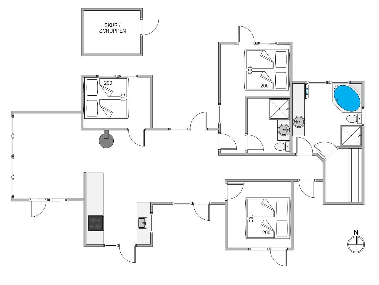 Sommerhuset rummer 3 rummelige soveværelser, alle indrettet med gode dobbeltsenge. Fra det ene værelse har I direkte udgang til terrassen – en skøn detalje, der gør det nemt at starte dagen med frisk luft og morgensol.