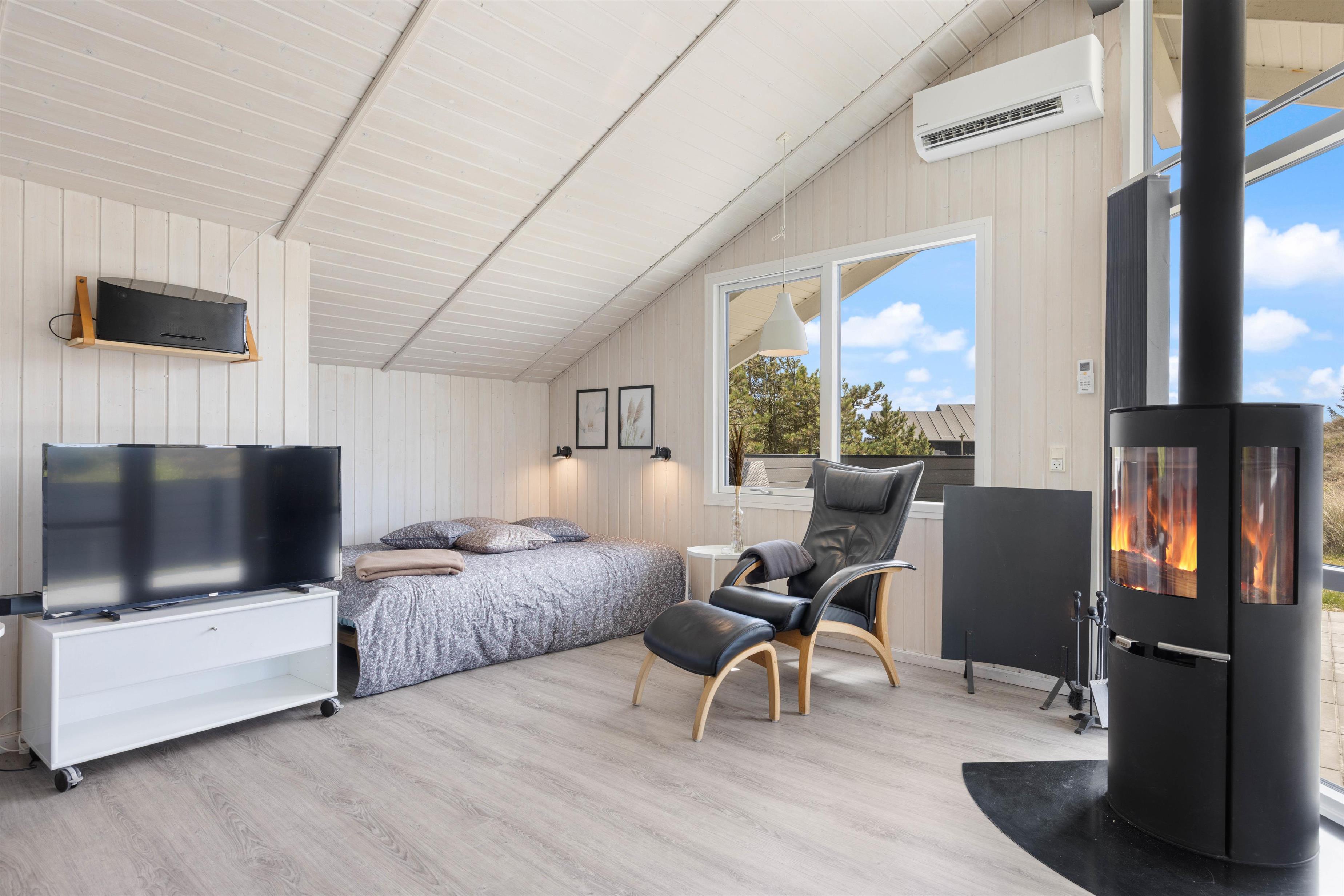 Sommerhusets hjerte er stuen i åben forbindelse med køkkenet, hvor I kan samles og nyde mange timer sammen som familie. Køkkenet, som er praktisk indrettet med opvaskemaskine og en 80 L fryser, inviterer til fælles madlavning, og om aftenen kan I slappe af til brændeovnens knitren og den omfavnende varme, mens I afholder jeres private biografaften med hjemmelavet popcorn. Desuden har I ved behov mulighed for at tænde for den energibesparende varmepumpe.