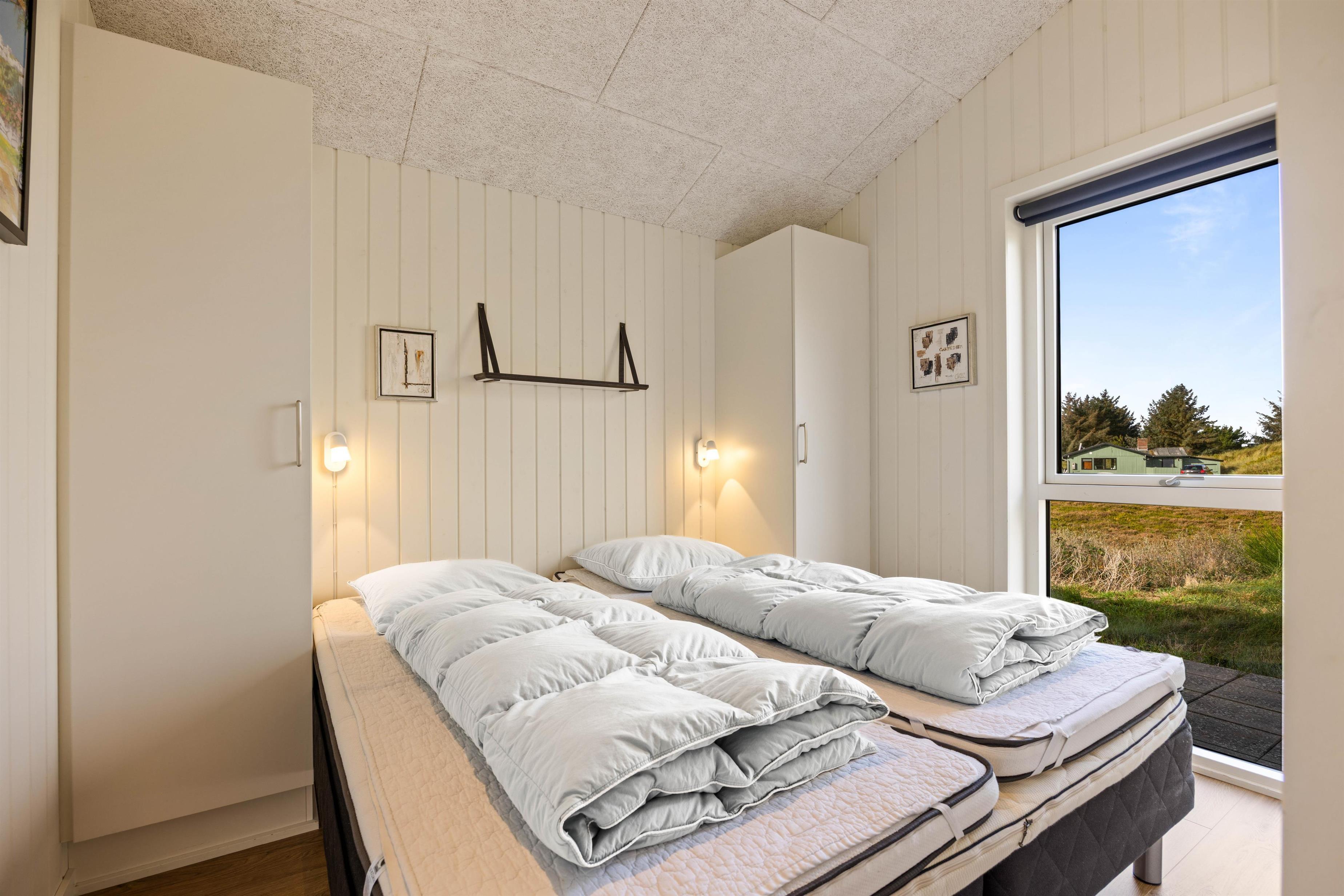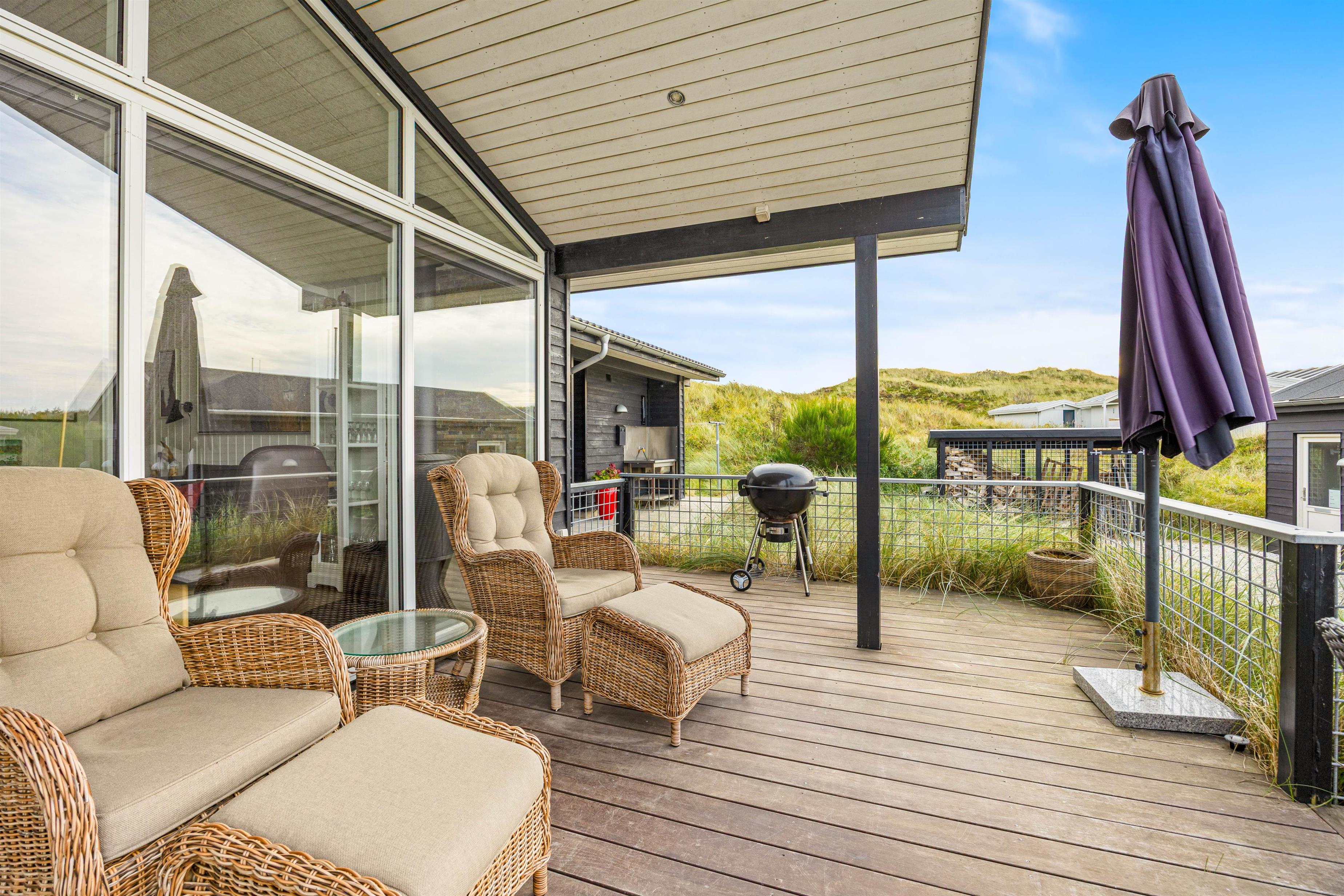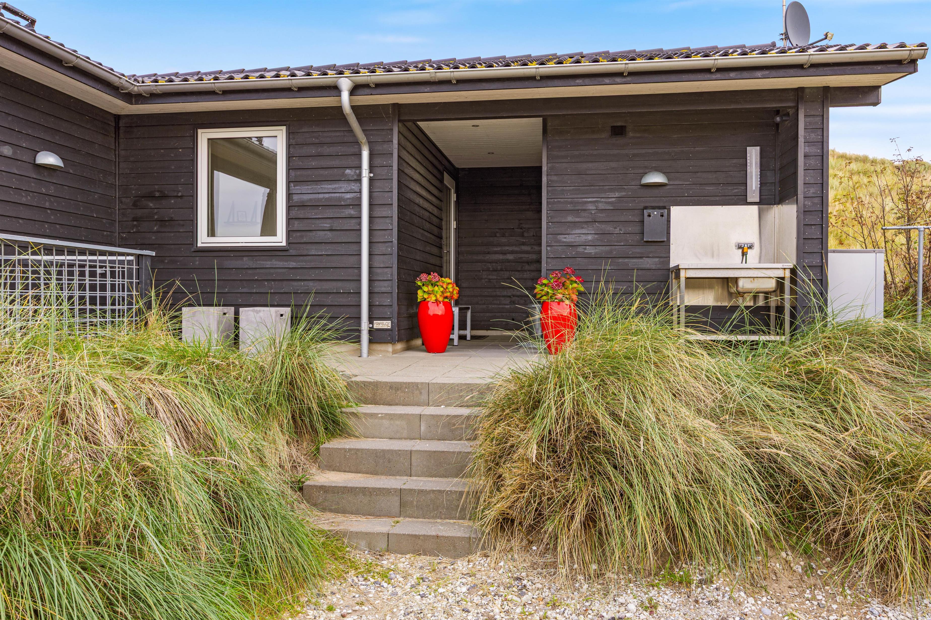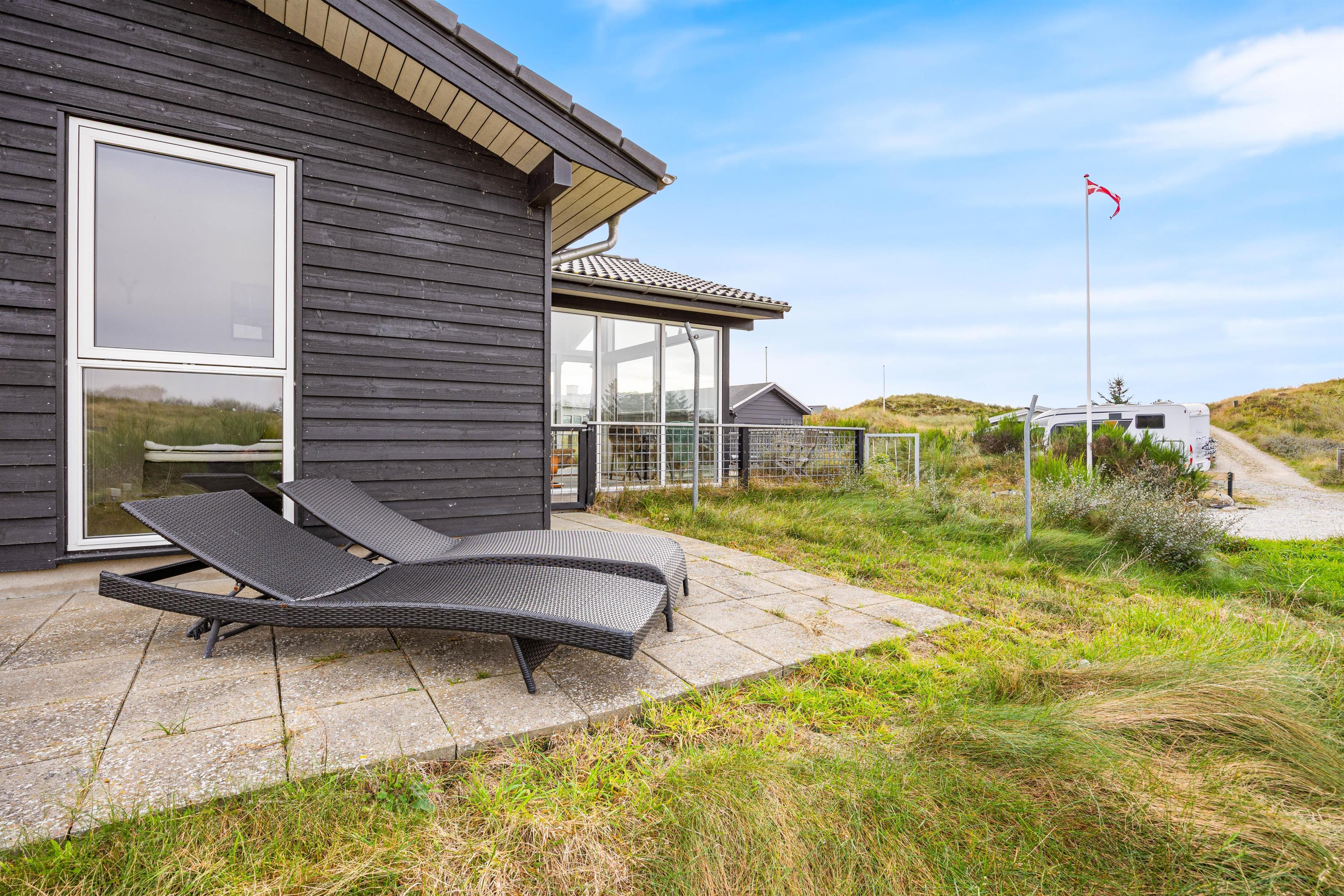 På den afskærmede og lukkede terrasse kan I nyde en middag under solen eller slappe af på den overdækkede terrasse med et godt glas vin, mens børnene leger i sandkassen eller gynger. Den store klitgrund på cirka 2200 kvadratmeter ligger kun en gåtur fra Ringkøbing Fjord til den ene side, og Vesterhavet på den anden, så I får rig mulighed for strandture og badning. Med solopgang over Ringkøbing Fjord og solnedgang i Vesterhavet bliver det vanskeligt at finde flottere beliggenhed.