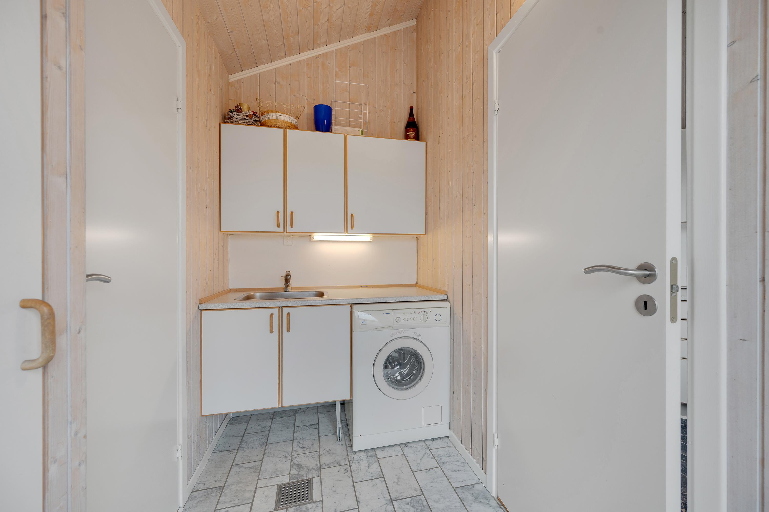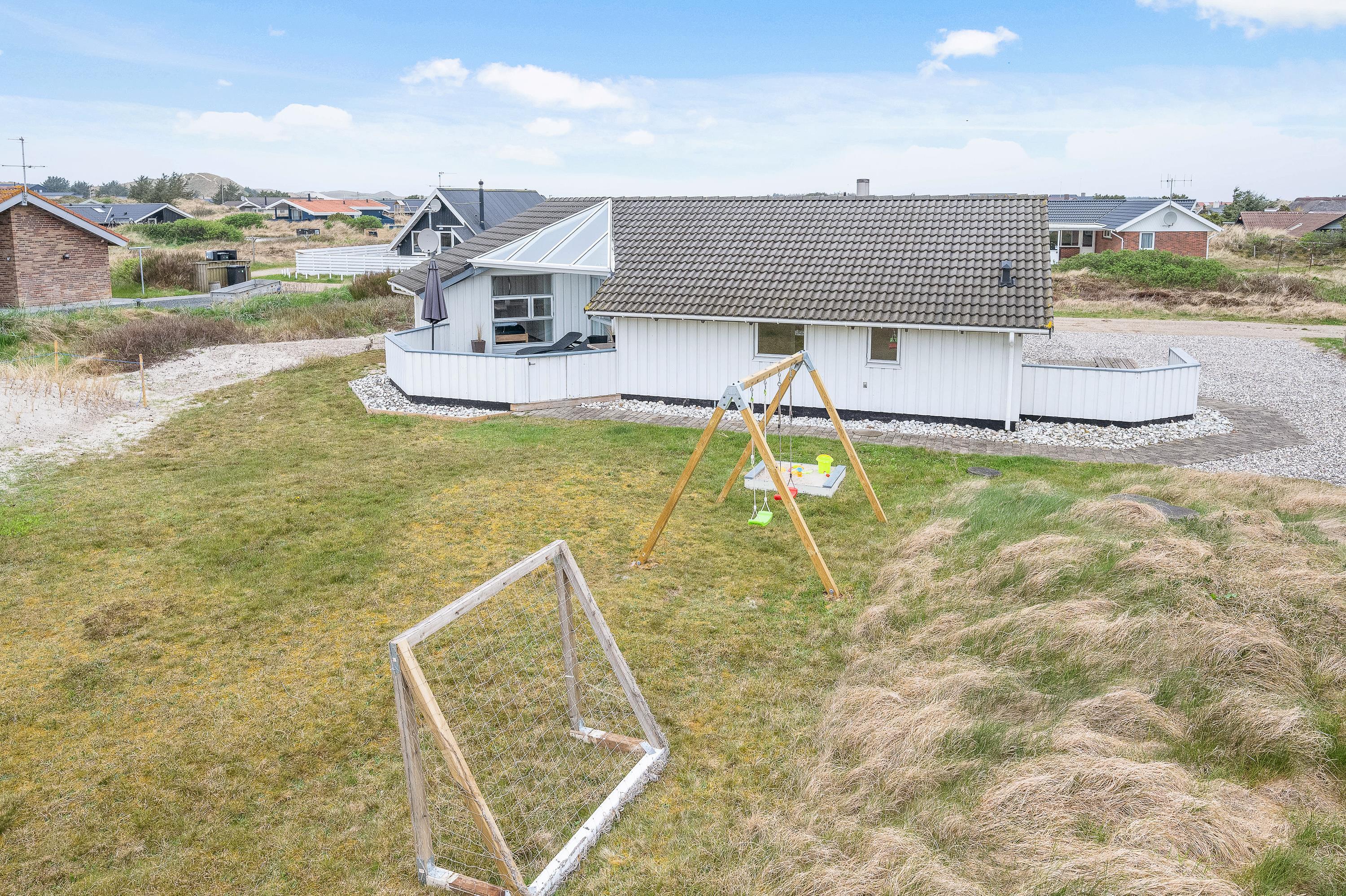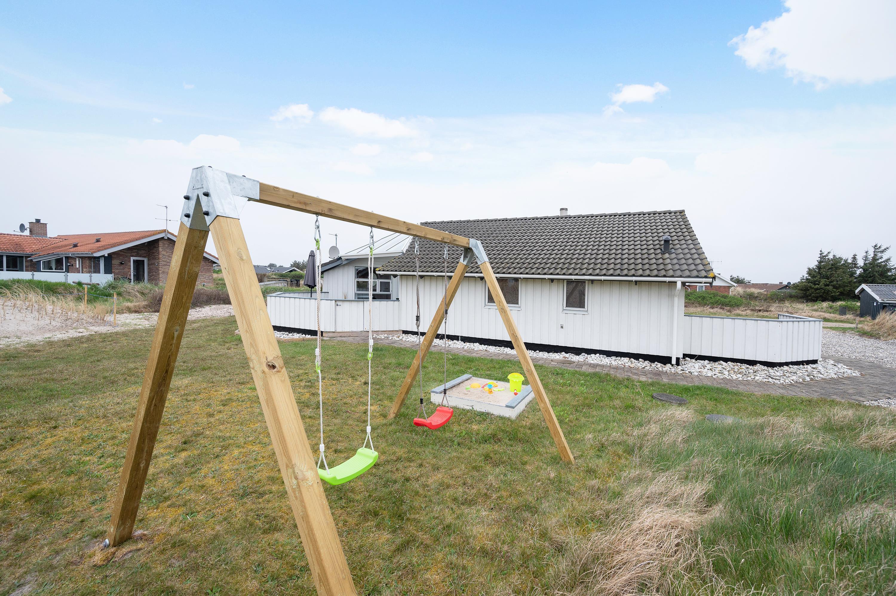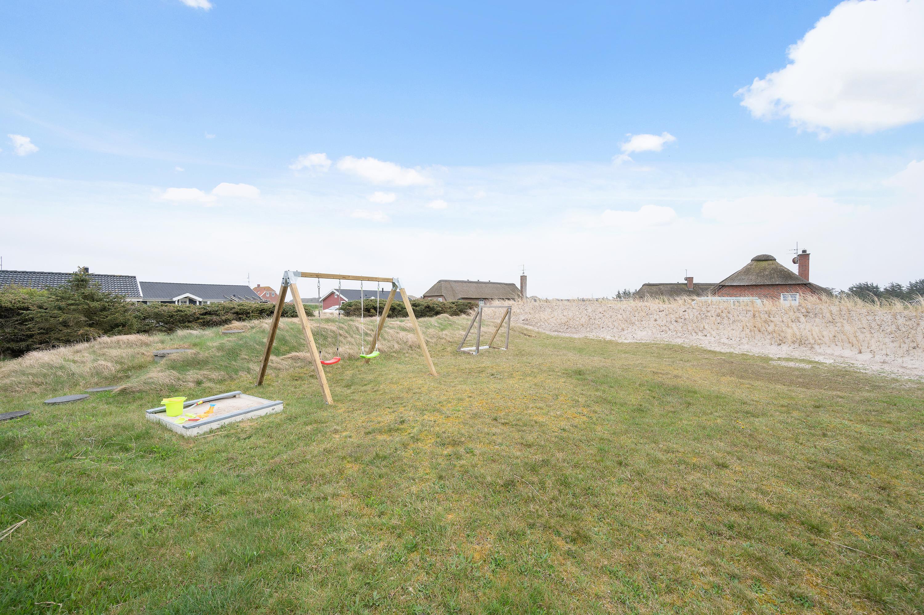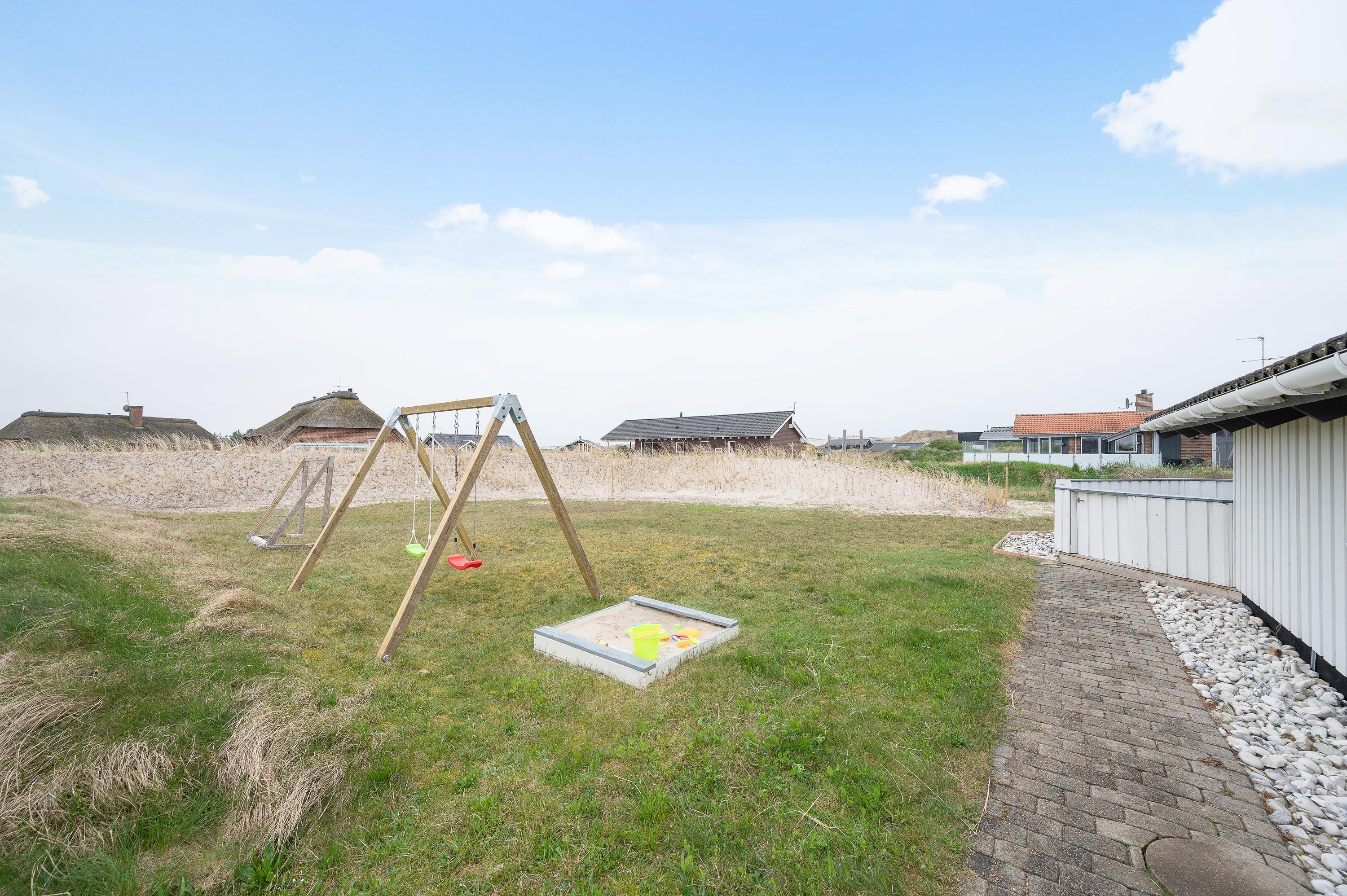 På naturgrunden kan børnene lege i sandkassen og ved gyngestativet. Her er også fodboldmål, så der kan afholdes en lille fodboldkamp. Bliver tøjet beskidt efter en spændende kamp, kan det vaskes, for sommerhuset har både vaskemaskine og tørretumbler.