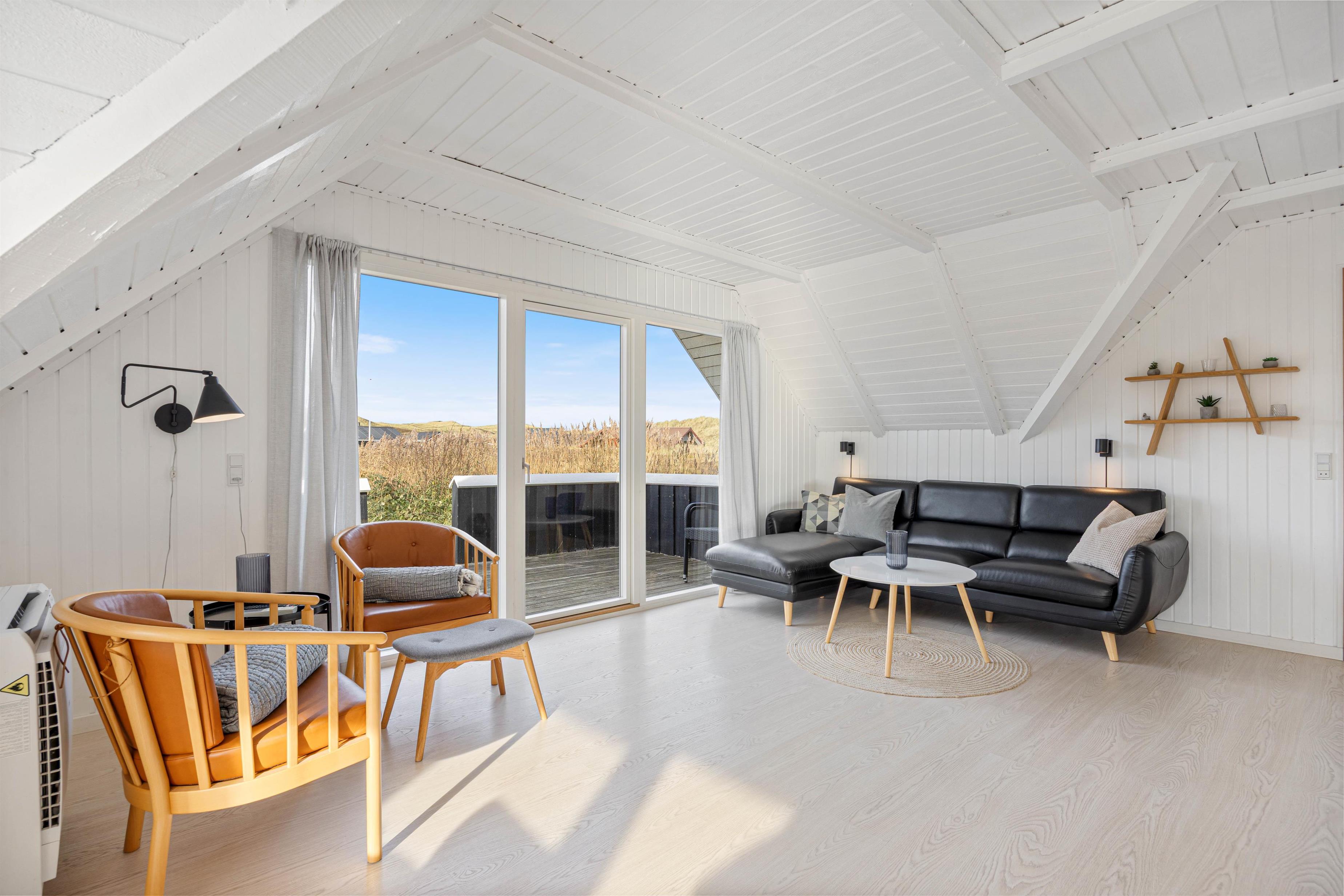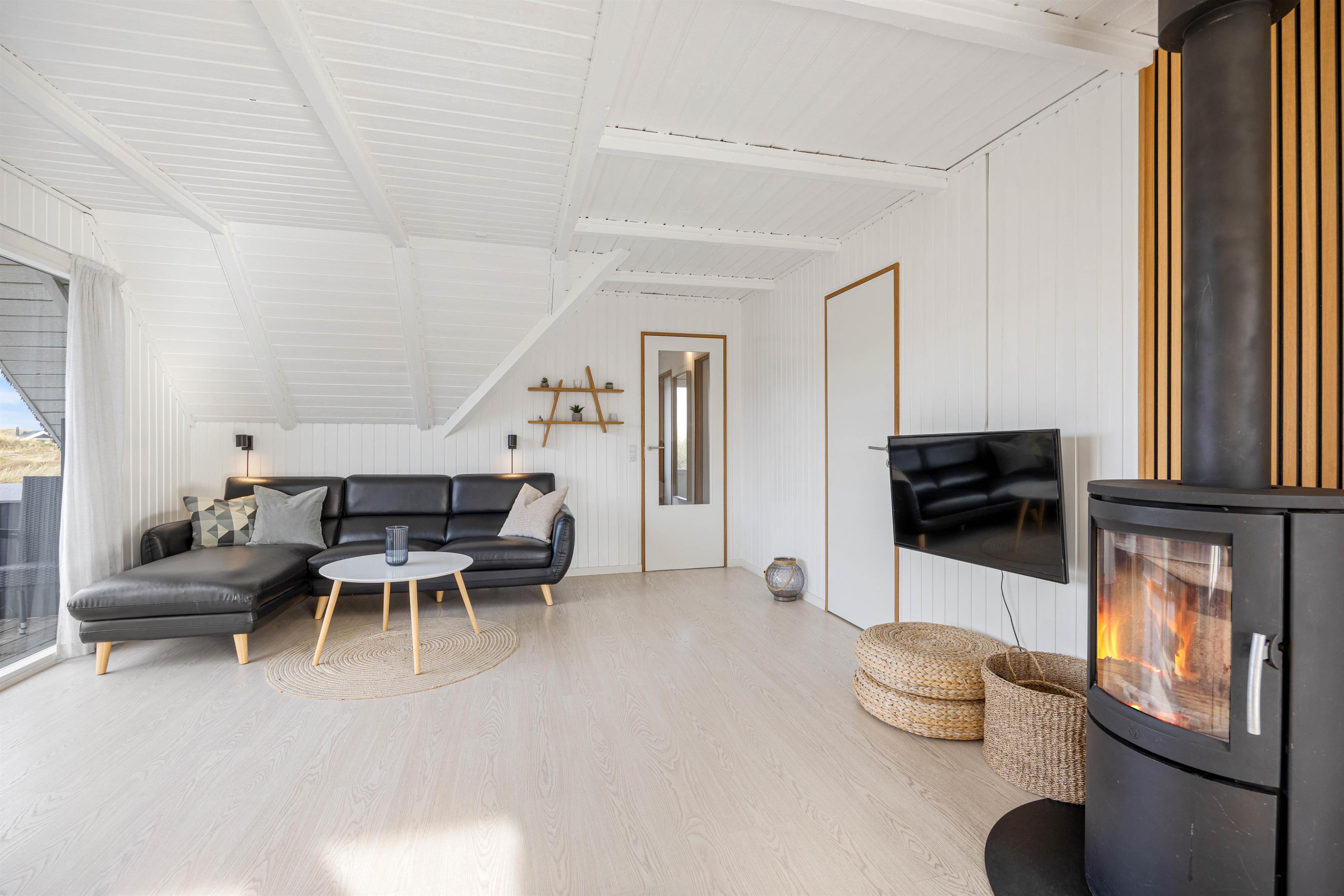 Sommerhusets opholdsrum, hvor køkken, spisestue og stue forenes i ét, vil være samlingsstedet for familien under jeres ferie i sommerhuset på Havbjergevej 10A. Sæt jer til rette i de lækre møbler i stuen, hvor de store vinduer ikke bare lukker masser af lys ind, men også giver jer en skøn udsigt til klitlandskabet, der omgiver sommerhuset.