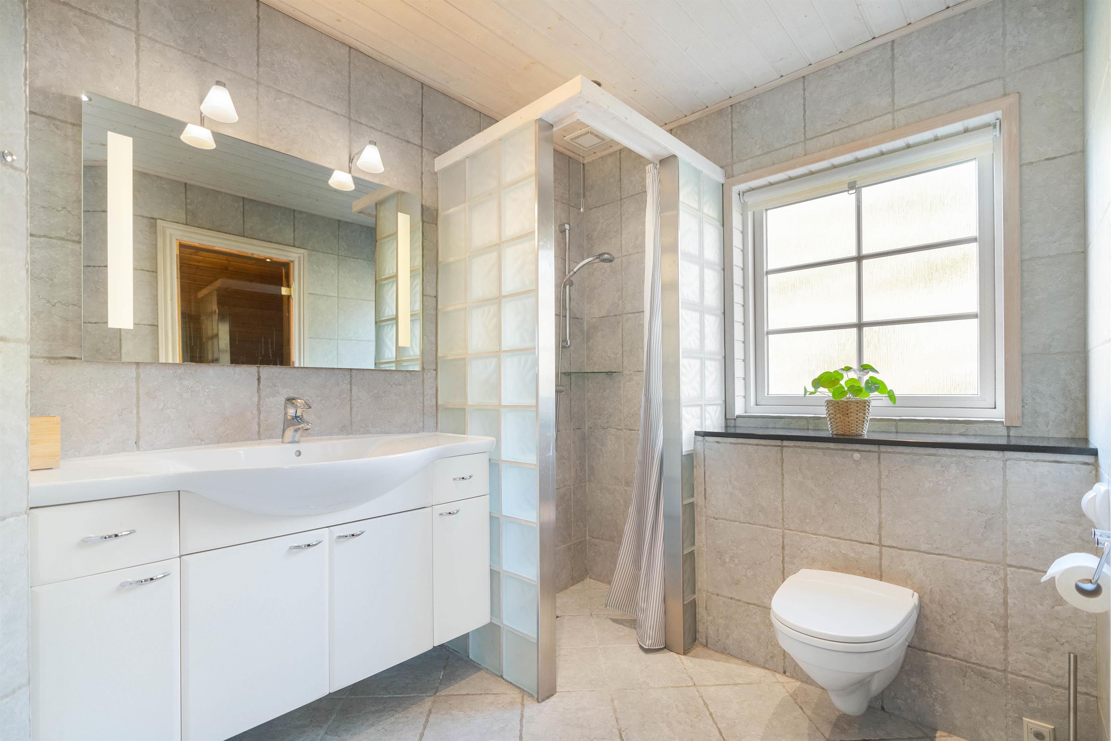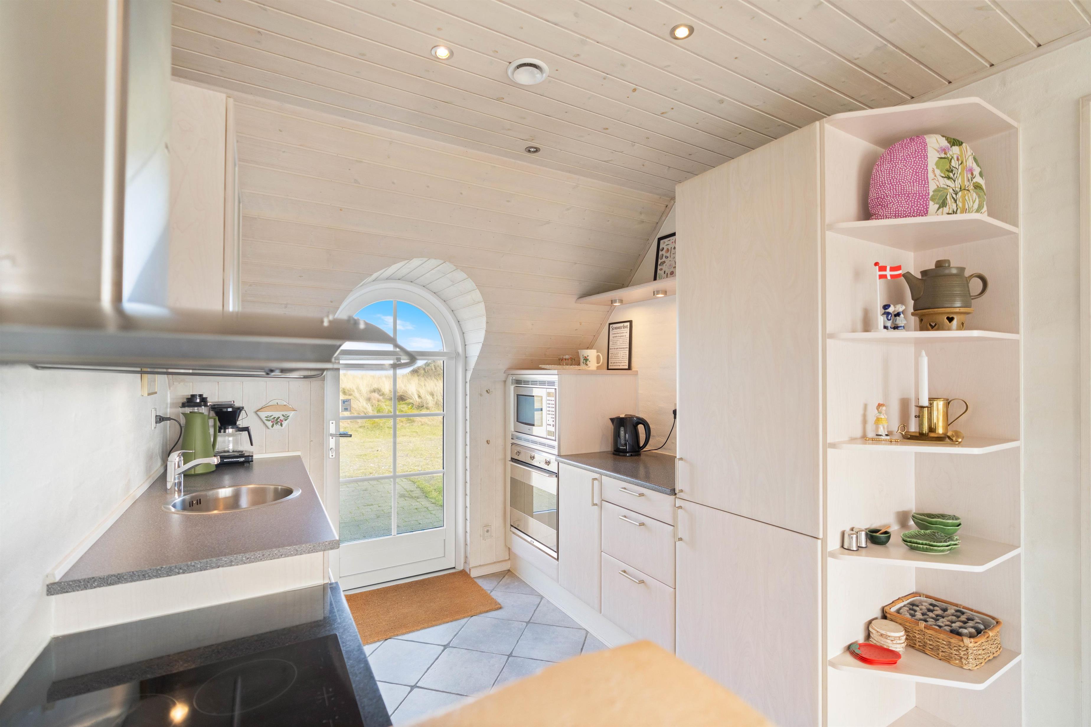 I den hyggelige stue, som er i åben forbindelse med køkkenet, sørger den indbyggede brændeovn for både hygge og varme. Og på det ene af feriehusets to badeværelser er der både sauna og spabad, så I kan forkæle jer selv med et par afslappende timer.