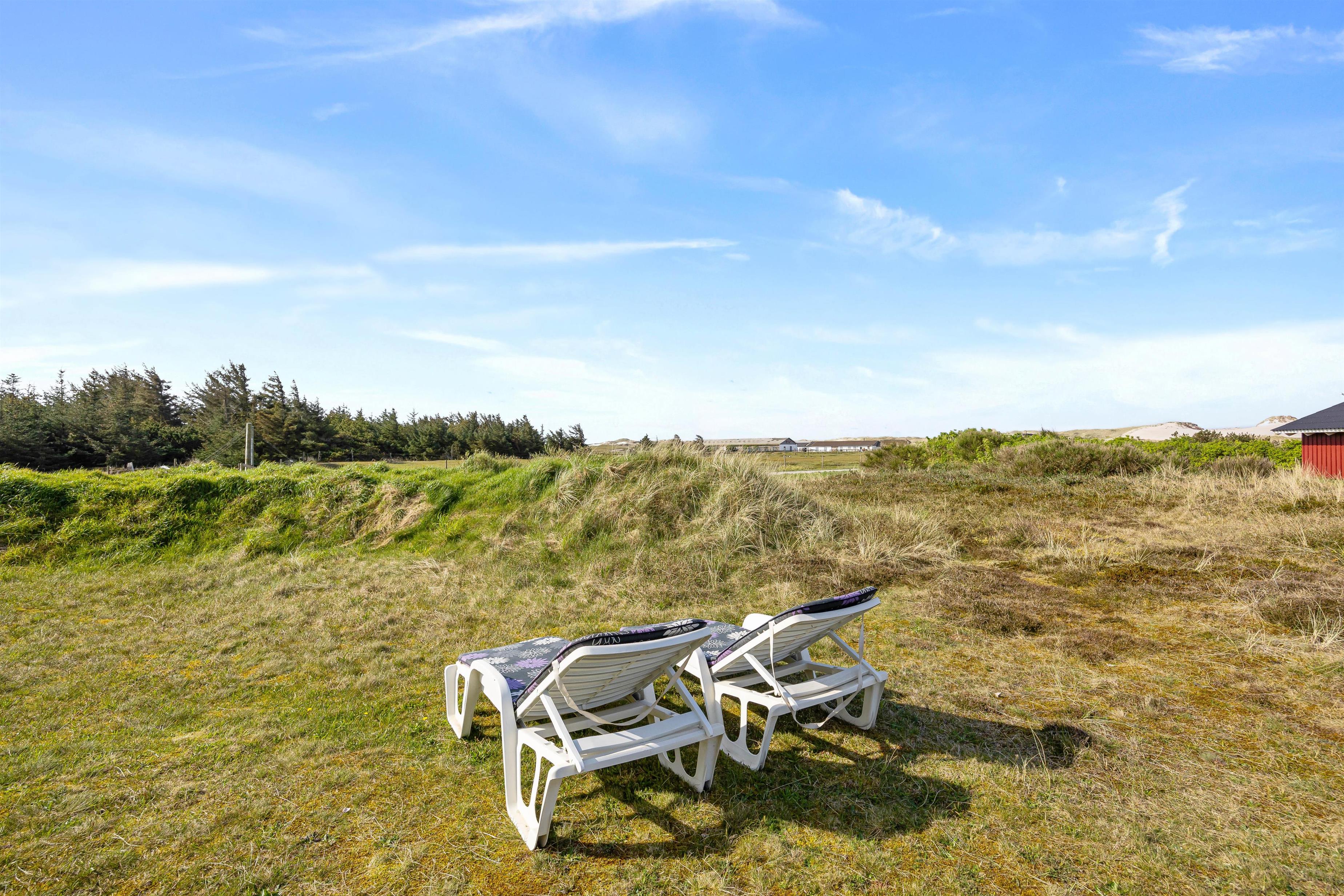 Fra opholdsområdet kan I gå ud på den lukkede og delvist overdækkede terrasse. Her kan I lade de små børn lege frit, uden at de kommer ud på den store naturgrund. Behagelige havemøbler og liggestole indbyder til afslapning. Nyd en forfriskning og den friske havluft, mens børnene leger på gyngen eller spiller vikingeskak. Afslut feriedagen med at tilberede aftensmaden på grillen og nyd den under åben himmel. I kan stadig nå en hyggelig gåtur til stranden og opleve solnedgangen i Vesterhavet før sengetid.