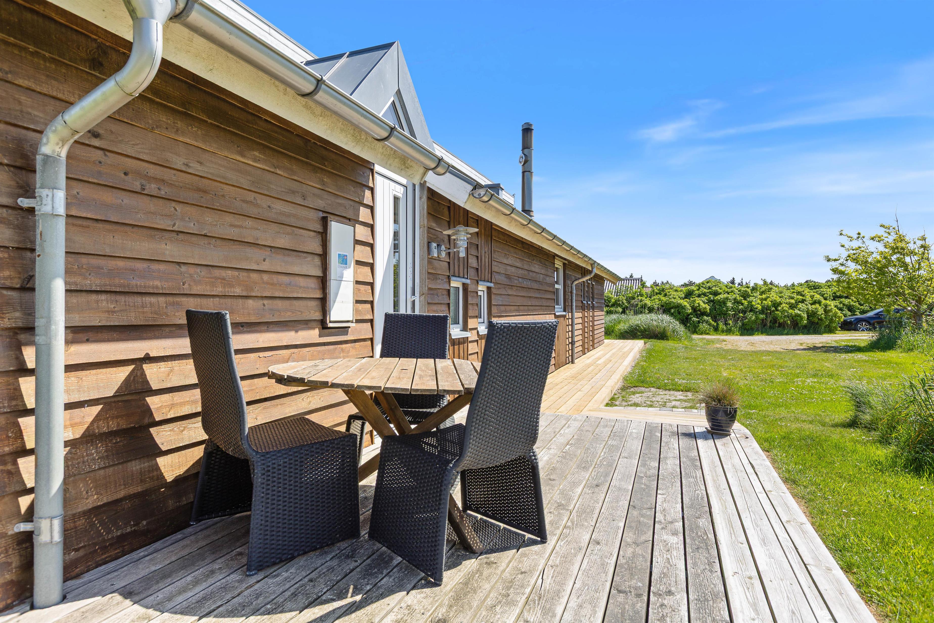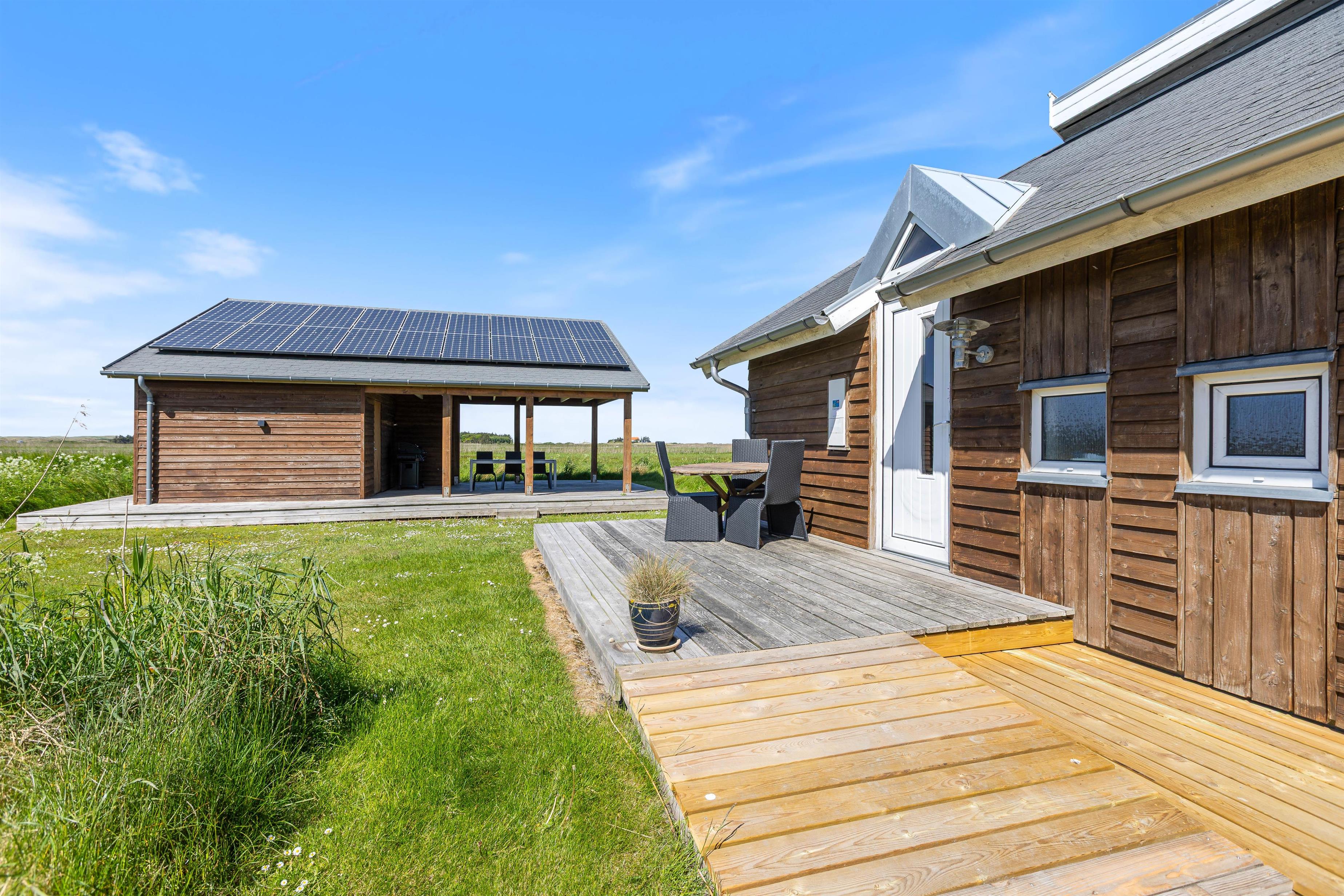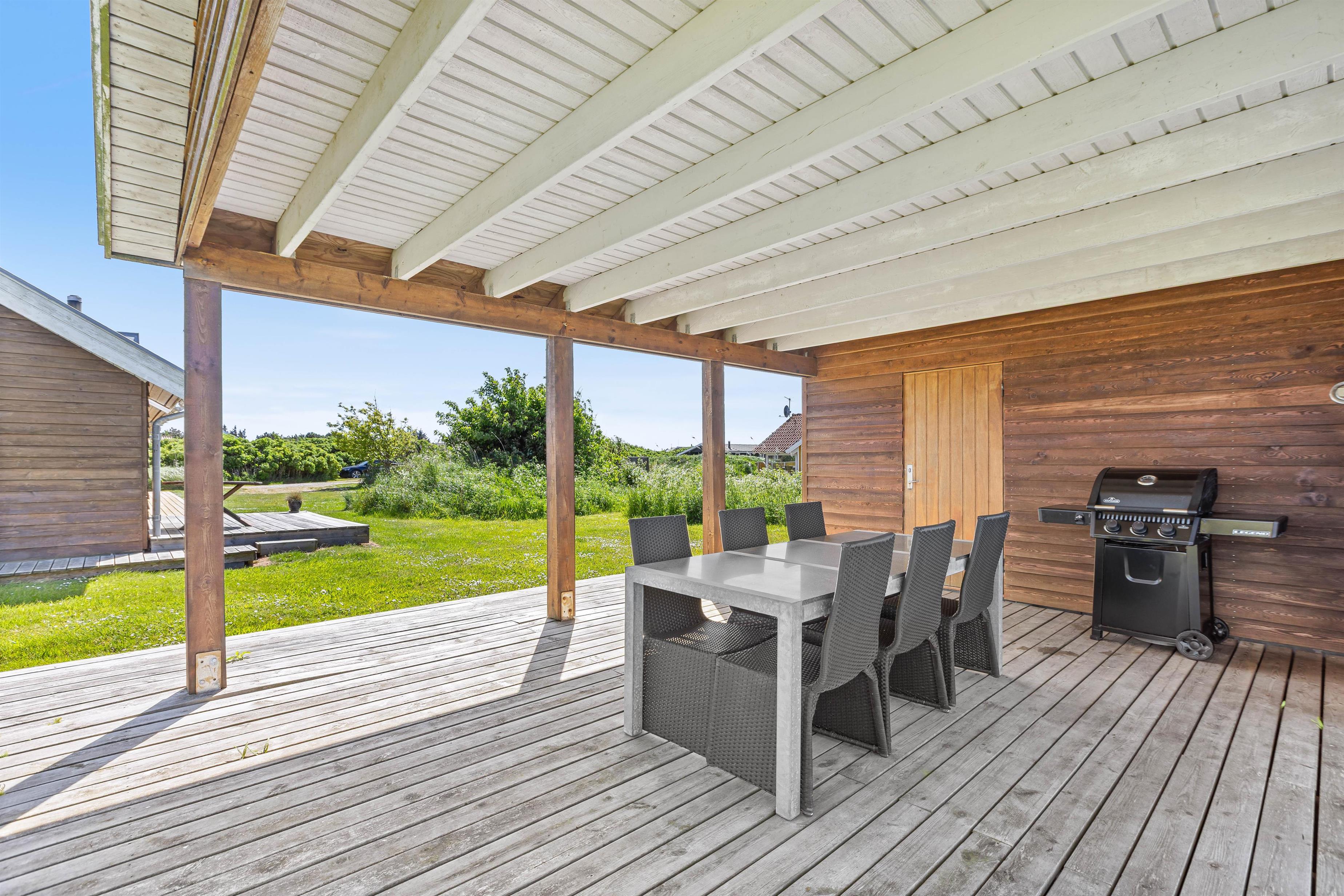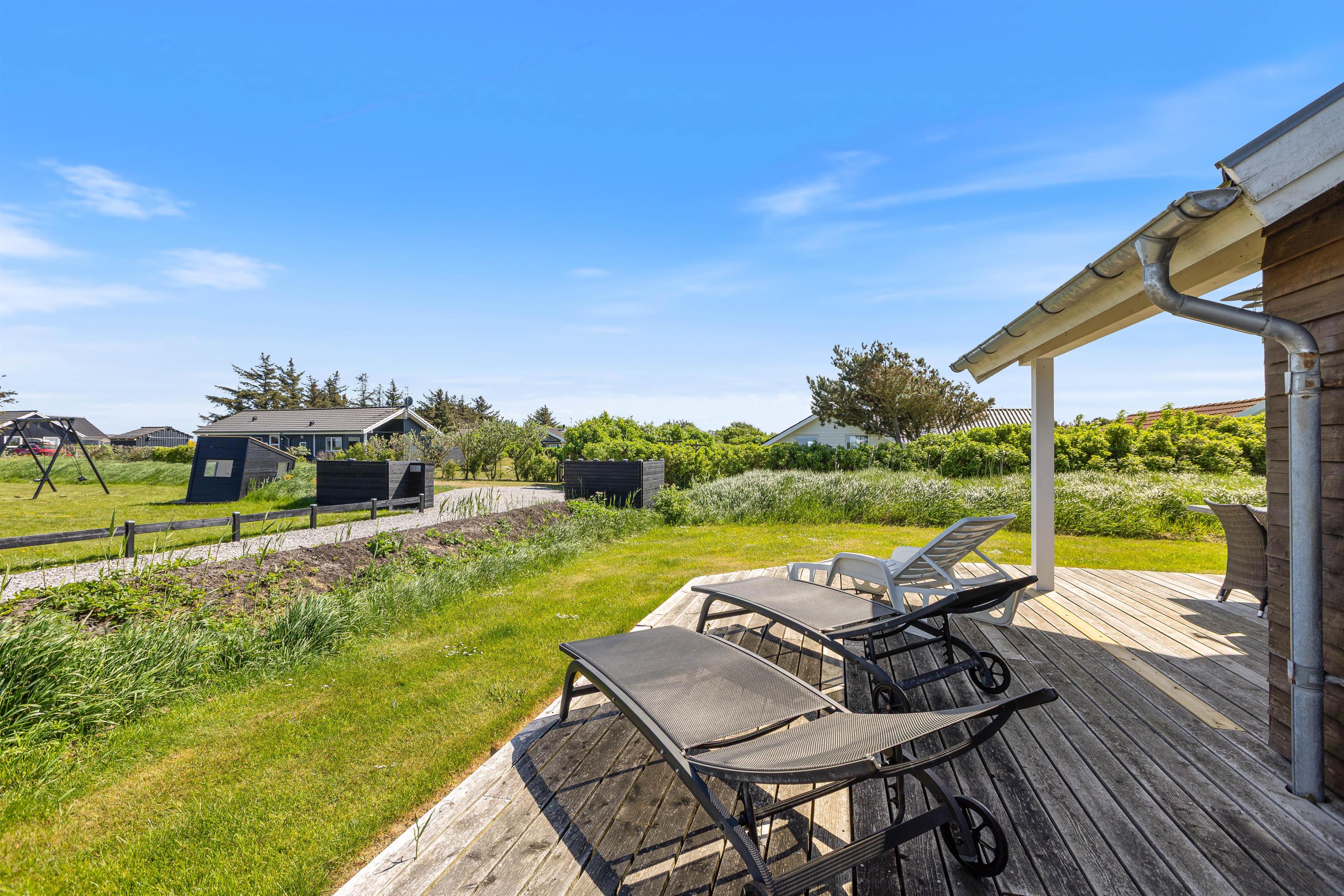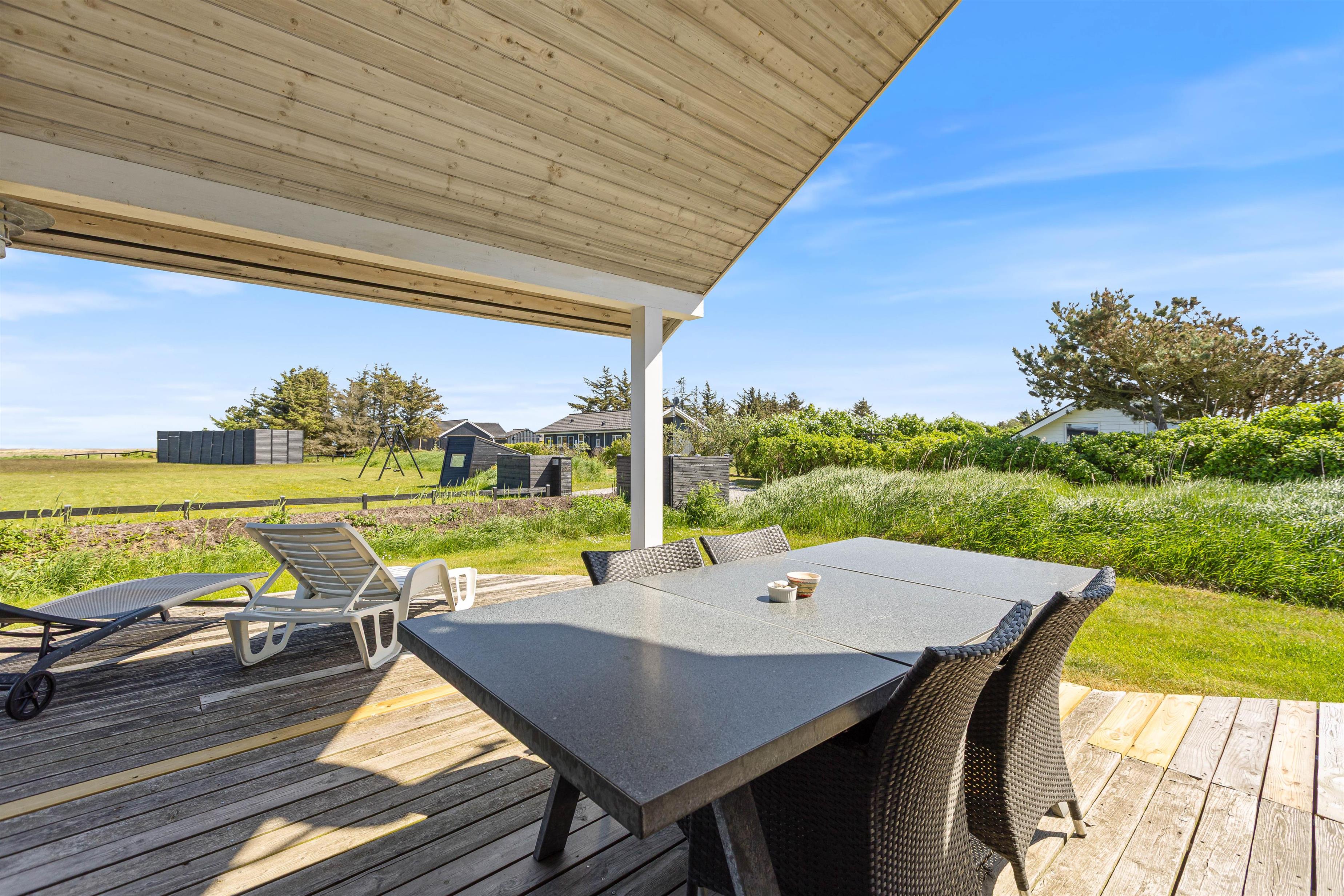 På den åbne terrasse kan I slappe af i de komfortable havemøbler og liggestole i den friske vesterhavsluft. Bliver solen for stærk, kan I trække ind på den afskærmede- eller overdækkede del af terrassen. Nyd panoramaudsigten og den vestjyske natur, gå på opdagelse på den 1.350 m2 store naturgrund eller gå en frisk tur til Vesterhavet og tag en dukkert, hvis vejret tillader det. Tænd op i grillen til aften og nyd et lækkert grillmåltid sammen, imens skyggerne bliver lange. I kan nå en tur til Vesterhavet, hvor I kan betragte solnedgangen – det er en oplevelse i alle slags vejr.