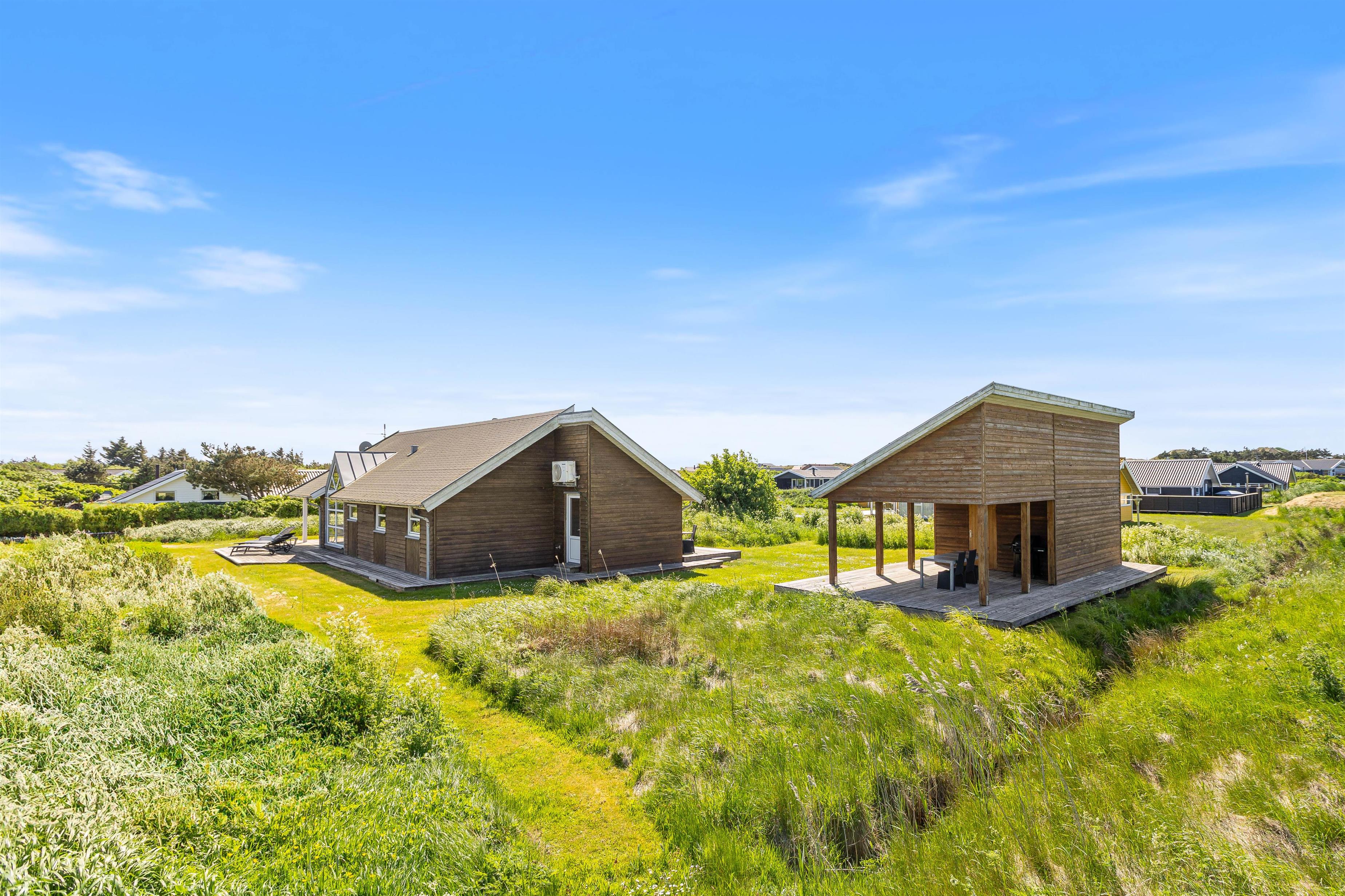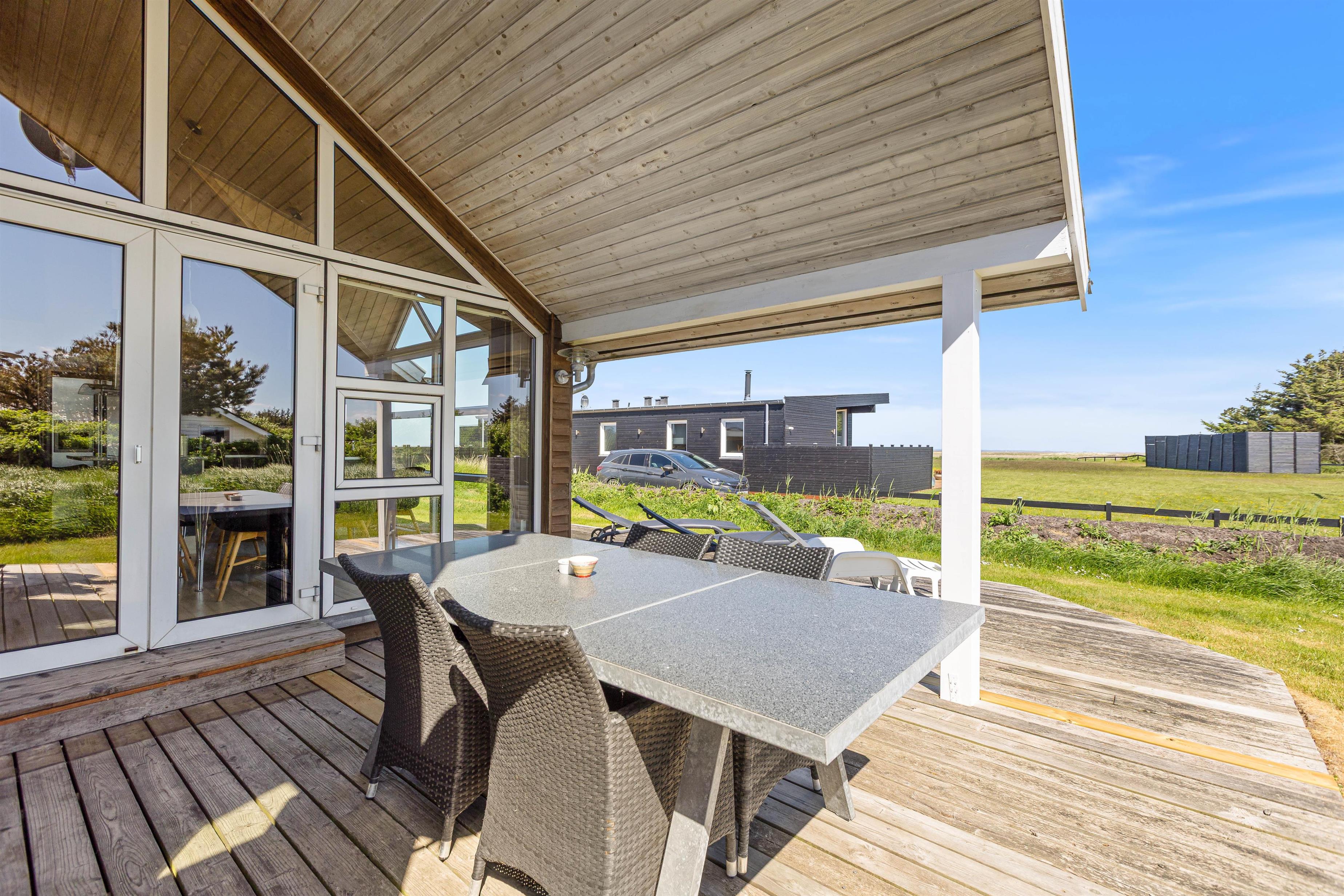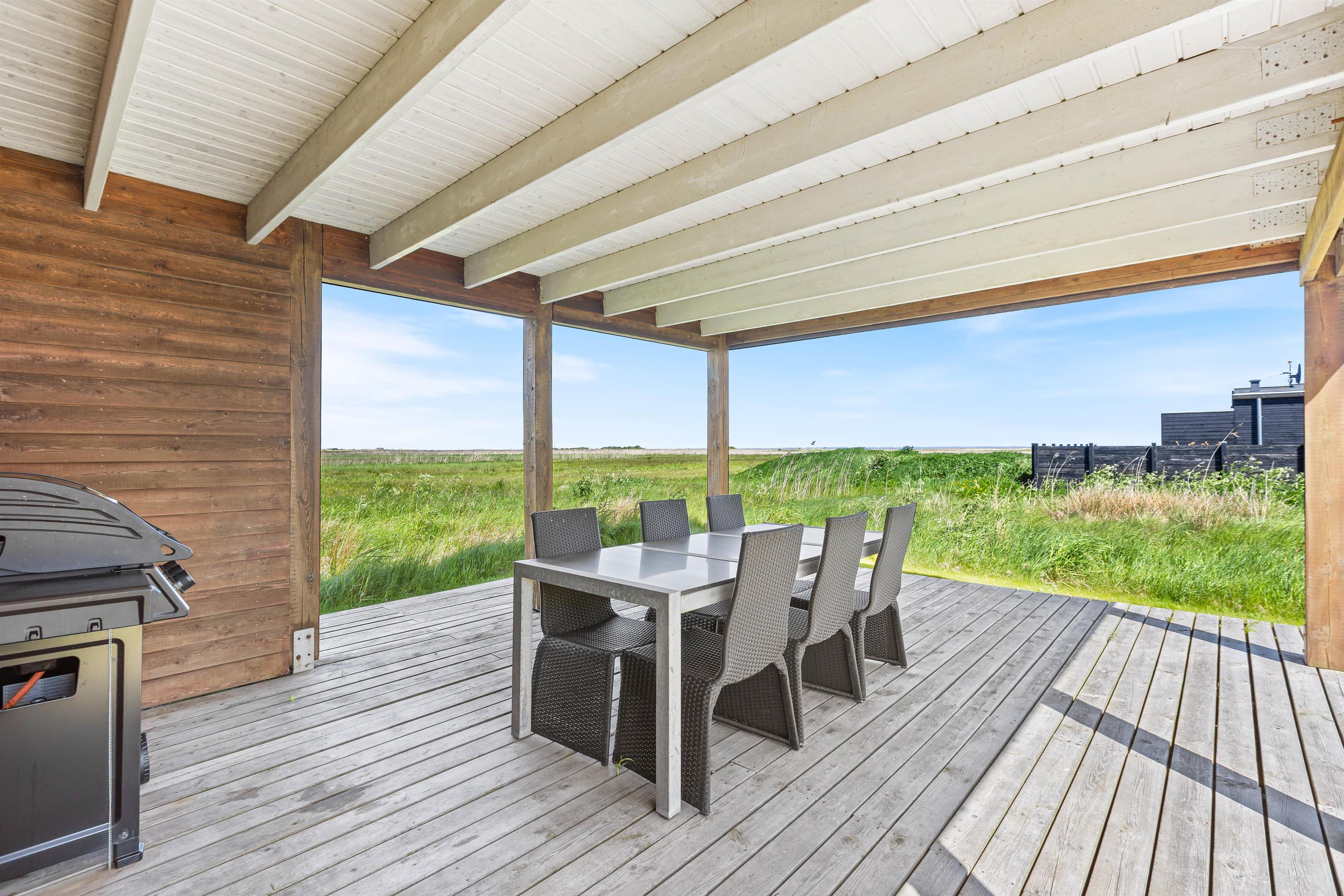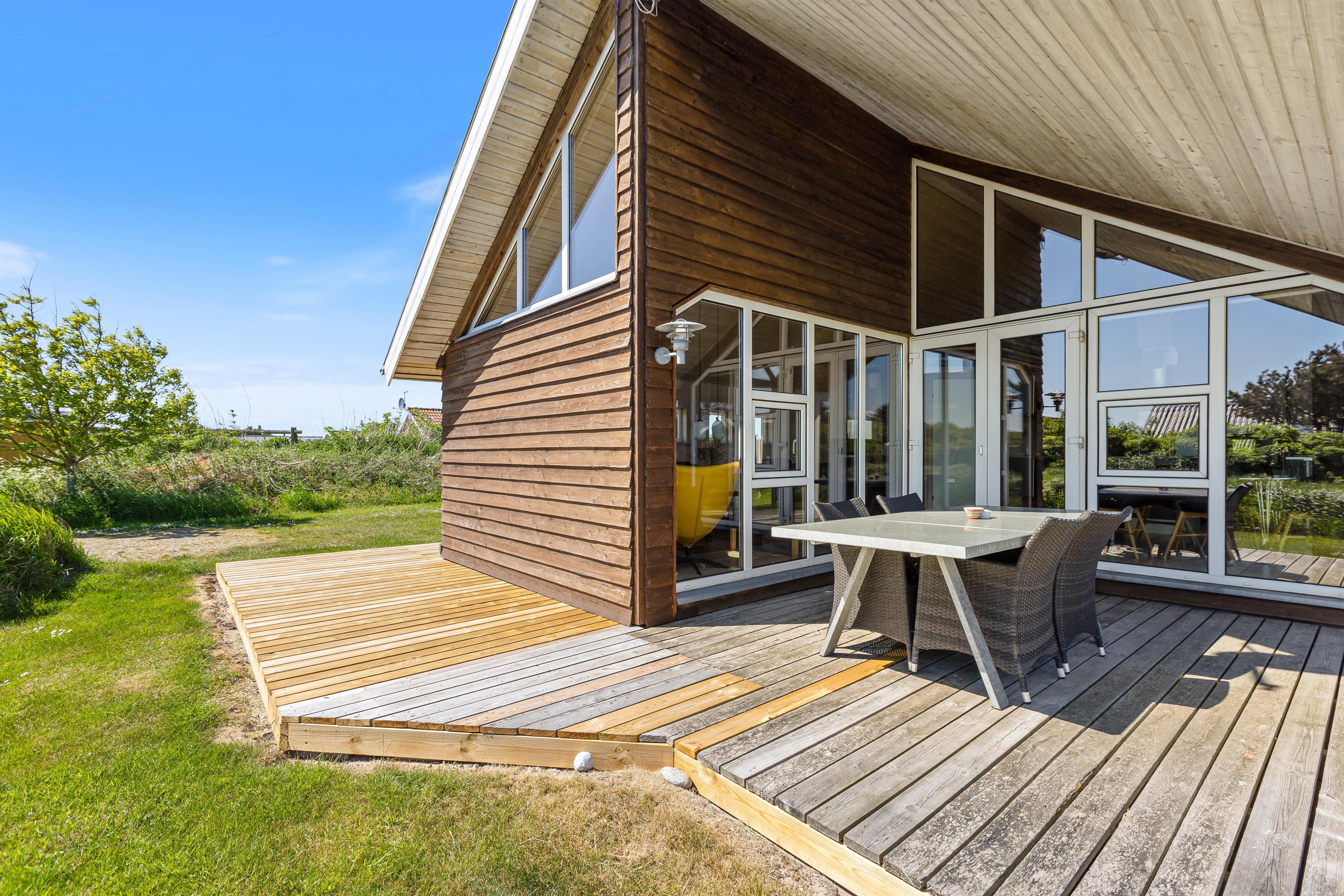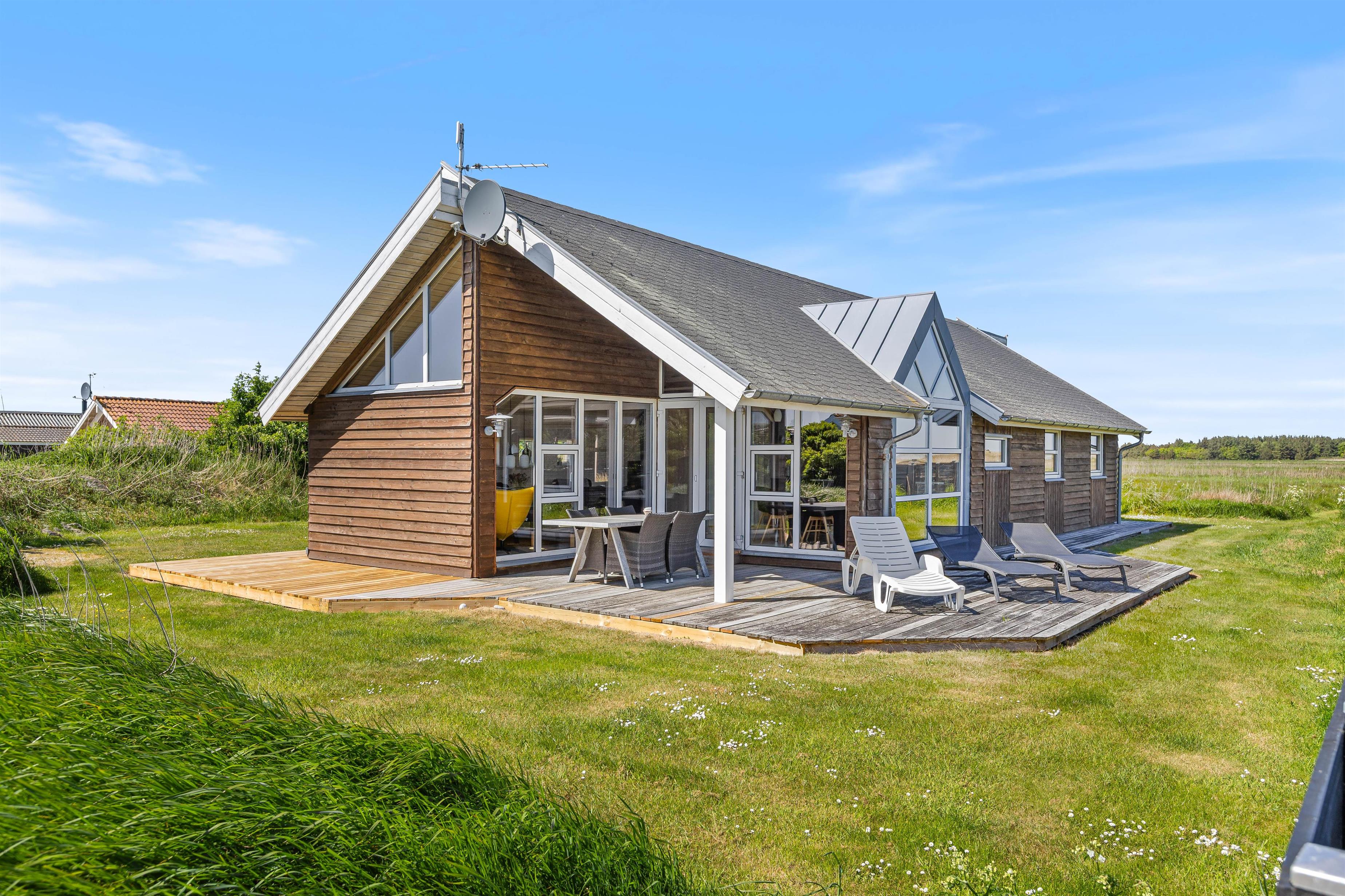 På den åbne terrasse kan I slappe af i de komfortable havemøbler og liggestole i den friske vesterhavsluft. Bliver solen for stærk, kan I trække ind på den afskærmede- eller overdækkede del af terrassen. Nyd panoramaudsigten og den vestjyske natur, gå på opdagelse på den 1.350 m2 store naturgrund eller gå en frisk tur til Vesterhavet og tag en dukkert, hvis vejret tillader det. Tænd op i grillen til aften og nyd et lækkert grillmåltid sammen, imens skyggerne bliver lange. I kan nå en tur til Vesterhavet, hvor I kan betragte solnedgangen – det er en oplevelse i alle slags vejr.