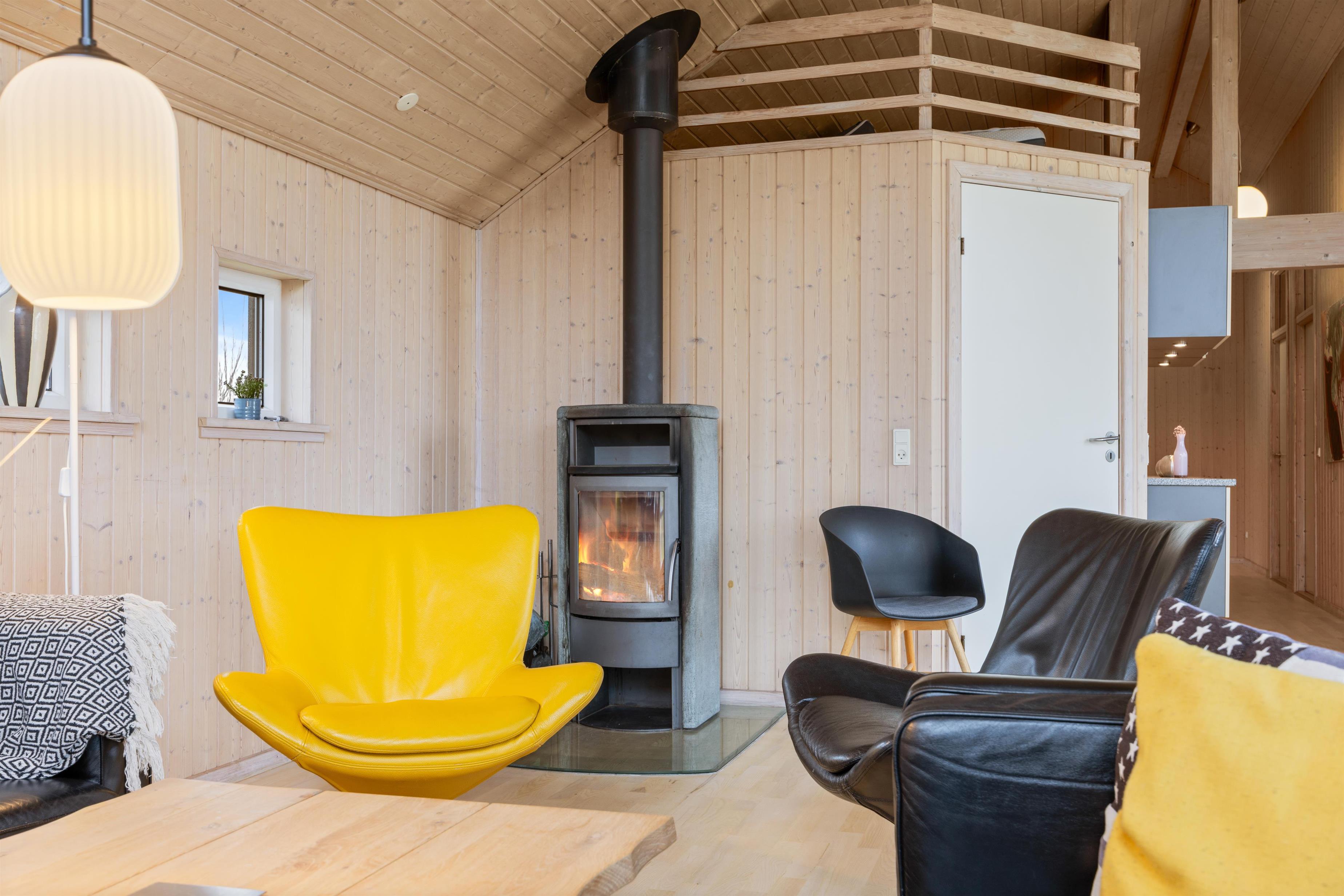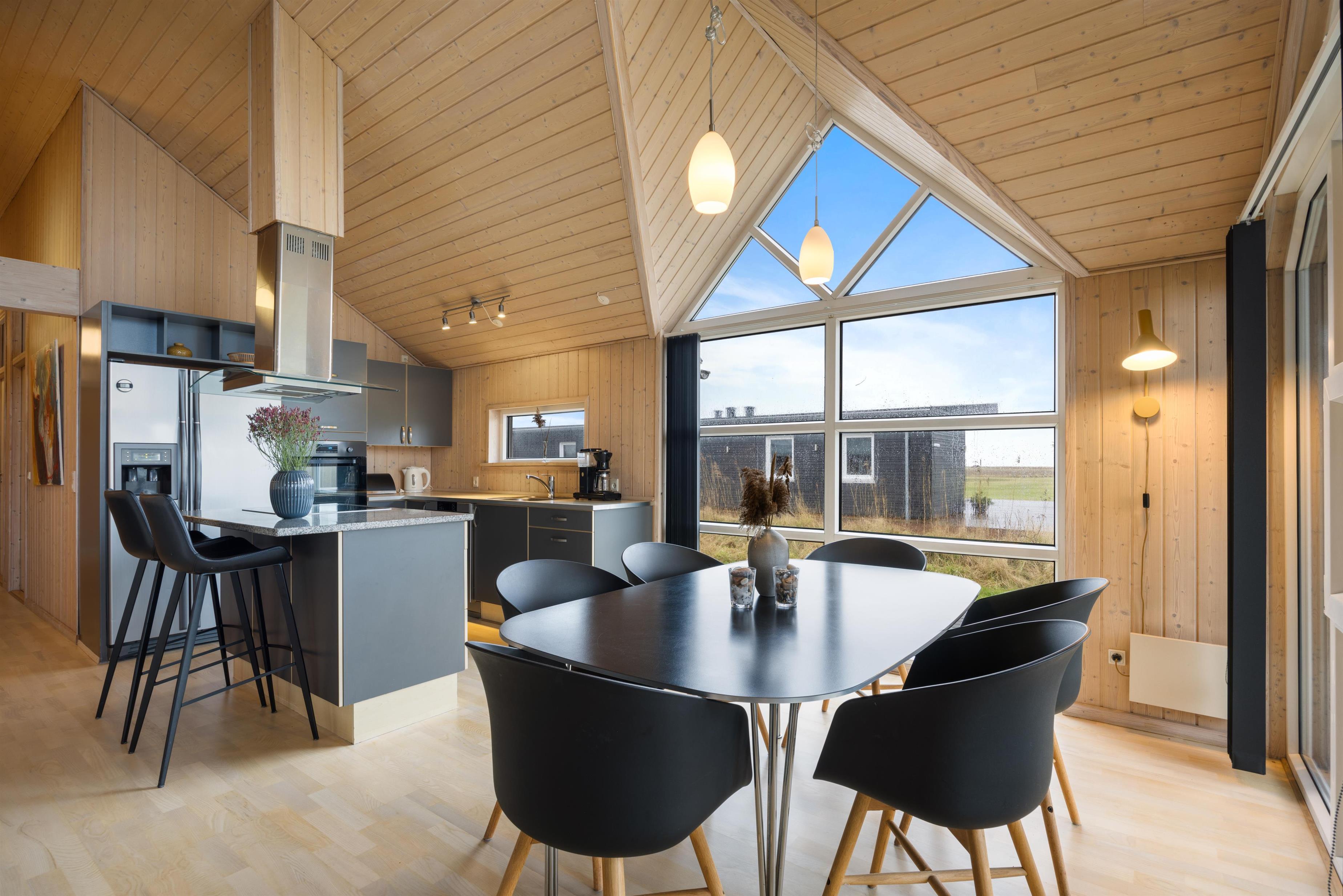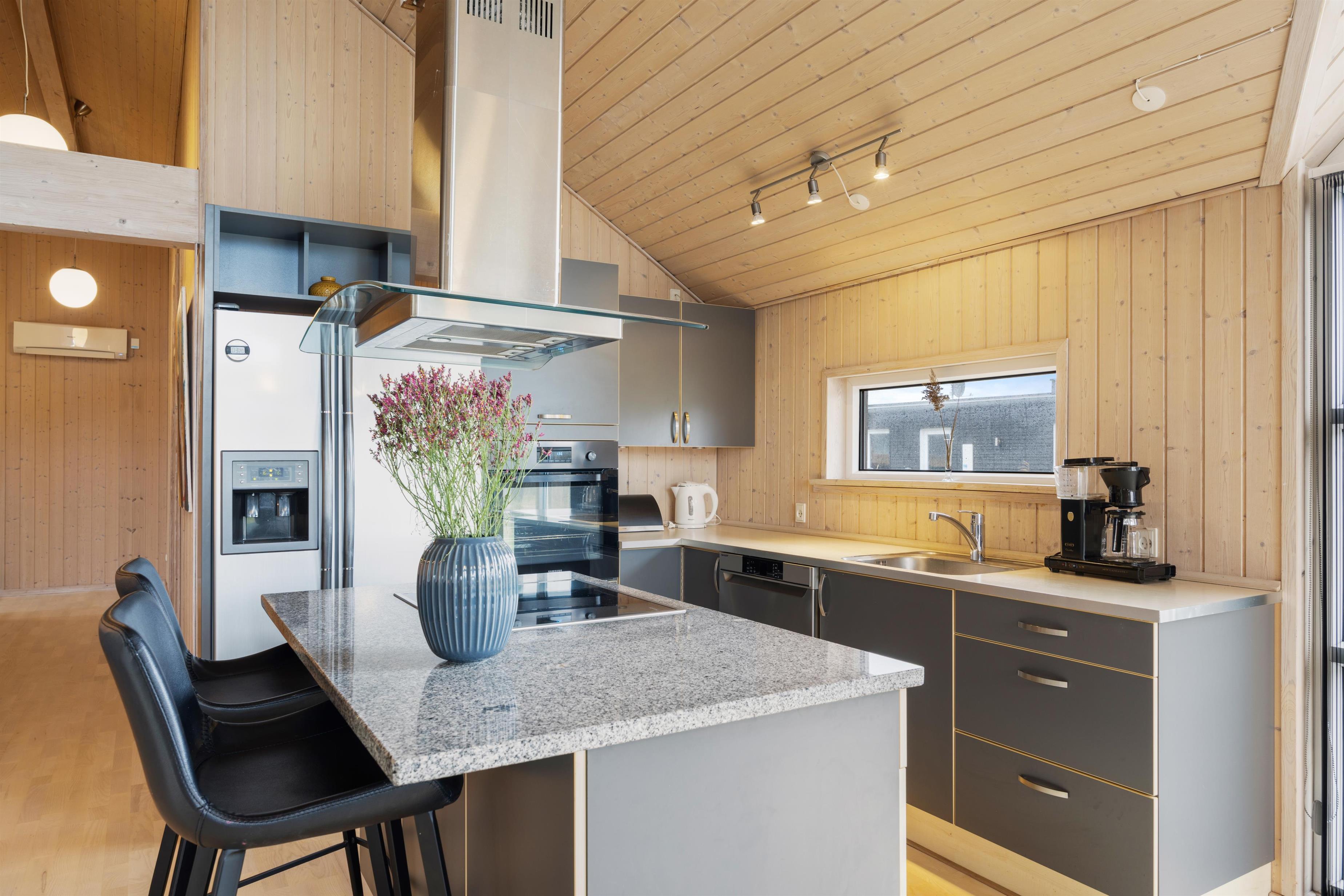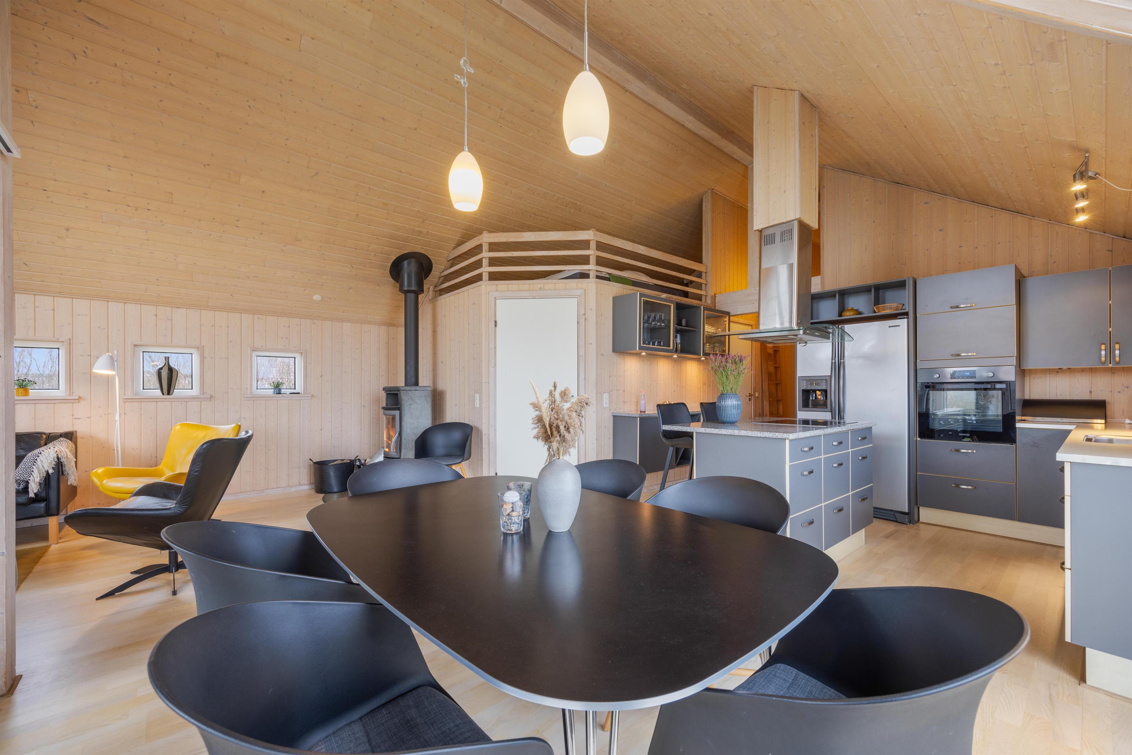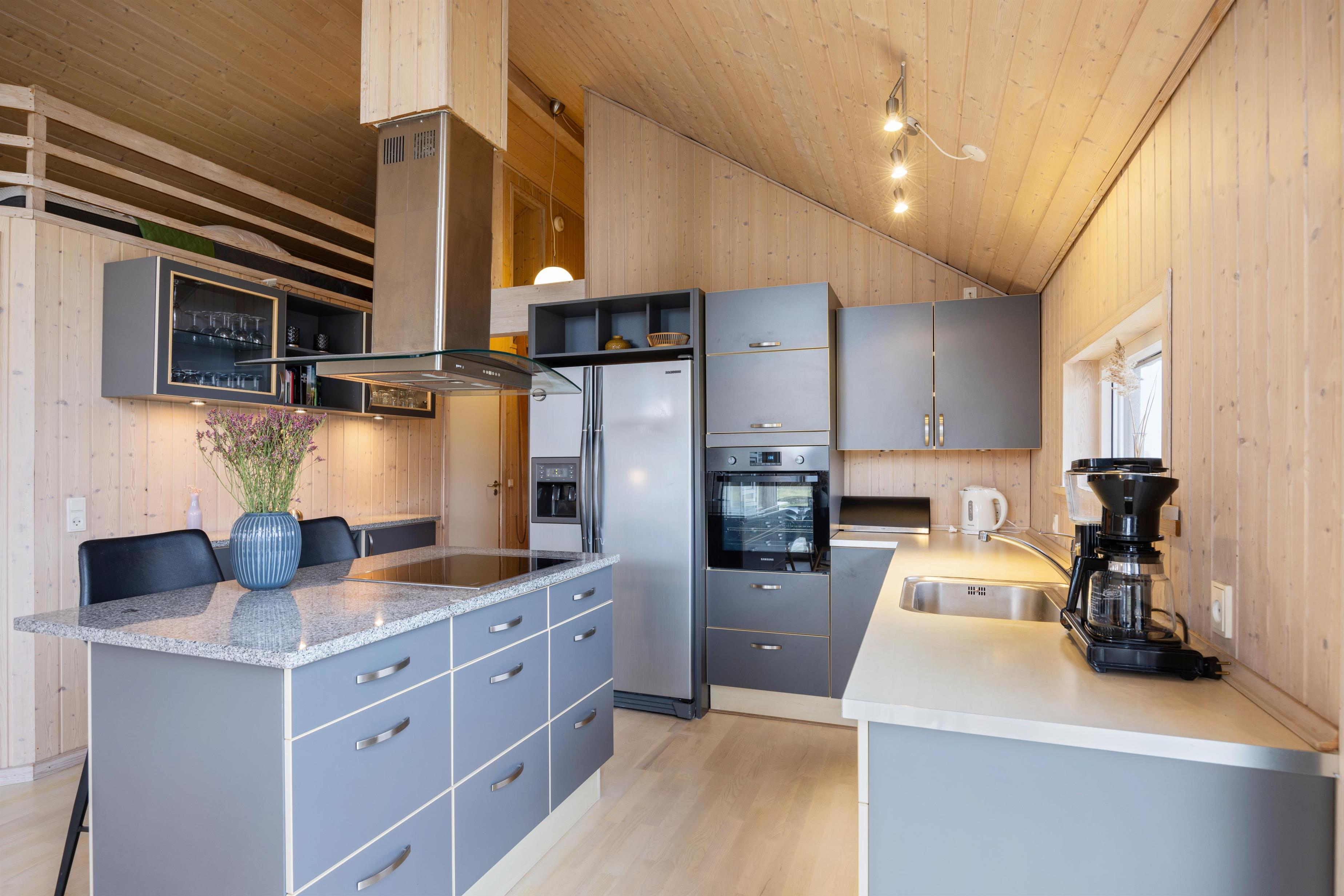 På Laust Diges Vej 33 føler man sig hjemme straks, man træder ind i det lyse og venlige sommerhus. Det åbne køkken med spiseplads og opholdsstue bliver det naturlige samlingssted for jer. Her er lyse vægge, lofter op i kip og et fint lysindfald igennem de brede vinduespartier og arkitektoniske detaljer. Her kan du gå til og fra madlavningen og kogeøen, imens du er i dialog med dem, som sidder ved spisebordet og dem, som slapper af og nyder udsigten i sofagruppen. Køkkenet indeholder alt, hvad I behøver til at forkæle hinanden med lækre hjemmelavede måltider, også et stort amerikanerkøleskab med koldt vand og isterninger. Lystfiskerne blandt jer vil sætte pris på den separate fryser på 200 l – her kan nok være en fisk eller to. I regn og rusk kan I tænde op i brændeovnen og nyde ilden og varmen fra brændeknuderne.