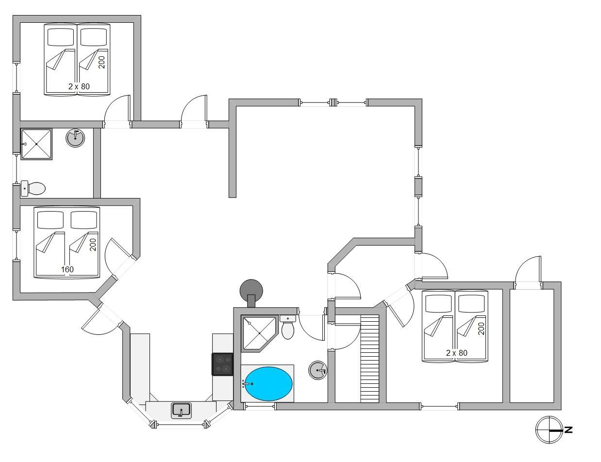 Feriehusets tre soveværelser har behagelige trægulve og to af værelserne har dobbelsenge og det tredie værelse har to enkelt senge.