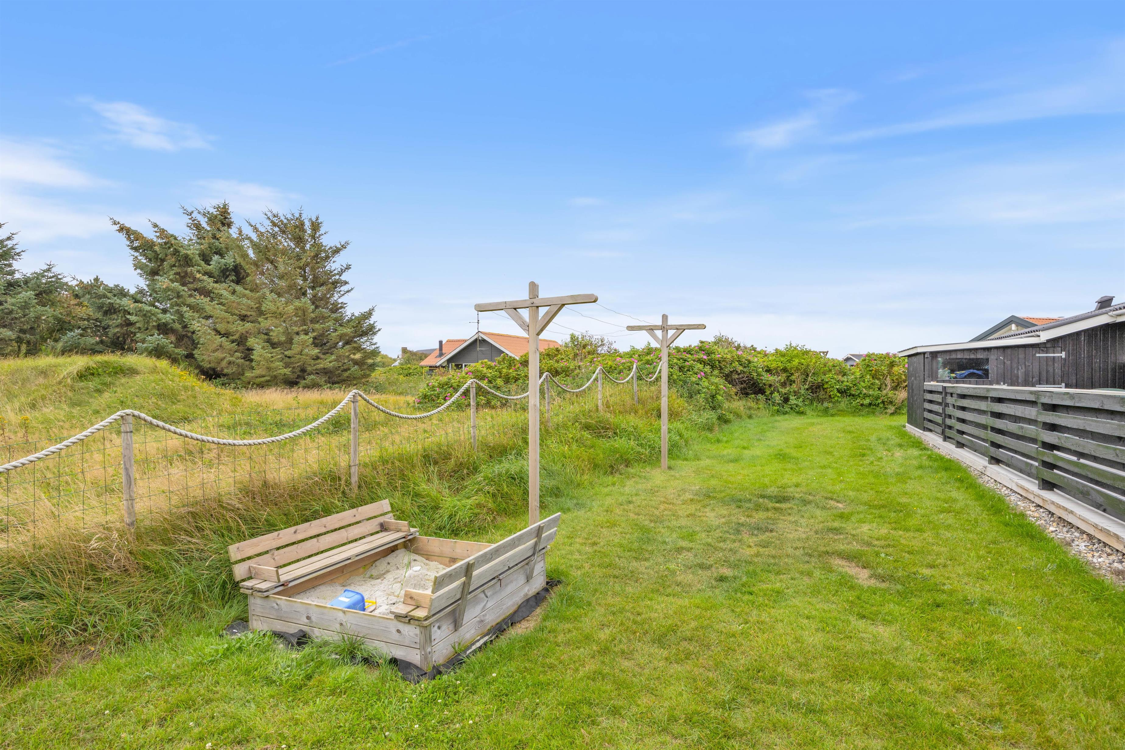 På den østlige og sydlige side af feriehuset er der bygget en lukket terrasse, som er særlig praktisk med små børn eller hunde. På øst siden kan I spise morgenmad i solskinnet om morgenen. I løbet af dagen kan I dase på liggestolene med en god bog og noget koldt at drikke, mens børnene leger i sandkassen eller spiller bold på græsplænen. Luk en god flaske vin op, smid noget lækkert på grillen og slut aftenen af med et spil kongespil; den perfekte sommeraften.