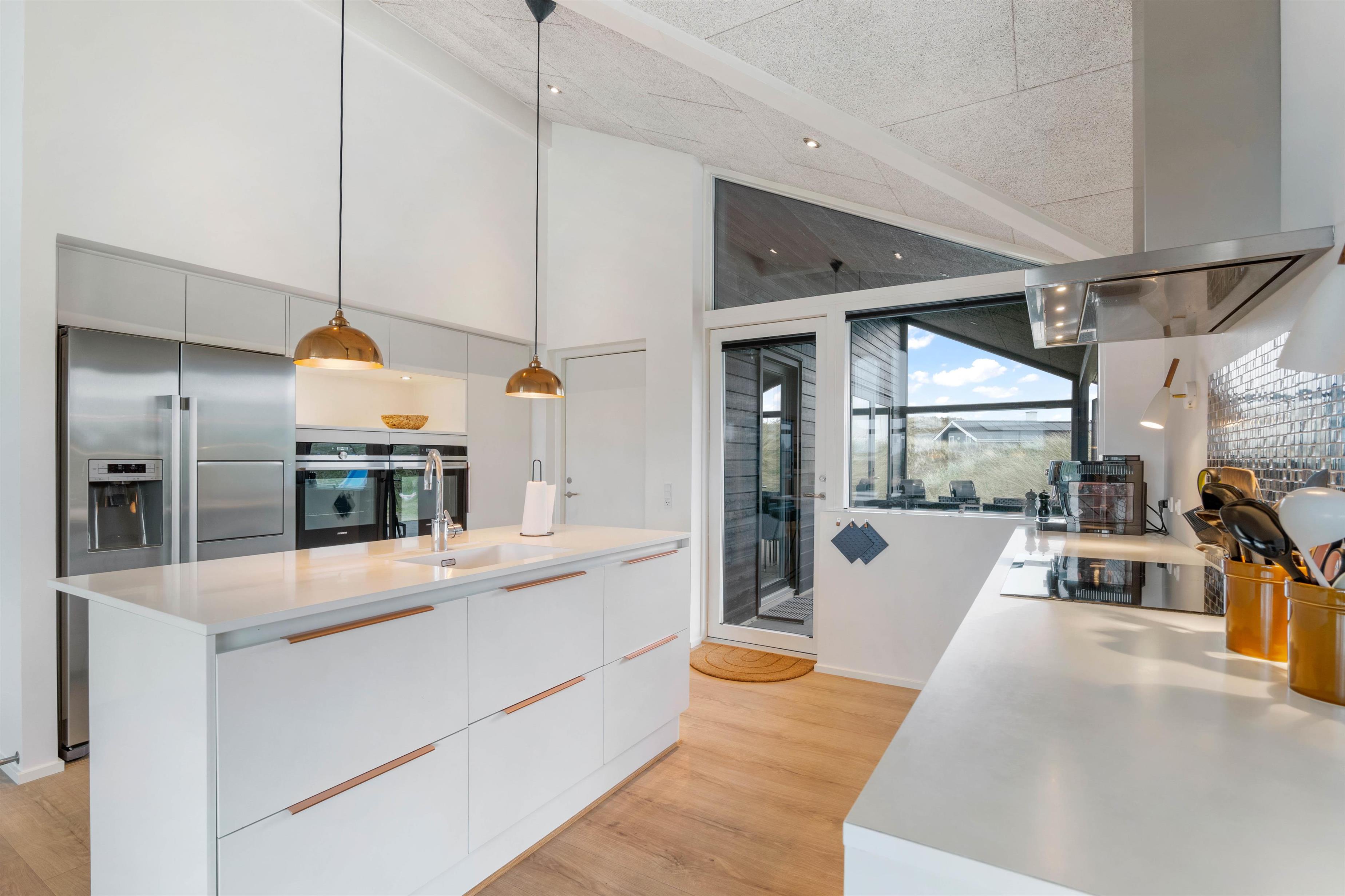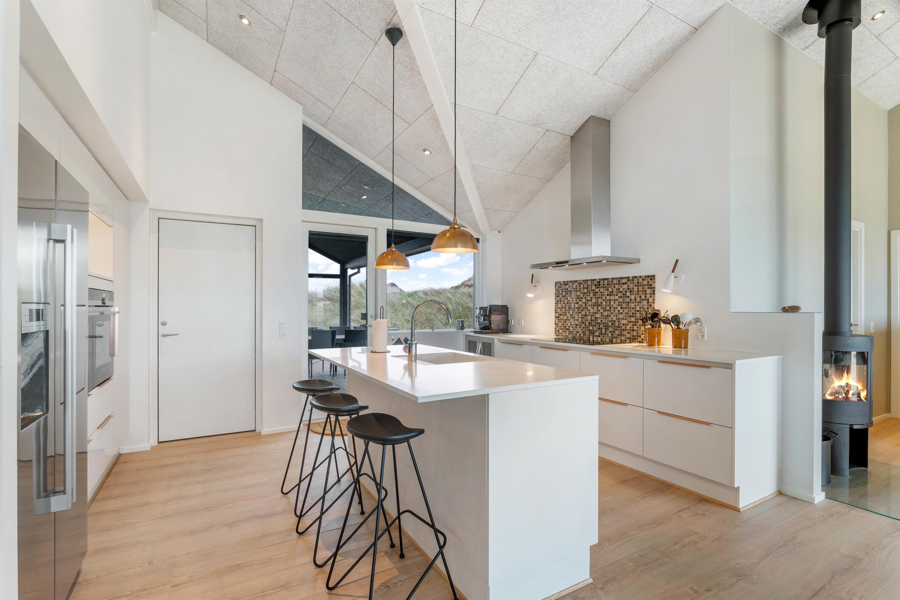 Køkkenet er veludstyret med 2 opvaskemaskiner, 2 ovne, fuldautomatisk kaffemaskine, vinkøler samt amerikanerkøleskab og en ekstra, lille fin detalje i sommerhuset er det gennemgående musikanlæg fra Sonos, som findes I alle rum.