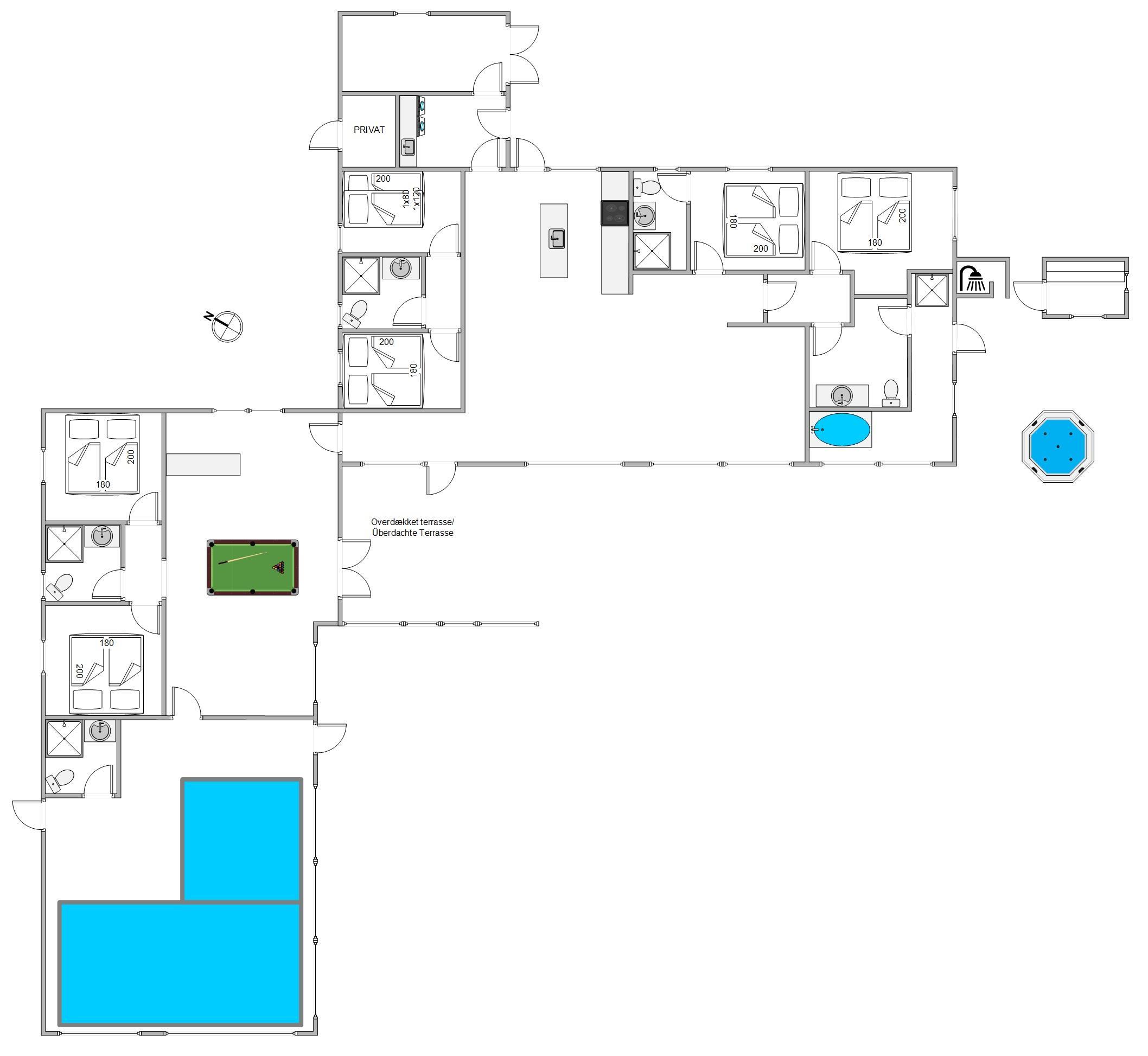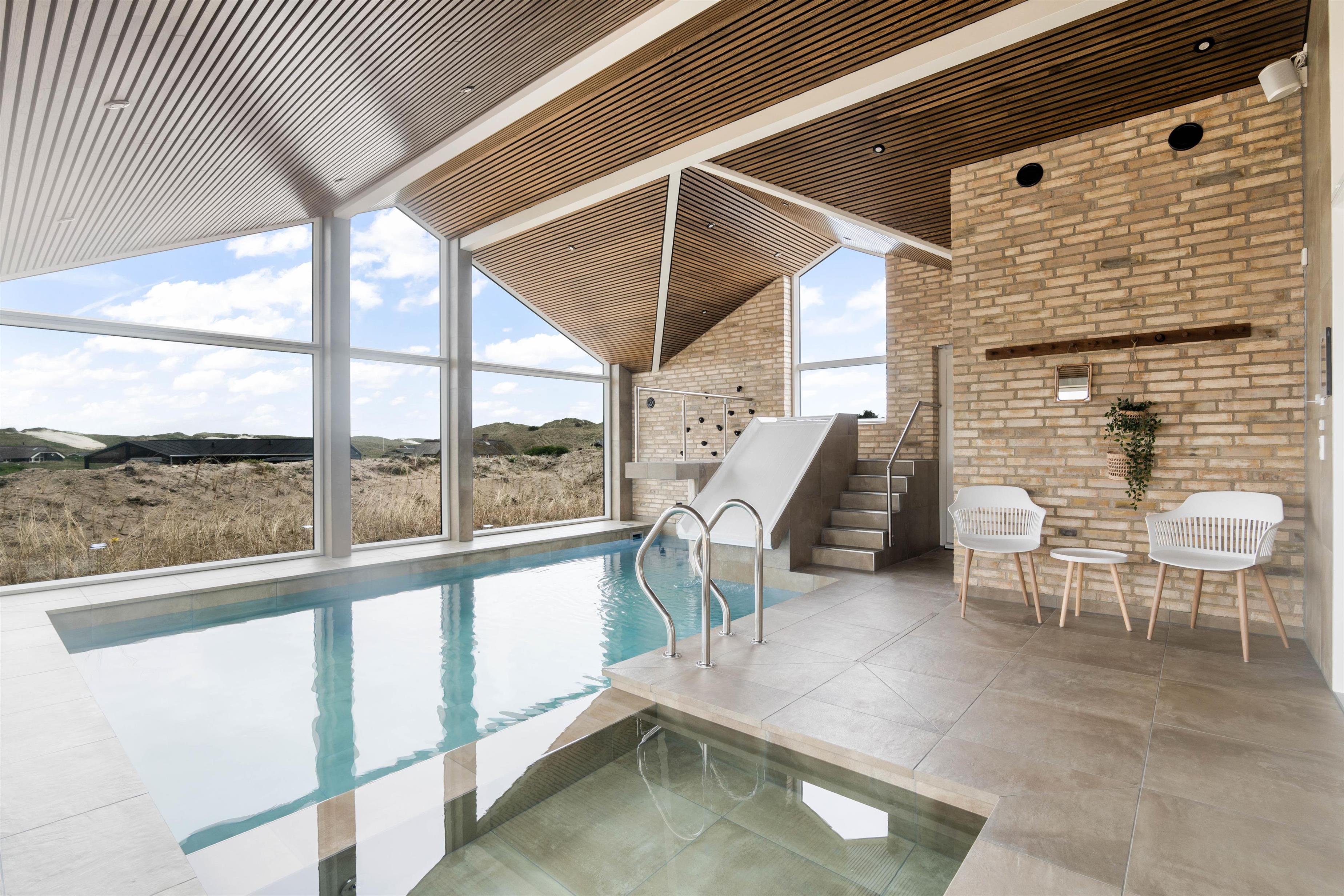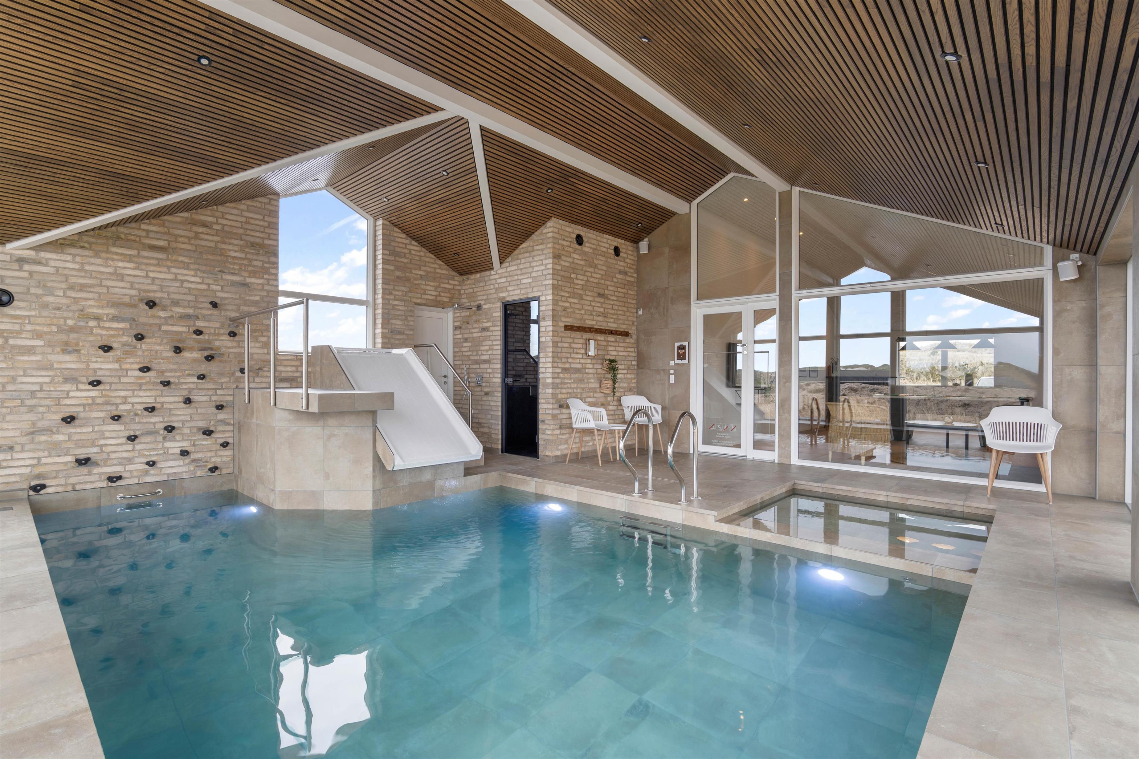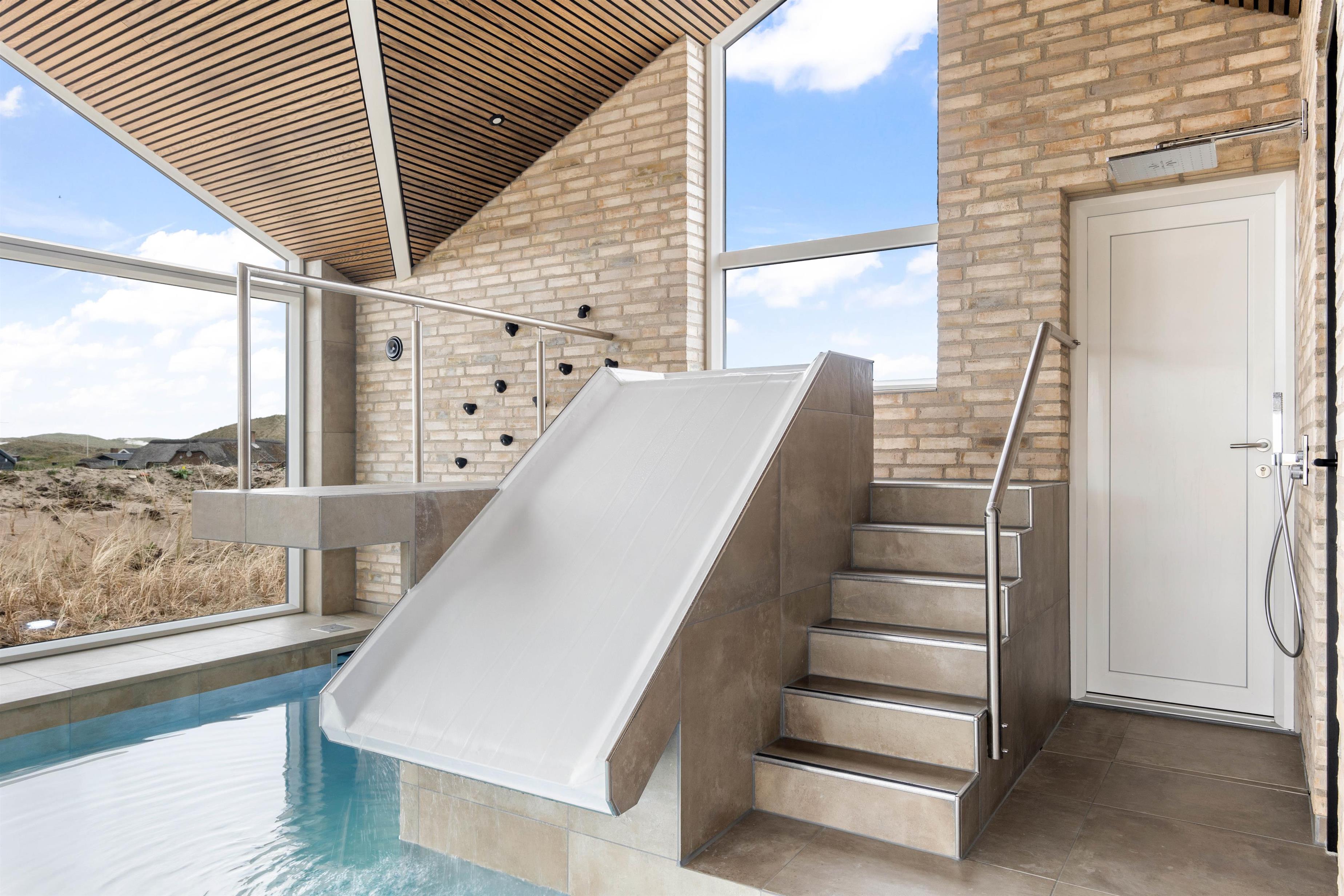 Et af sommerhusets absolutte highlights er det fine poolrum, hvor hele familien kan få mange timer til at gå. Den 29 m2 store pool er opdelt i 2, hvoraf den ene er en børnepool til familiens yngste. Poolen har modstrømsanlæg, og her er desuden både klatrevæg, vippe og rutsjebane til poolen.