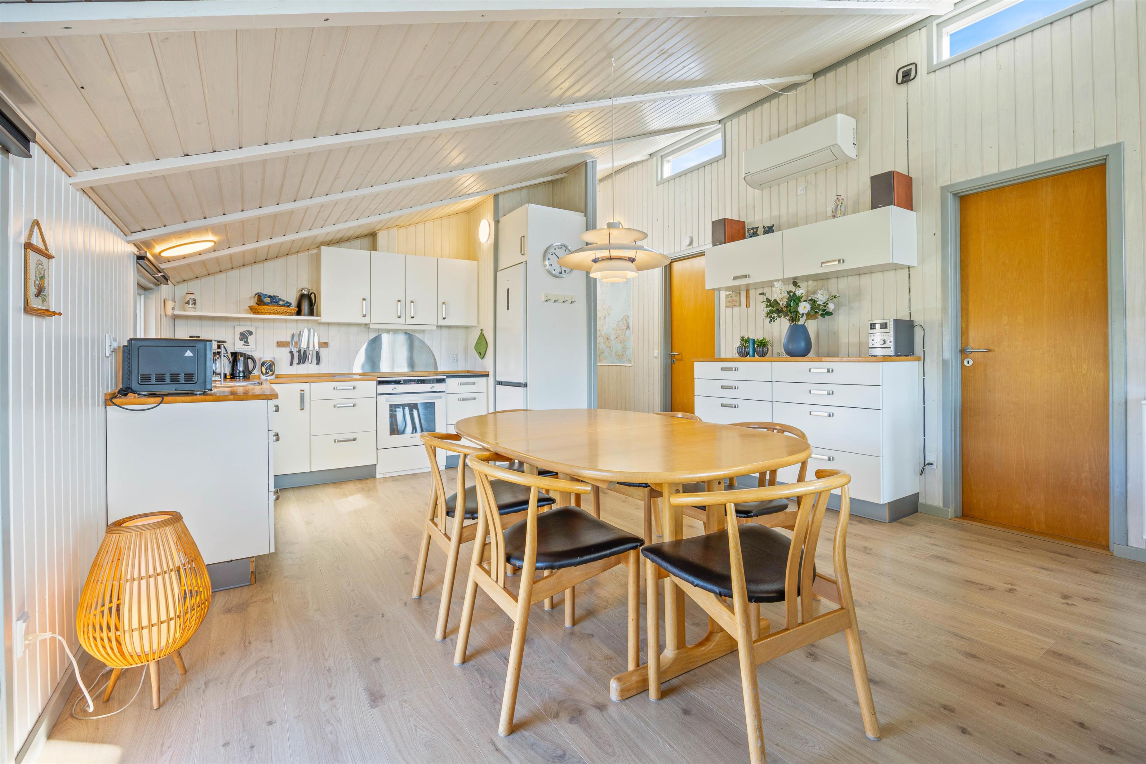 Indenfor føler man sig velkommen i det åbne køkken/alrum og opholdsstue med hvidmalede træpaneler og lofter og fine lysindfald. Køkkenet indeholder både induktionskomfur, opvaskemaskine og en separat fryser på 100 liter, og her finder I alt, hvad I behøver for at forkæle hinanden med lækre hjemmelavede måltider. Senere kan I hygge jer i hinandens selskab ved ilden i brændeovnen imens mørket falder på. Med Chromecast kan I streame jeres yndlingsserier direkte fra jeres enheder.