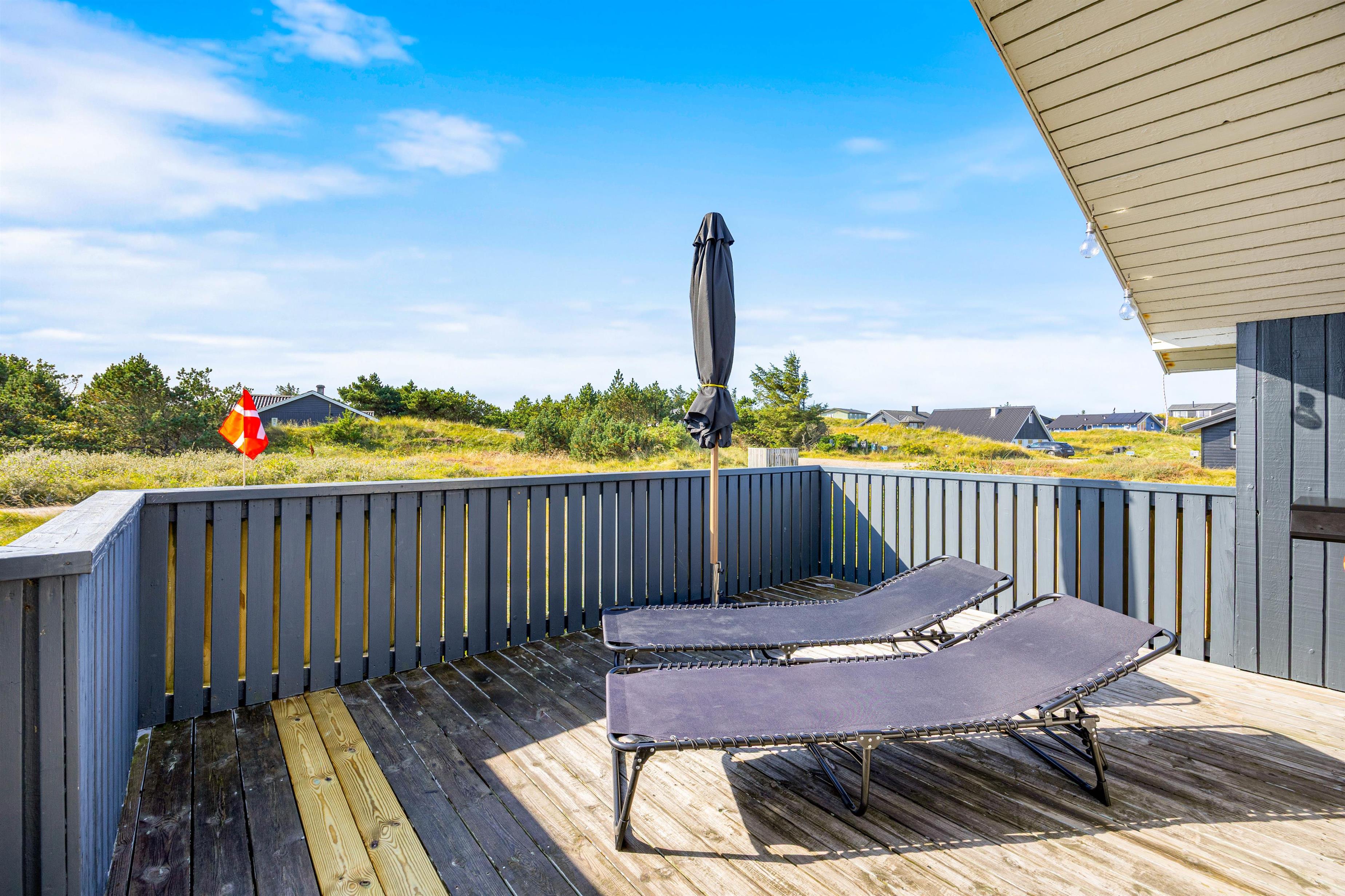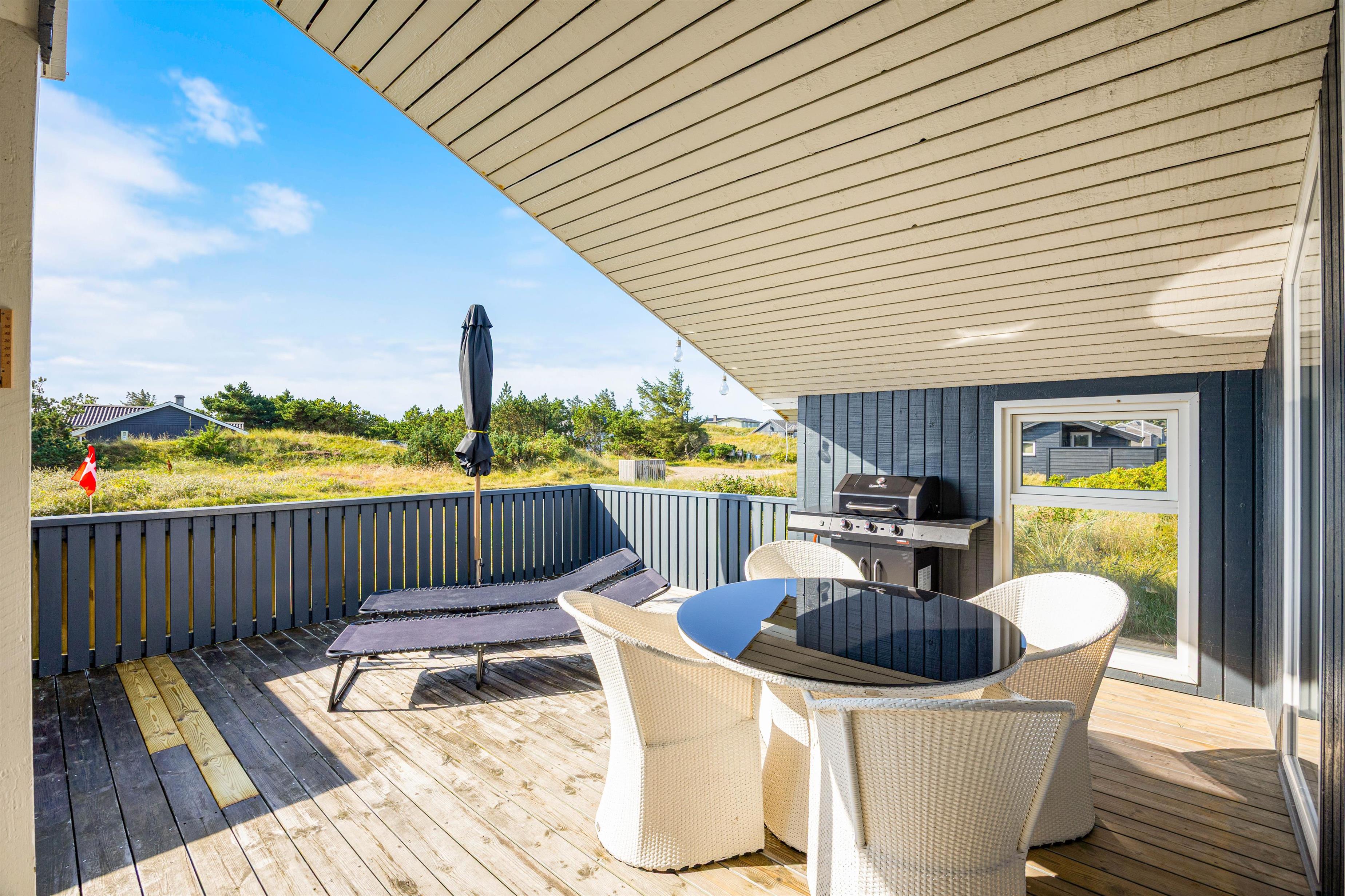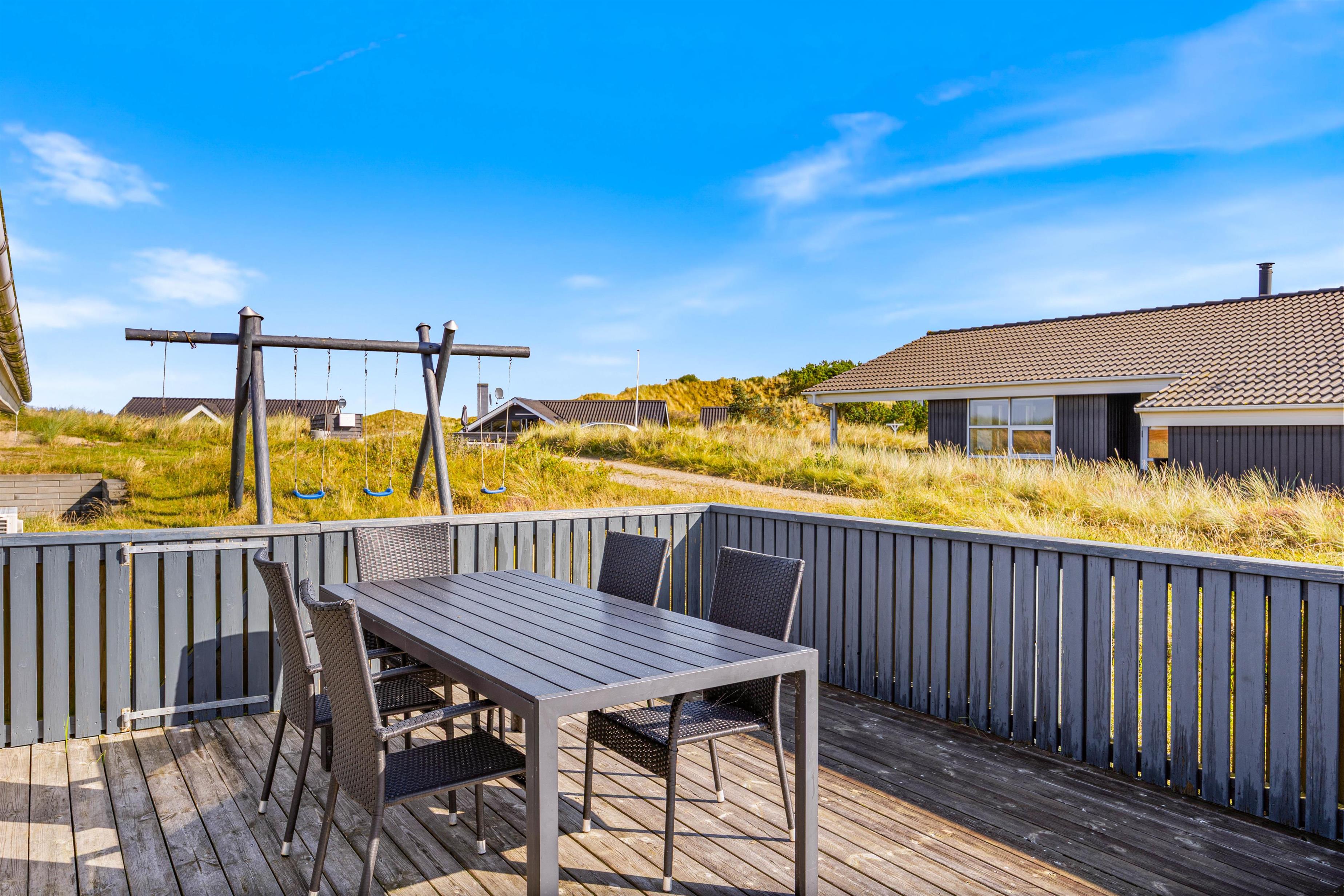 På den lukkede, afskærmede terrasse med havemøbler kan I nyde en solrig morgen eller en stille aften udenfor. Den overdækkede del af terrassen gør det altid muligt at opholde sig udendørs. Tænd op i gasgrillen og nyd et lækkert grillmåltid sammen, imens skyggerne bliver lange. Familiens yngste kan gynge i haven, indtil maden bliver færdig. Bagefter kan I gå en frisk tur til stranden og opleve solnedgangen i Vesterhavet.