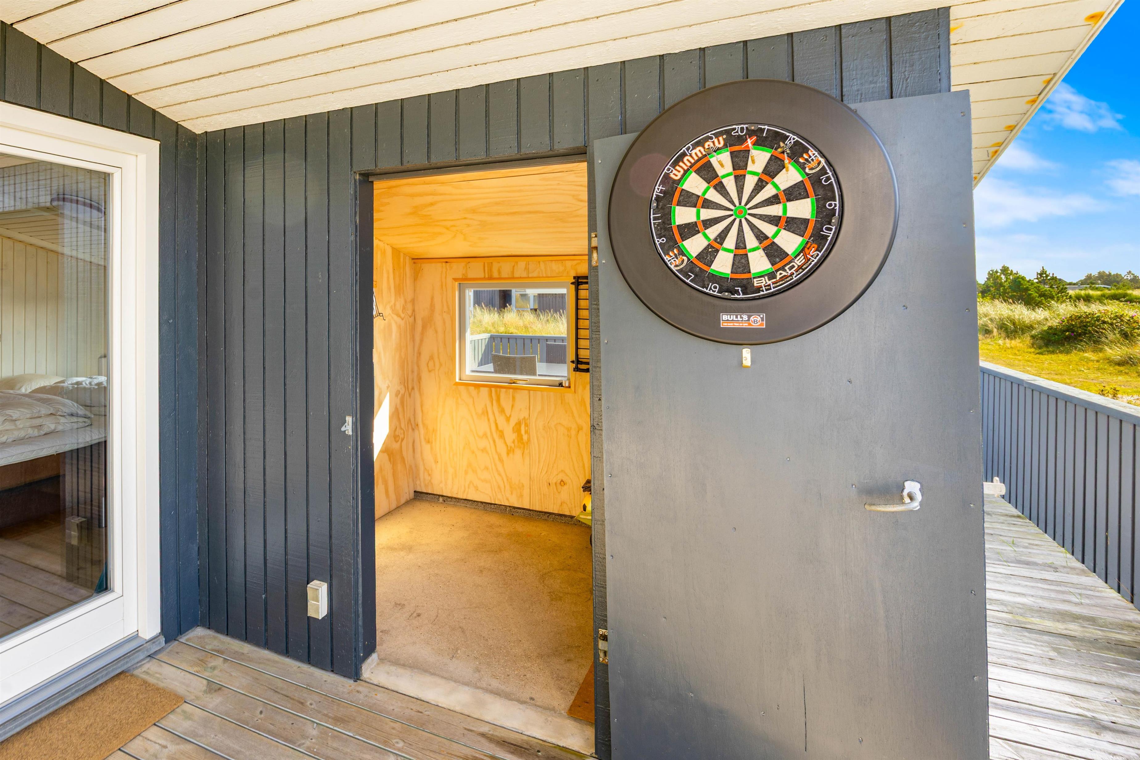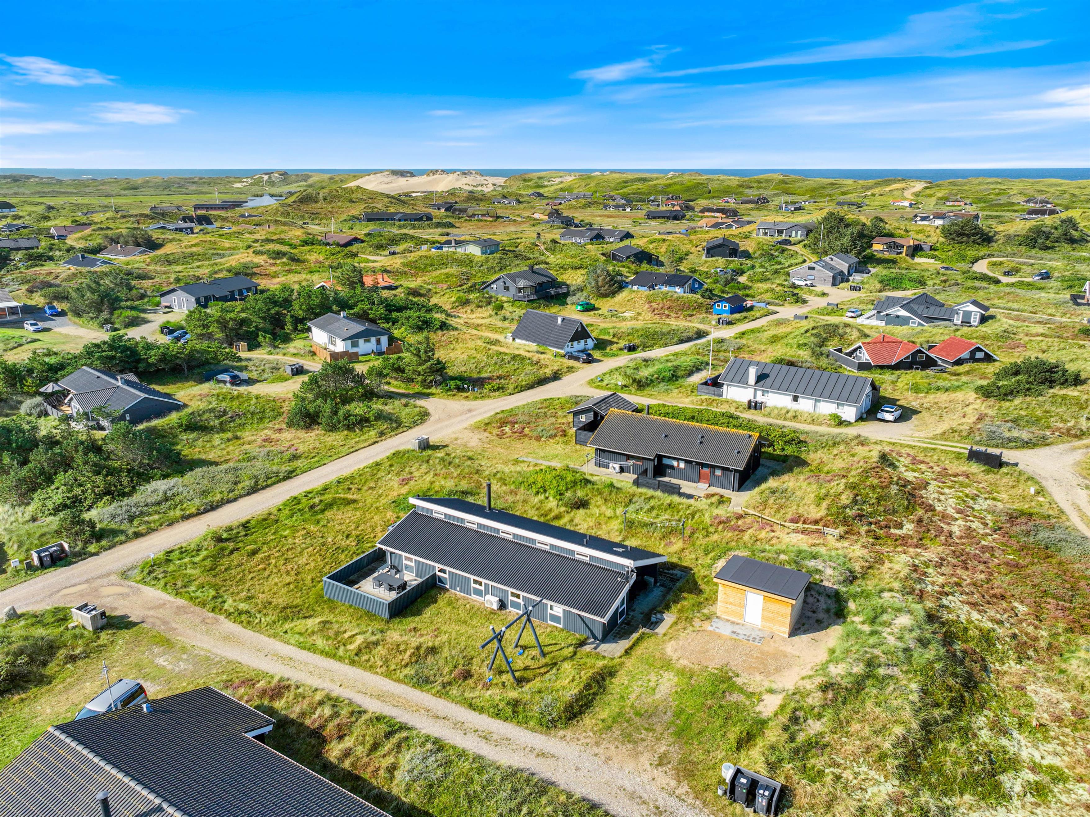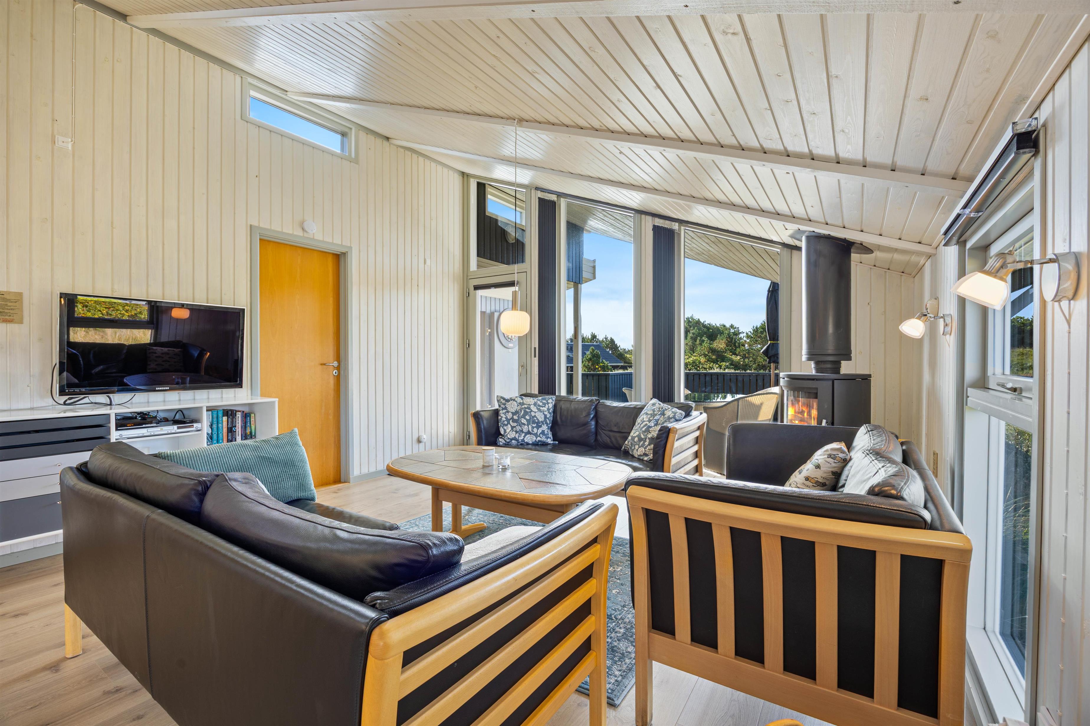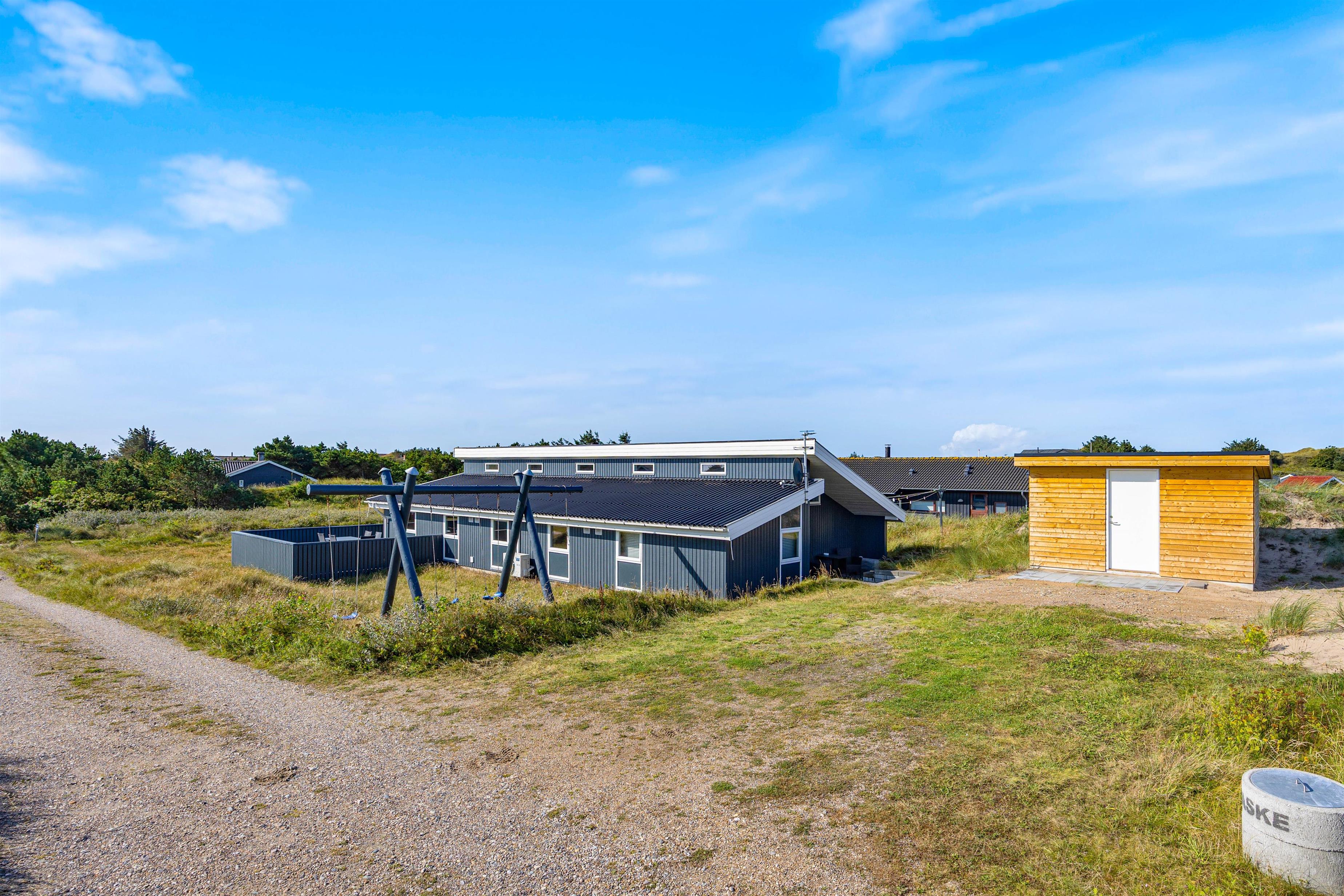På den lukkede, afskærmede terrasse med havemøbler kan I nyde en solrig morgen eller en stille aften udenfor. Den overdækkede del af terrassen gør det altid muligt at opholde sig udendørs. Tænd op i gasgrillen og nyd et lækkert grillmåltid sammen, imens skyggerne bliver lange. Familiens yngste kan gynge i haven, indtil maden bliver færdig. Bagefter kan I gå en frisk tur til stranden og opleve solnedgangen i Vesterhavet.