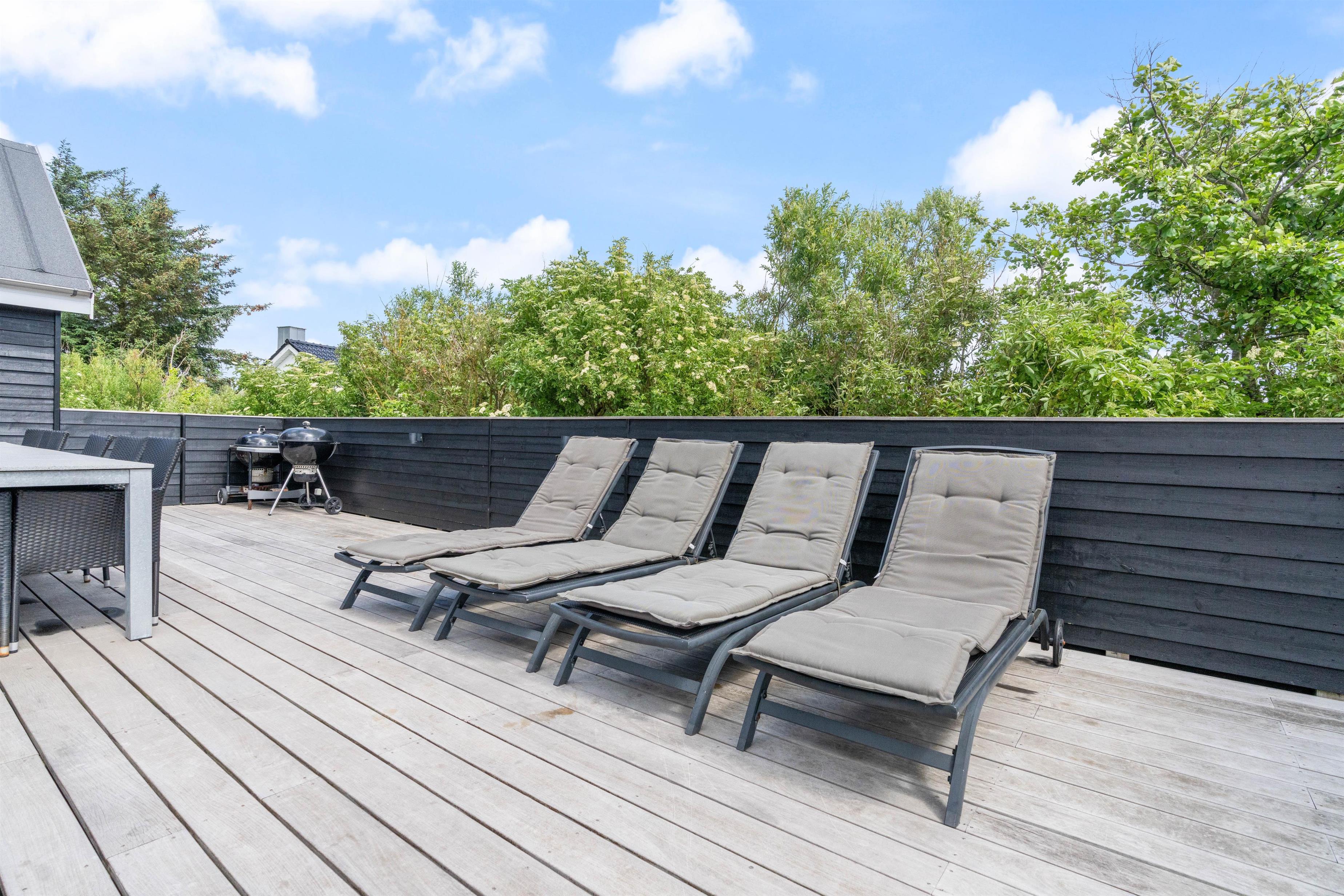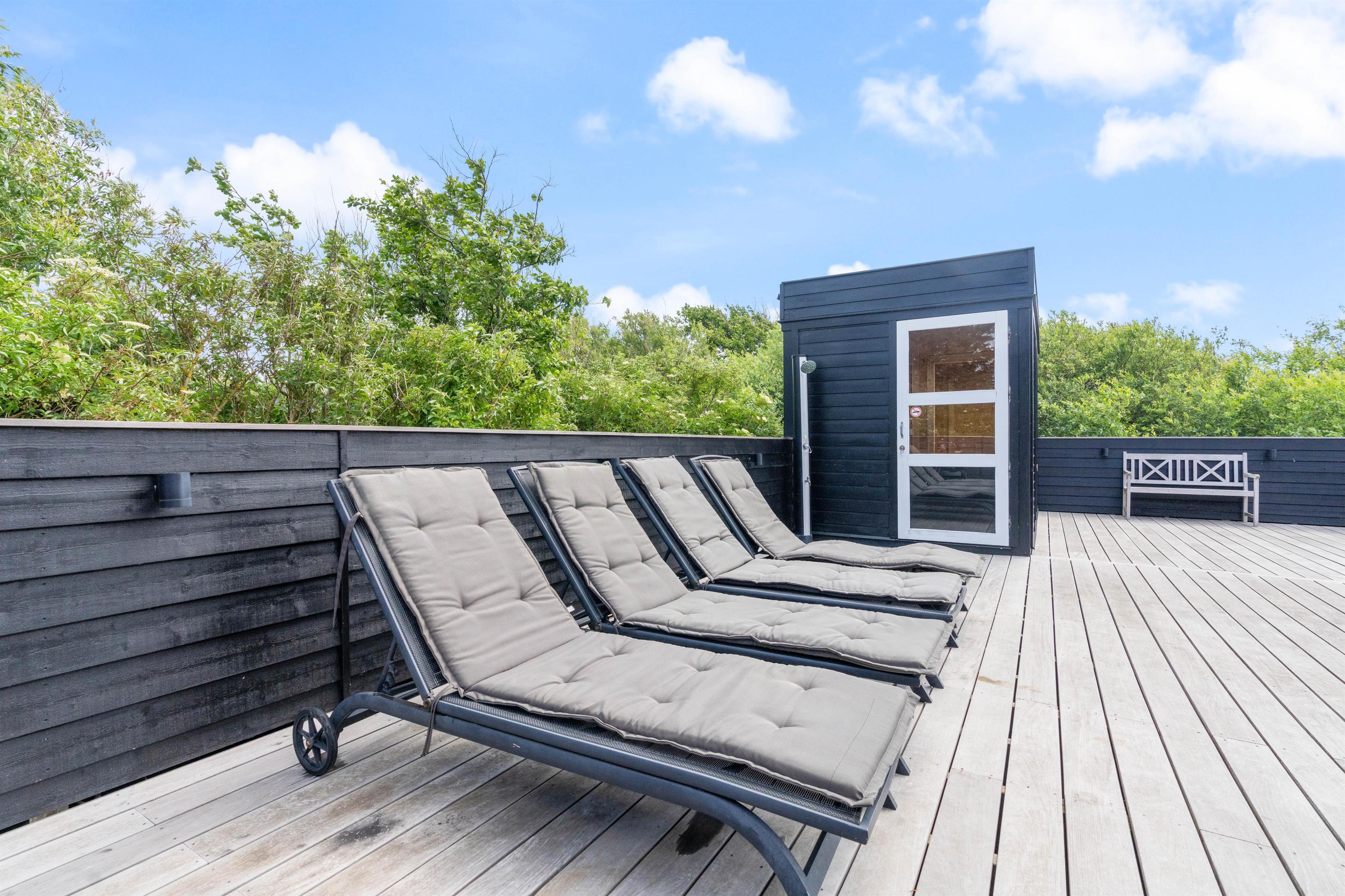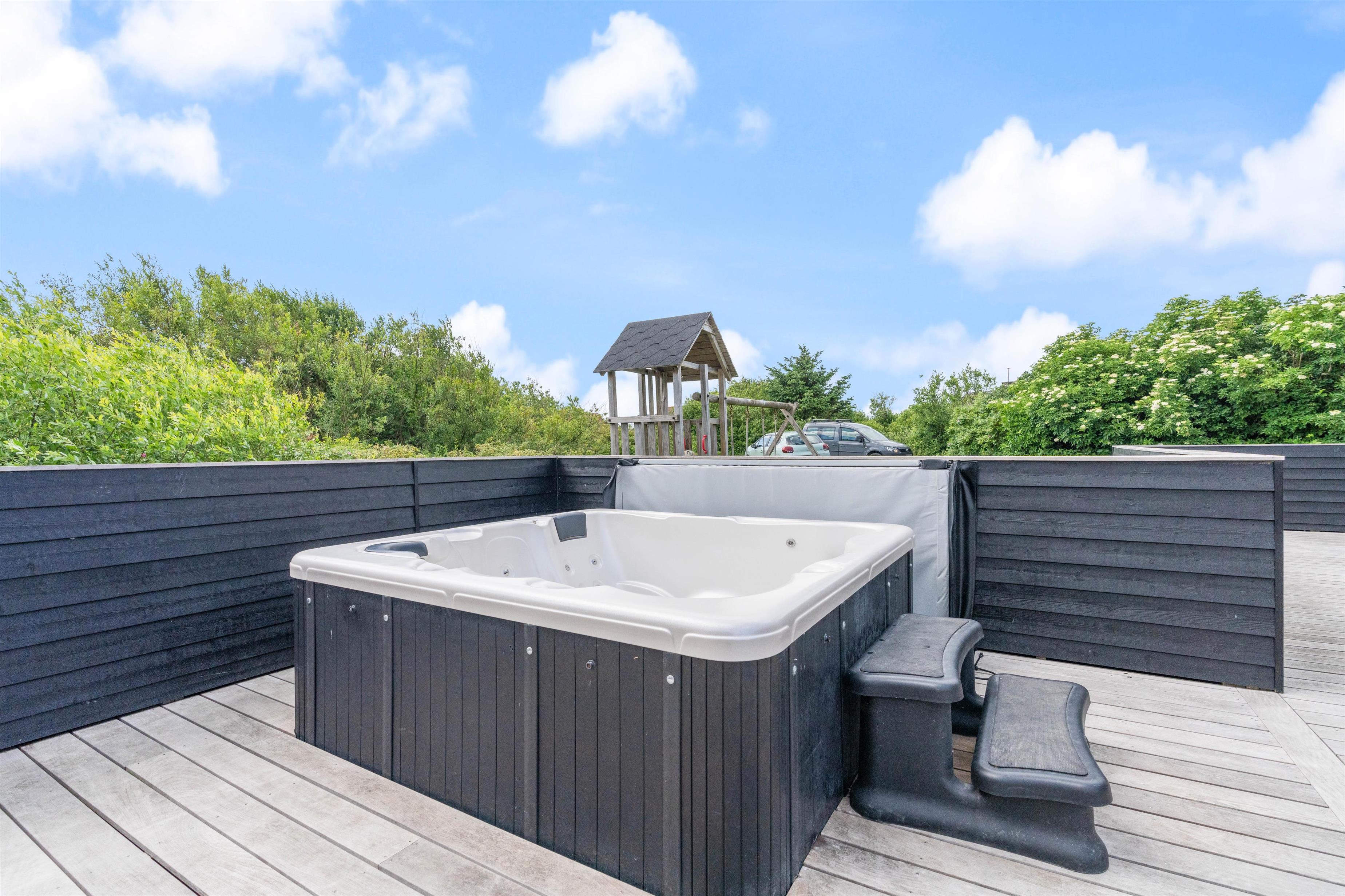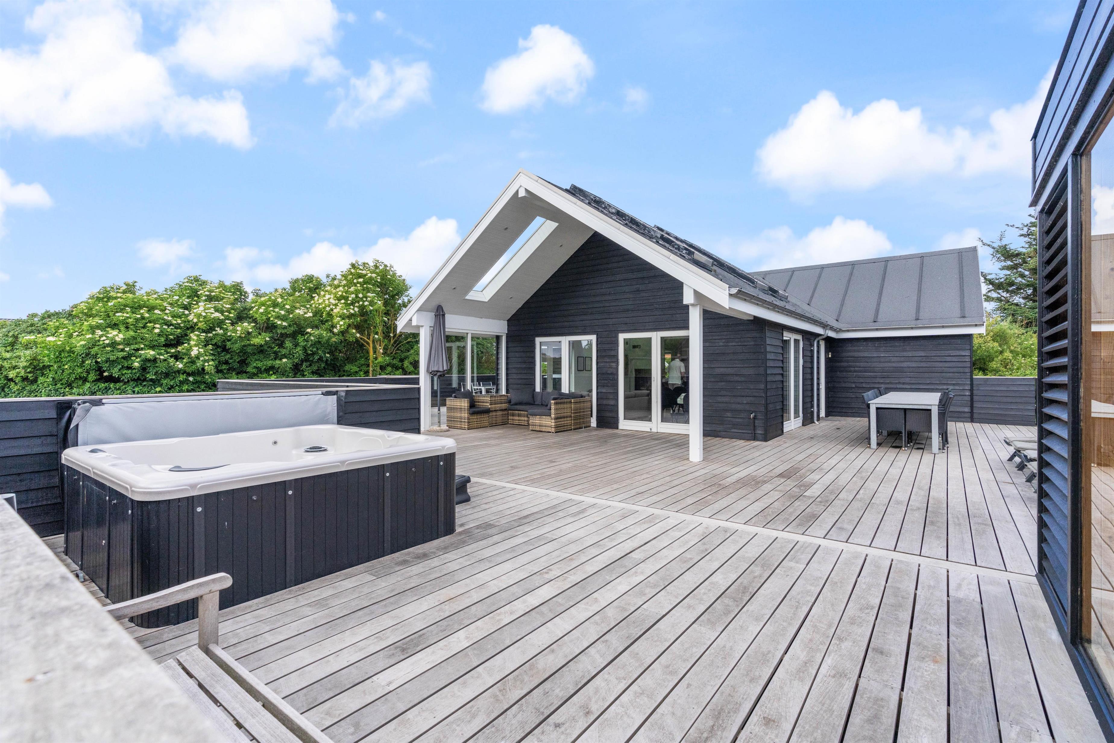 Den hyggelige stil fortsætter også udenfor - på den store, delvist overdækkede terrasse venter jer endnu mere. Her er der både udendørs spabad, en stor udendørs sauna og en udebruser, hvor I kan skylle sandet af fødderne efter en gåtur på stranden. Udebruseren kan bruges fra april til november.